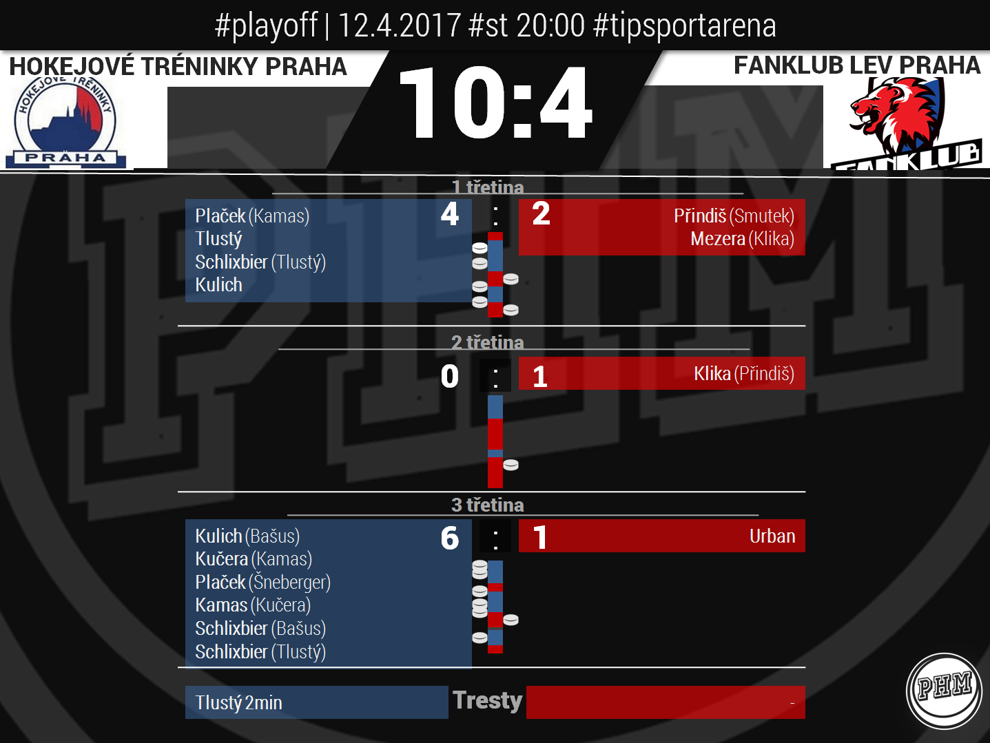 Lev se probojoval do Play-off dramatickým soubojem a hráči si tak vážili účasti v semifinále a byli rozhodnutí i proti jasnému favoritovi zahrát pěkný hokej. Hokejové Tréninky Praha nenechaly nic náhodě a stratég Plaček umíchal hvězdnou sestavu. Tým posílil bezmála pětisty souboji v NHL ostřílený Jirka Tlustý, další profesionál Frank Kučera a Jaroslav Hertl, ale objevily se již známé tváře v PHM Cupu jako Kamas, Gondek nebo Poloch. Semifinále tak přineslo konfrontaci zajímavou. Na jedné straně několik hráčů, kteří cca před pěti lety začali poprvé bruslit v plné výstroji (Fanklub Lev Praha), proti hráčům, kteří se hokejem živili (HTP) . Lev měl dobrou sestavu a věděl jak hrát proti tak silnému výběru. Silné obranné dvojice Adamec, Šimek, posily Přindiš s Magulou a Lvi ze Světlé nad Sázavou Jelínek s Holcmanem se museli hned od počátku pěkně otáčet.