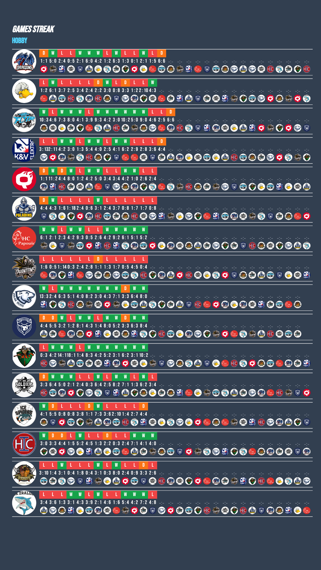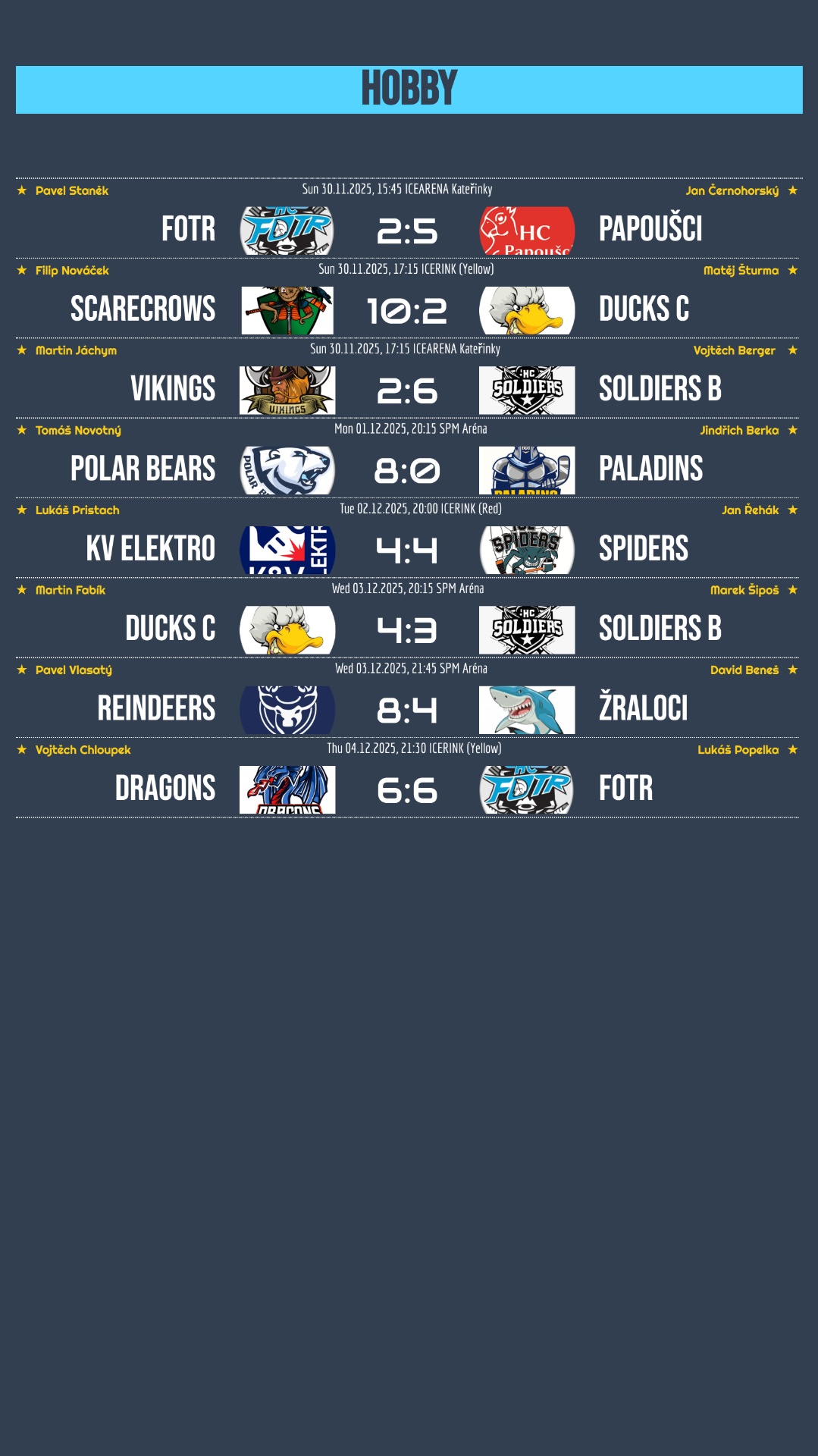 Hobby divize dál potvrzuje, že patří k nejvyrovnanější divizi PHM Cupu. Mezi jednotlivými celky jsou minimální bodové rozestupy a každé vítězství může tabulku rychle promíchat. HC Fotr tentokrát zaváhal a ze dvou utkání vytěžil pouze bod, což jej v těsné konkurenci může mrzet. Naopak cenný skalp si připsali hráči Ducks C, kteří v dramatické bitvě zdolali HC Soldiers B těsně 4:3! Výrazné vítězství tento týden slavili také HC Strašáci, AHA Reindeers či HC Polar Bears.