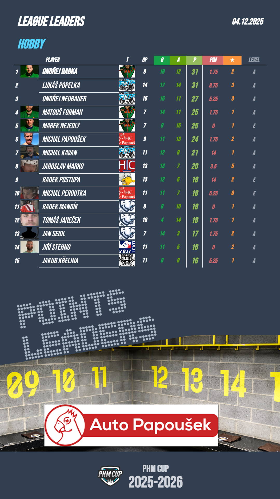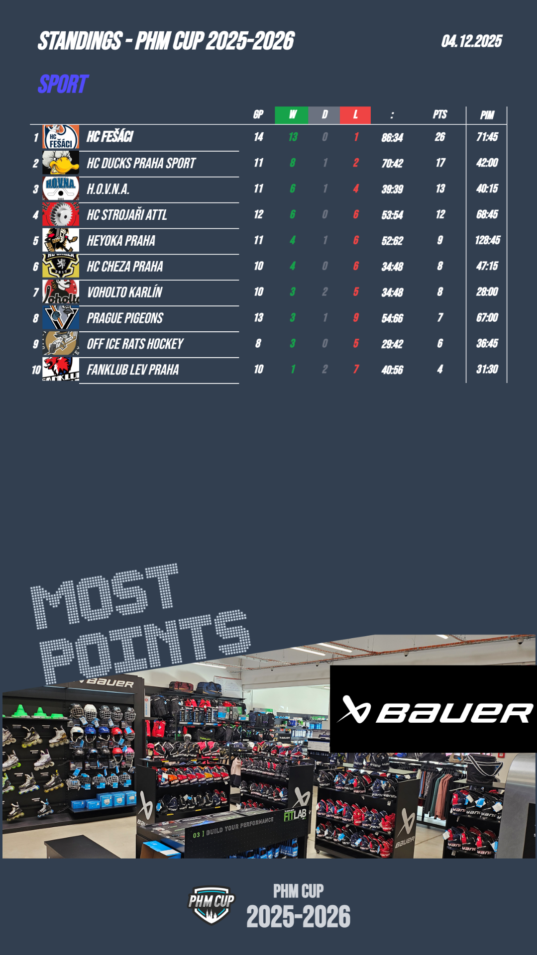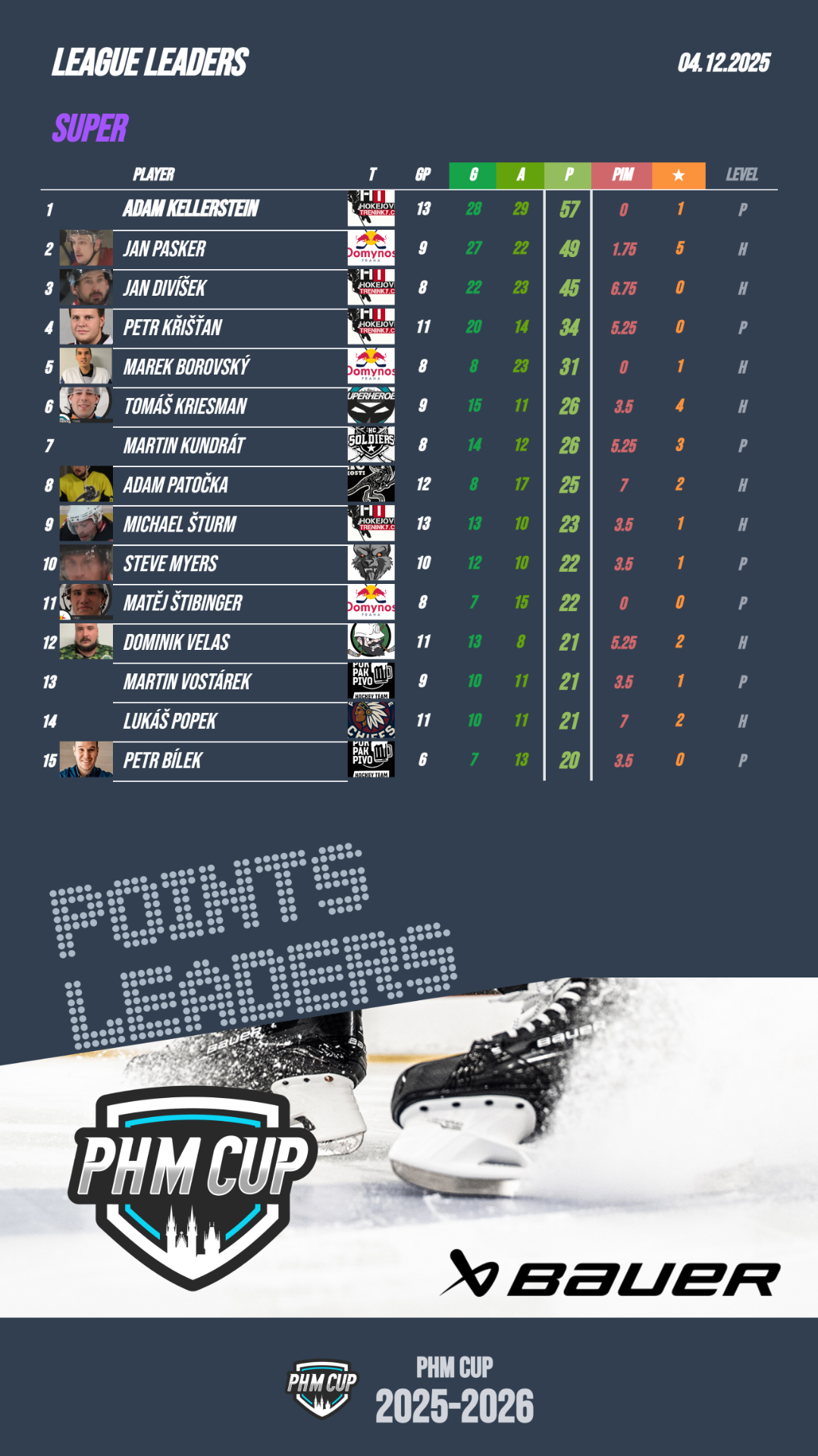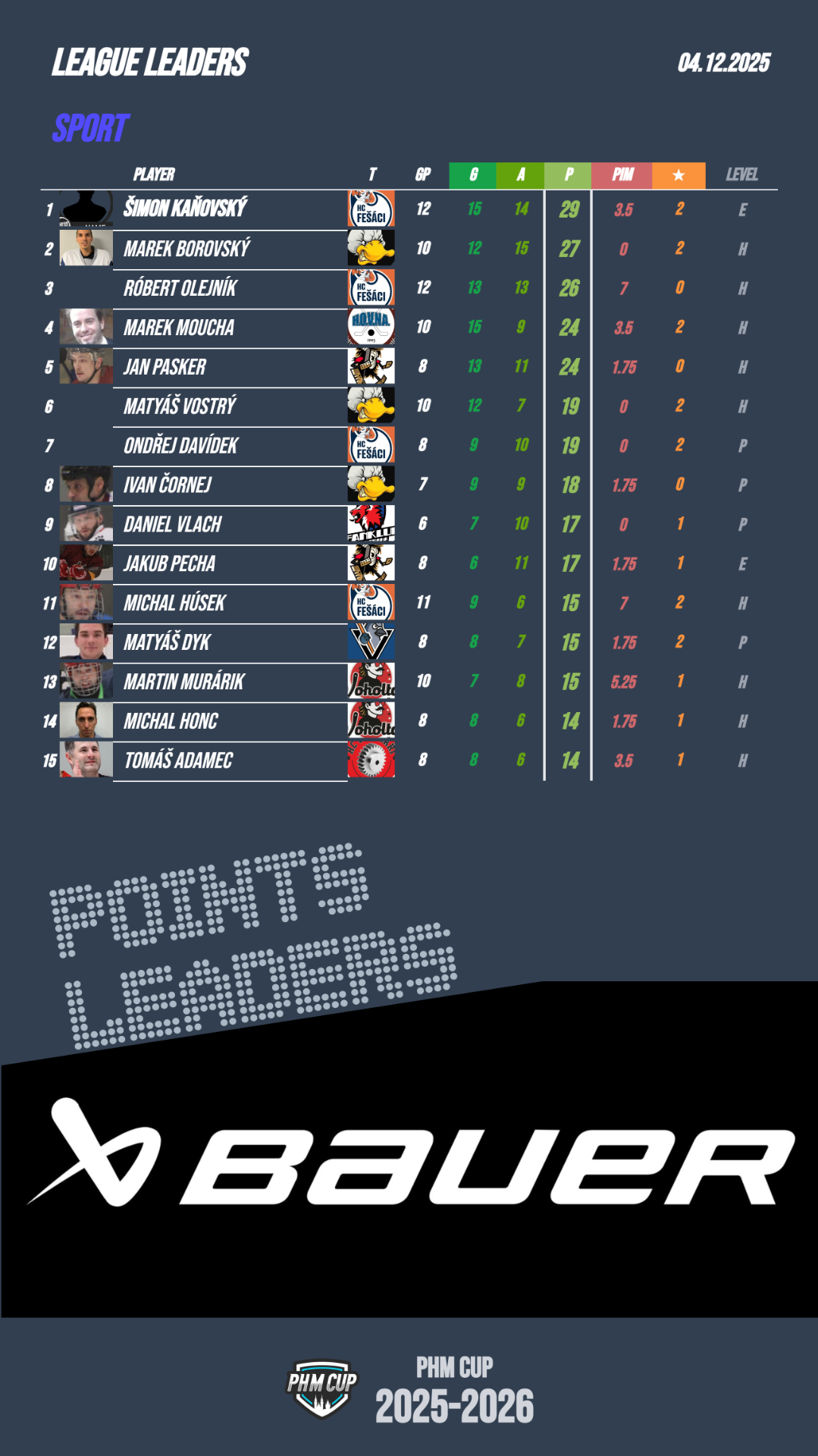 Prosinec začal ve velkém stylu a s ním i další porce zápasů v PHM Cupu. Týmy vstoupily do nového měsíce naplno a na ledě bylo znát, že před vánoční pauzou chce každý vytěžit maximum. Nechyběly zajímavé výsledky, překvapení ani výkony, které ovlivnily rozložení sil napříč divizemi.