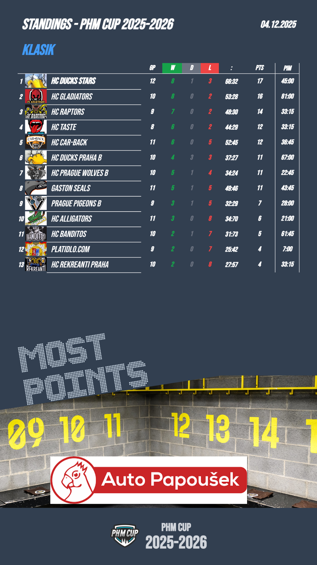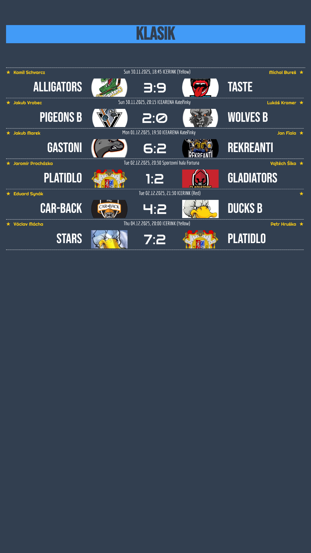 V KLASIK divizi pokračuje boj o přední příčky a každý bod hraje svou roli. HC Taste se díky solidnímu výkonu vyšplhali na 4. místo. Hráči HC Car-Back si polepšili na 5. pozici po důležitém vítězství 4:2! Druhé HC Gladiators se trápil v zápase s předposledním týmem tabulky Platidlo.com, zápas pro ně nebyl vůbec jednoduchý, ale nakonec si odvezli výhru 2:1! Důležitou výhru zaznamenalo také béčko Prague Pigeons, které porazilo rezervu HC Prague Wolves 2:0!