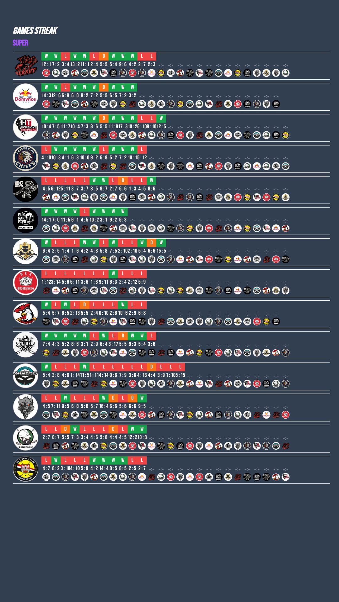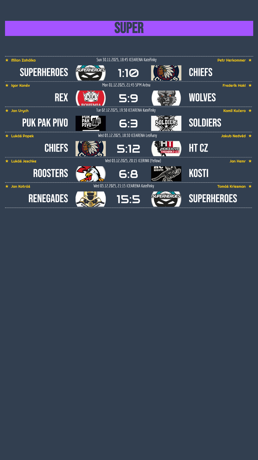 V SUPER divizi tento týden žádný tým nepřekvapil a většina zápasů se nesla ve znamení očekávaných výsledků. Prague Elite Chiefs, Hokejové tréninky a Golden Renegades si připsali vysoké výhry! Zajímavý průběh měl především souboj Hokejových tréninků proti Prague Elite Chiefs. Po většinu zápasu se držel vyrovnaný stav. Ještě v průběhu 3. třetiny bylo skóre 5:5. Pak ale přišla sedmigólová nadílka v podání Hokejových tréninků, čímž završili utkání 12:5 ve svůj prospěch! Ve vyrovnané bitvě nakonec HC Kosti dokázali udolat Roosters 8:6!