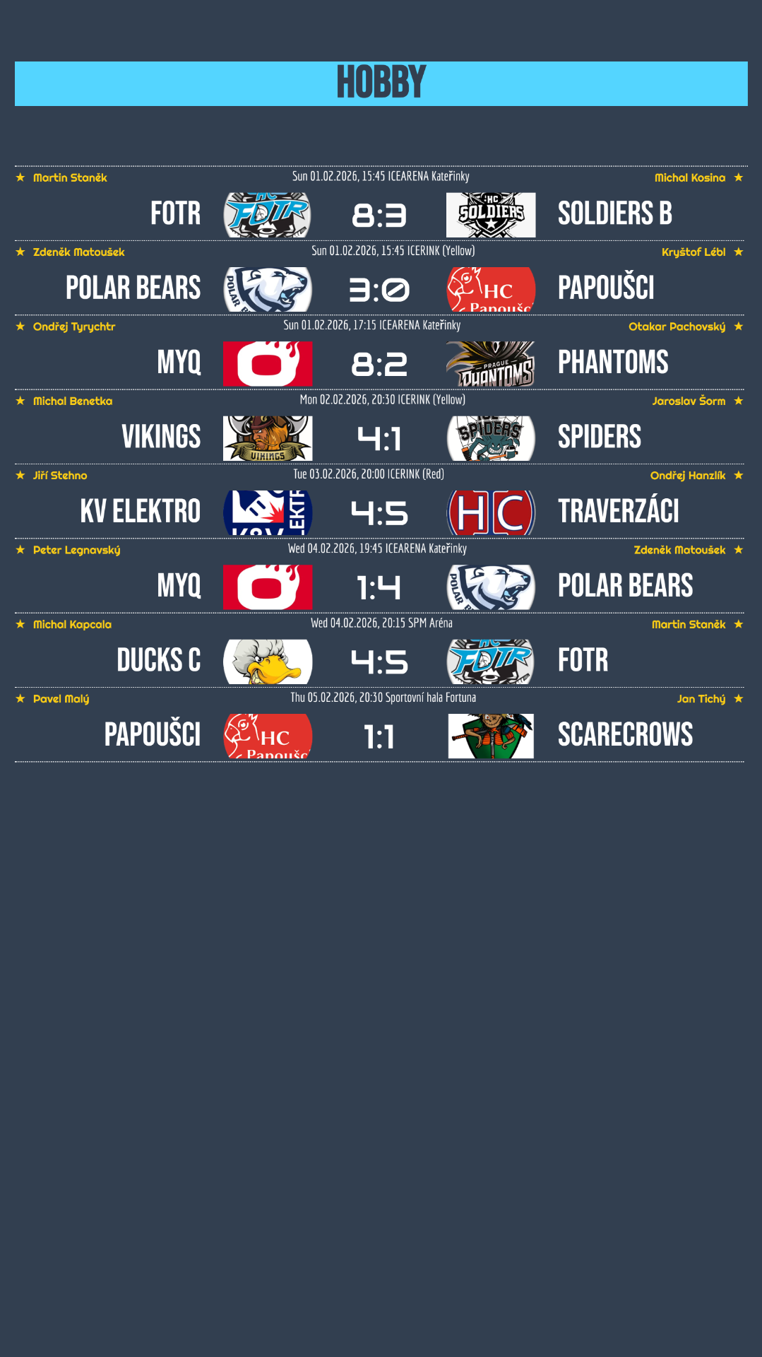 Hned dvě výhry si připsaly týmy Fotr a Polar Bears, které tak potvrdily dobrou formu a posílily své postavení v tabulce. MyQ Heroes si tentokrát počínali velmi suverénně, když s přehledem přehráli Prague Phantoms a nedali soupeři příliš prostoru na zdramatizování utkání. Na vítěznou vlnu z minulého týdne úspěšně navázali Vikings, kteří si v pondělním zápase poradili s Ice Spiders a dál sbírají důležité body. Vyrovnaný a bojovný duel nabídlo utkání mezi Traverzáky a KV Elektro, ze kterého nakonec vyšli lépe Traverzáci. Jedinou remízu týdne zaznamenali Strašáci a Papoušci, jejichž souboj skončil smírně 1:1 a oba celky si tak rozdělily body!
