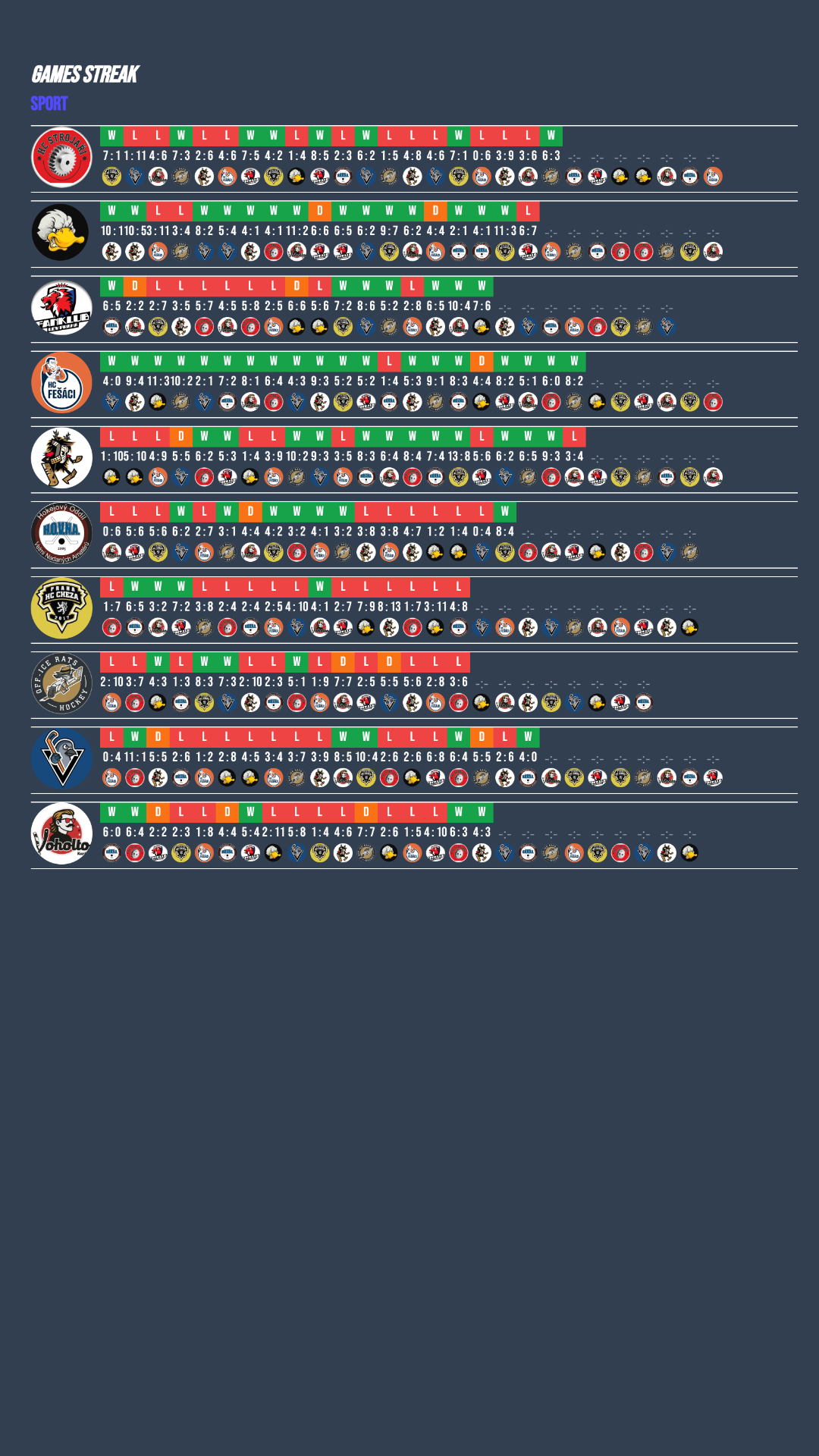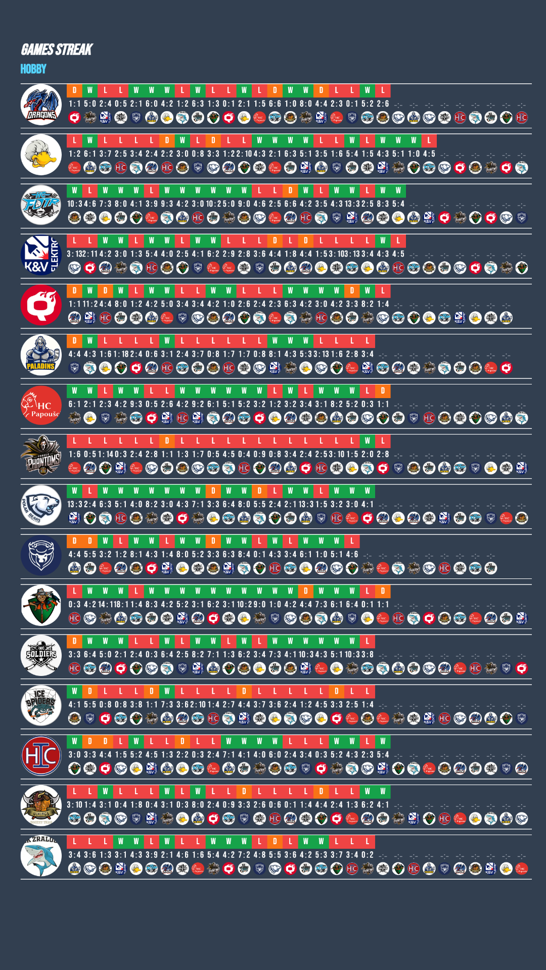 Velkou zásluhu na vítězství Pigeons měl jejich brankář, který proti H.O.V.N.A. předvedl famózní výkon a nepustil za svá záda ani jeden gól! Po třech porážkách se znovu nadechli Strojaři, kteří dokázali zlomit nepříznivou sérii a poradili si s Off Ice Rats. Na vítězné vlně dál pokračuje Fanklub Lev, který tentokrát zvládl divokou přestřelku proti druhému týmu tabulky Ducks Sport. Pro Ducks jde teprve o třetí porážku v sezoně, přesto jde o citelnou ztrátu v boji o čelo tabulky! H.O.V.N.A. si po nevydařeném utkání s Pigeons spravila chuť v zápase proti Cheze, kterou přehrála poměrem 8:4. Dobrou formu potvrzuje i Voholto Karlín, které navázalo na výhru z minulého týdne a tentokrát dokázalo porazit Heyoku.