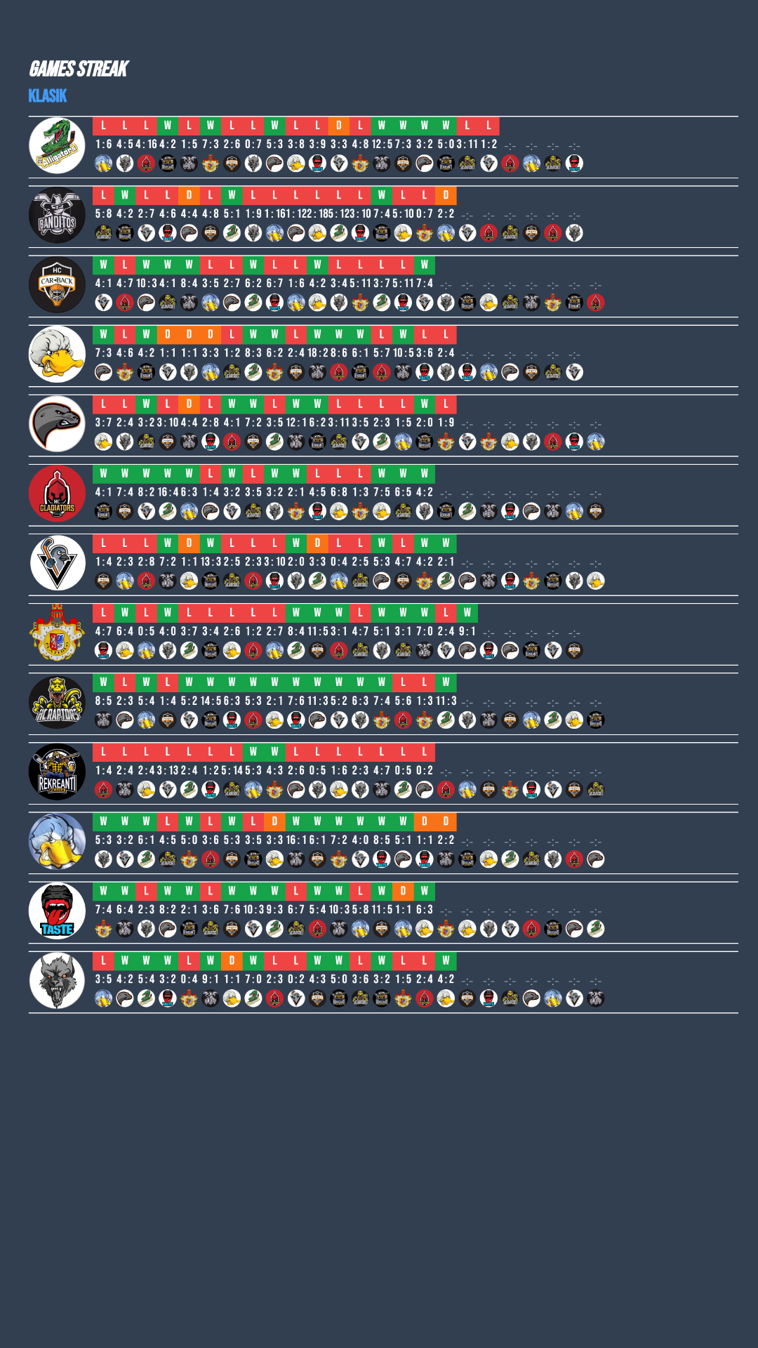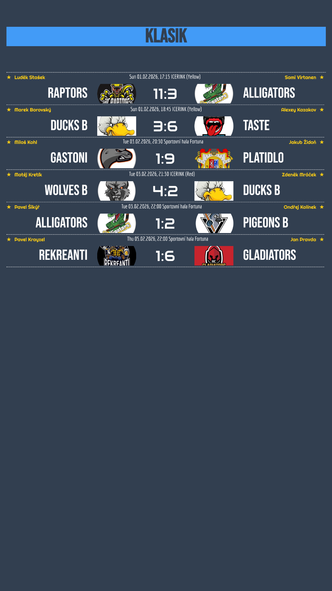 Nepříjemný týden zažili Ducks B a Alligators, kteří se tentokrát museli smířit se dvěma porážkami a zůstali bez bodového zisku. Na opačné straně spektra stojí Raptors a Wolves, kteří po dvou porážkách v řadě dokázali znovu zabrat a vítězstvími si spravili chuť i náladu! Důležitý zápas zvládli také Taste, kteří uspěli v souboji se sousedem v tabulce a upevnili si tak svou pozici. O ofenzivní podívanou se postaralo Platidlo, které nasázelo Gastonům hned devět gólů a zapsalo si jedno z nejvýraznějších vítězství týdne! Na vítězné vlně dál zůstávají Pigeons B a Gladiators, kteří navázali na své předchozí výsledky a přidali další výhry.