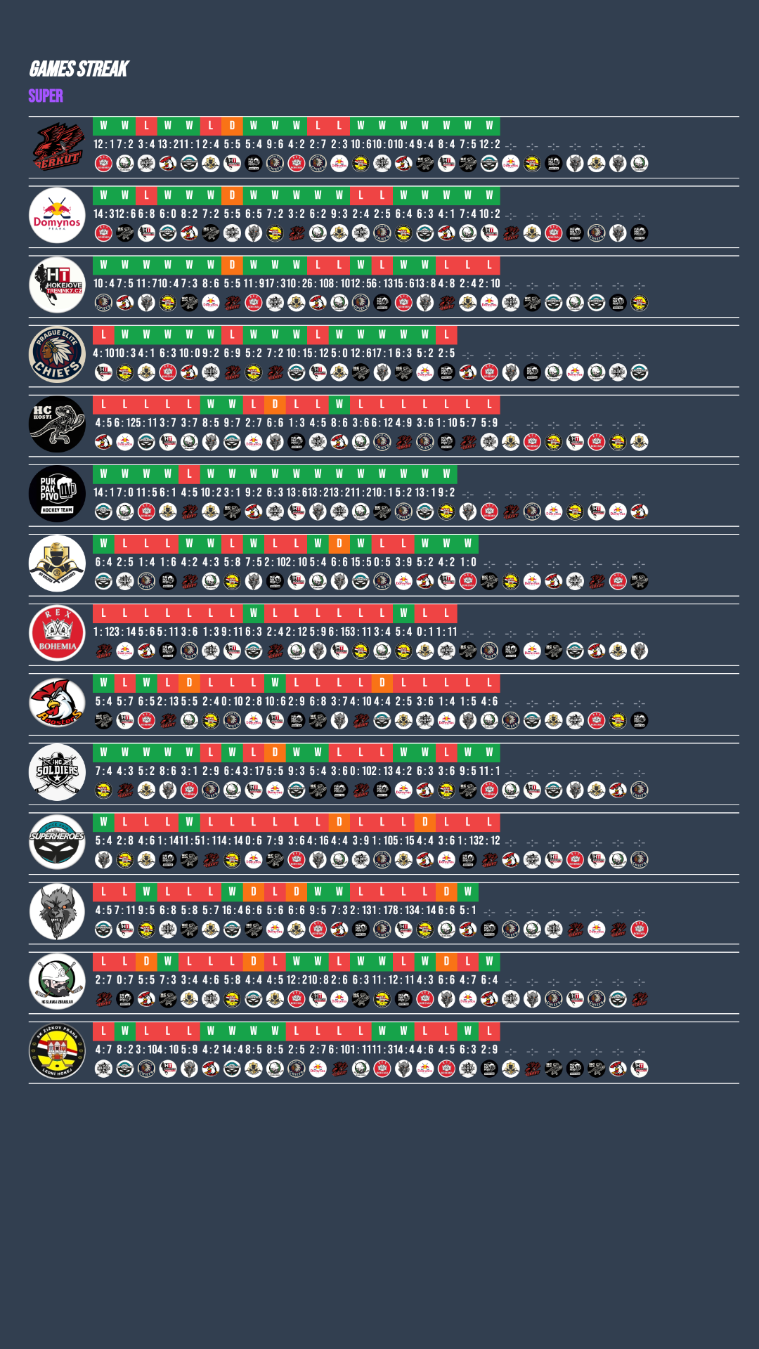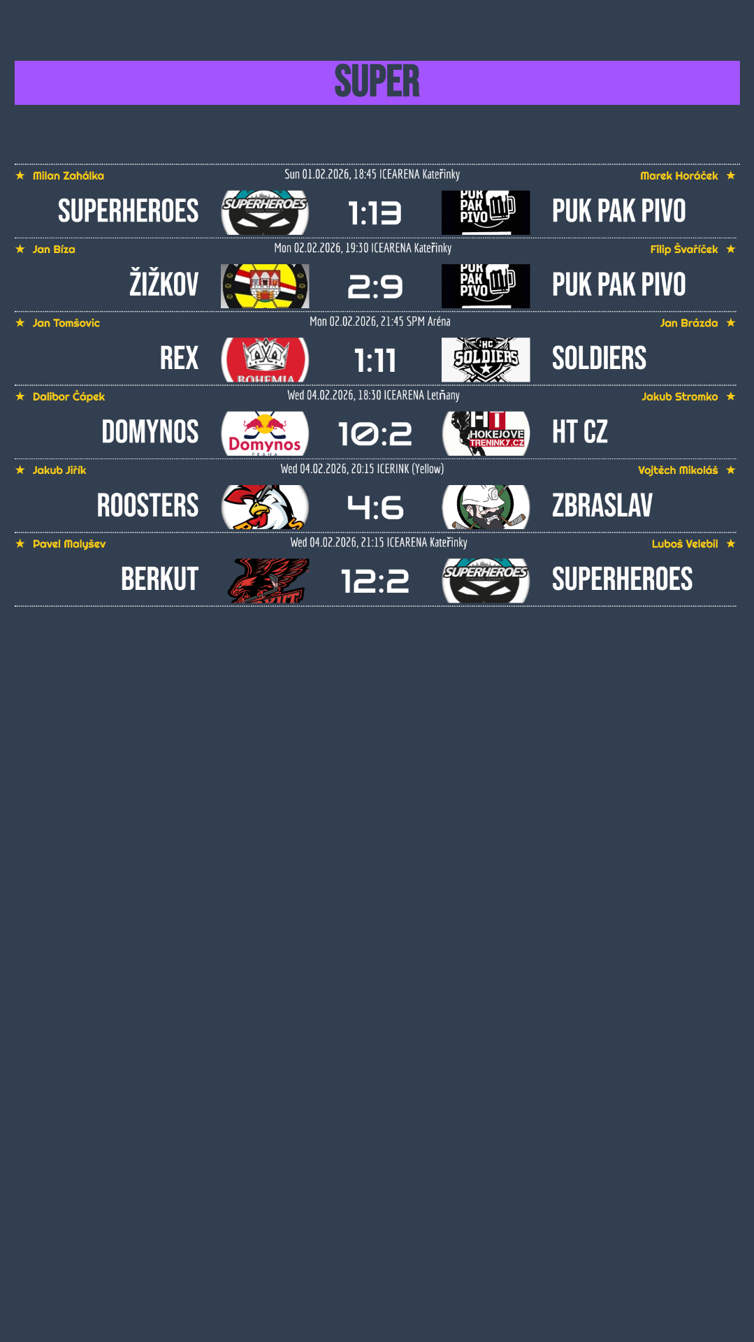 PUK PAK PIVO dál kráčí soutěží s obrovskou jistotou a potvrzuje roli hlavního favorita. Ve dvou zápasech tohoto týdne nasázelo svým soupeřům celkem 22 branek! Gólové hody ale nenabídlo jen PUK PAK PIVO. Soldiers, Domynos i Berkut předvedli podobně suverénní výkony a svým soupeřům nadělili přes devět branek. Pro diváky atraktivní zápasy, pro poražené týmy naopak velmi kruté výsledky, které jasně ukazují, jak je špička super divize momentálně odskočená. Jediné opravdu vyrovnané utkání týdne přinesl souboj mezi Roosters a Zbraslaví, které nakonec ovládli hosté.