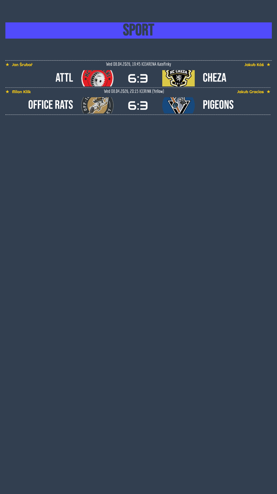 Strojaři vstoupili do svého utkání velmi aktivně a od začátku si drželi vedení. Soupeř sice několikrát dokázal snížit a držel se na dostřel, ale domácí měli zápas pod kontrolou a všechny pokusy o vyrovnání dokázali zastavit. Díky tomu si Strojaři připsali první vítězství v sérii. Stejný výsledek, ale opačný vývoj měl duel mezi Off Ice Rats a Prague Pigeons. Do utkání lépe vstoupili hosté, kteří se dostali do vedení, ale od té chvíle převzali iniciativu domácí. Office Rats postupně otočili průběh zápasu a nakonec si s přehledem došli pro vítězství 6:3!