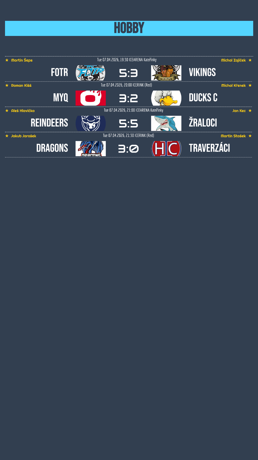 Fotr zvládl první duel proti Vikings, přičemž klíčový moment přišel zhruba 7 minut před koncem, kdy padla rozhodující branka. Vítězství pak ještě potvrdili gólem do prázdné brány. Velmi vyrovnaný souboj nabídlo také utkání mezi MyQ a Ducks C. Zápas byl dlouho otevřený, ale nakonec se radovali domácí, kteří zvítězili těsně 3:2. Divoký průběh měl zápas mezi Reindeers a Žraloky, který skončil remízou. Domácí nejprve museli dotahovat ztrátu, zatímco v závěru se role otočily a naopak hosté bojovali o vyrovnání. Jasnější průběh měl duel Dragons proti Traverzákům. Dragons předvedli výborný výkon směrem dozadu, nepovolili soupeři ani jednu branku a zvítězili 3:0!