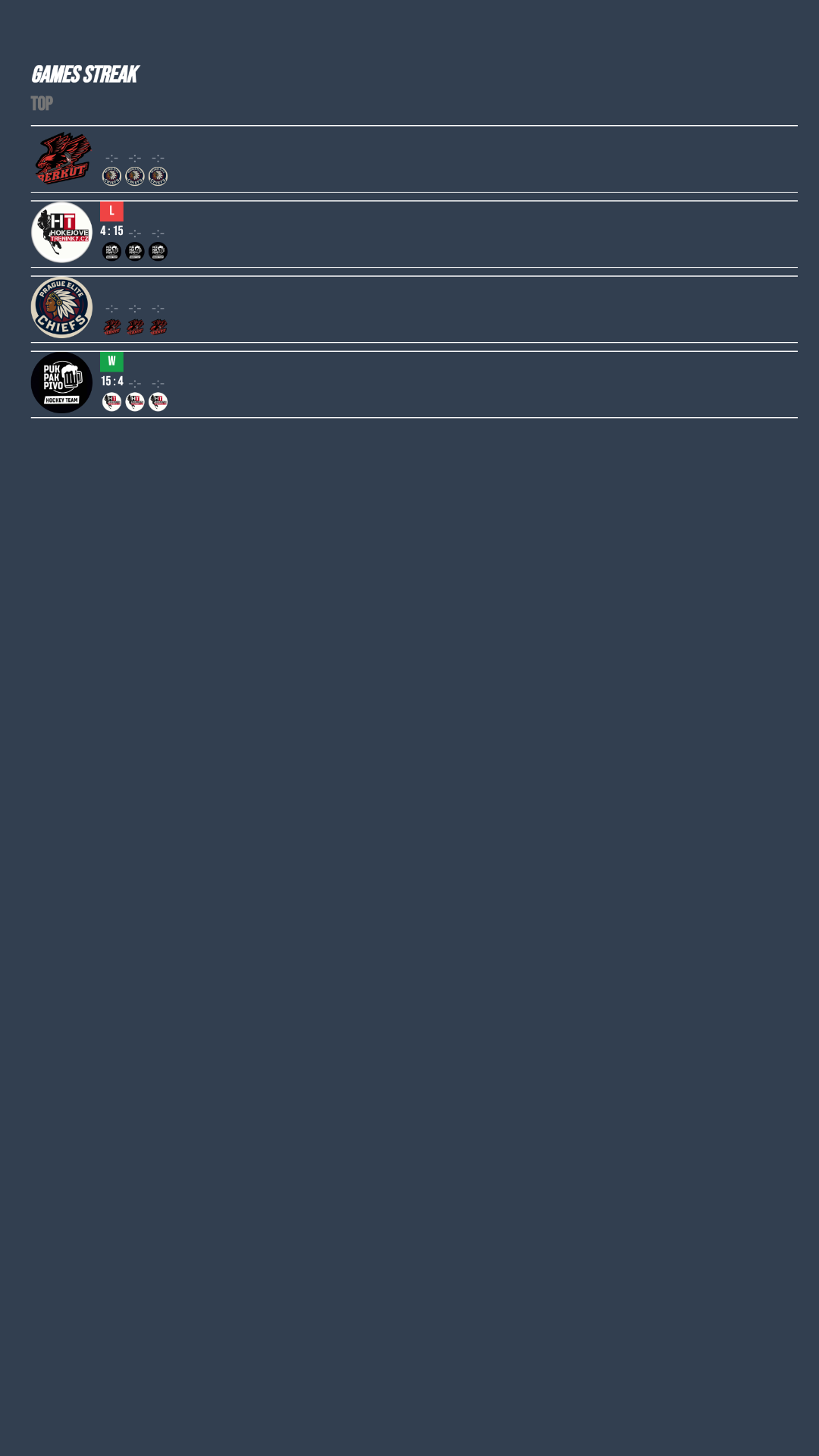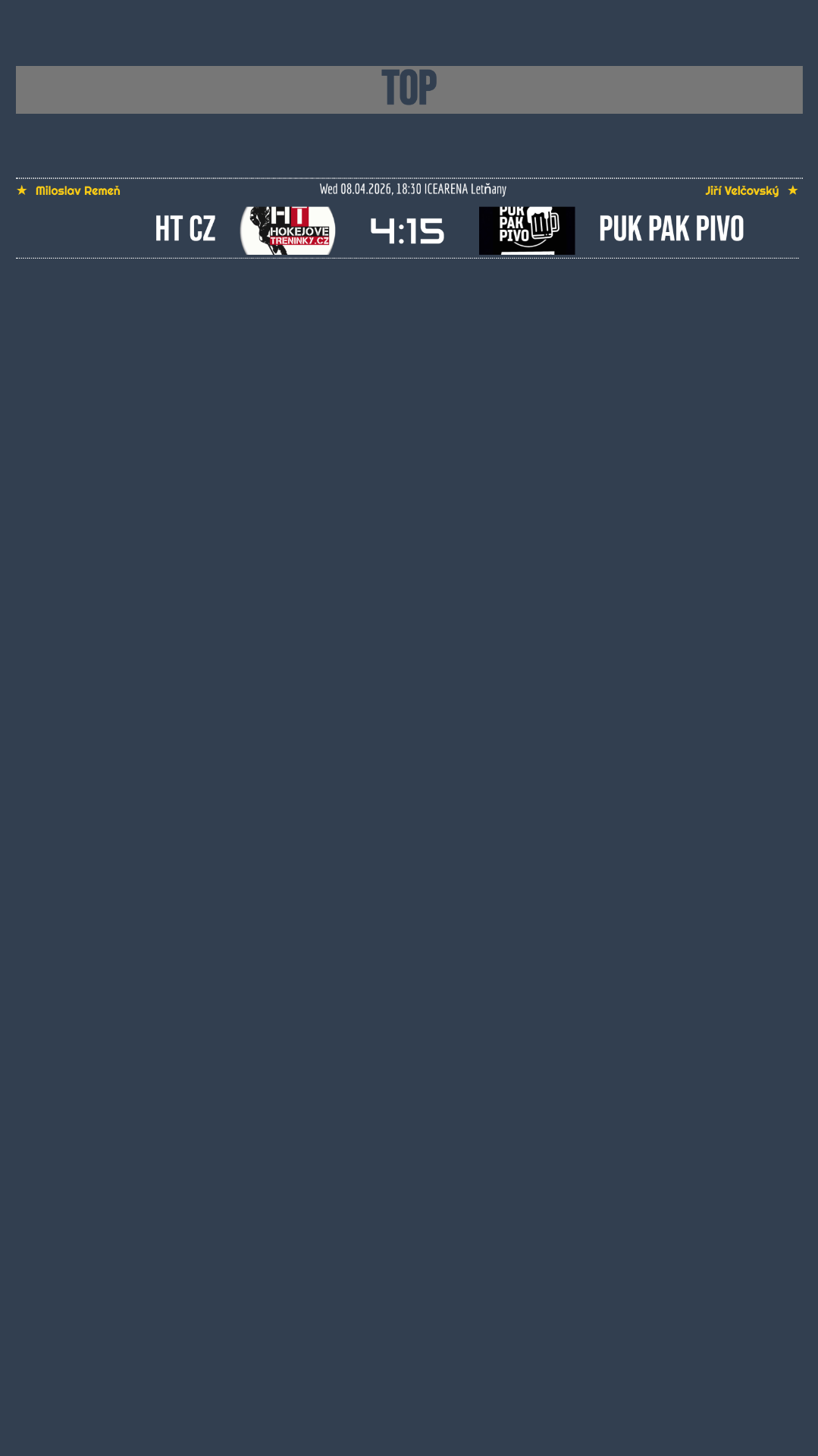 Top divize nabídla jediné semifinálové utkání, které se odehrálo na ledě v Letňanech, kde domácí Hokejové tréninky přivítaly favorizované puk pak pivo. Úvod zápasu byl ještě vyrovnaný a po první třetině držely oba týmy stále dramatizující stav. To se ale rychle změnilo ve druhé části hry, kdy přišla ze strany hostů ofenzivní kanonáda, na kterou domácí už nedokázali reagovat. Puk pak pivo postupně převzalo naprostou kontrolu nad utkáním a soupeři nedalo žádnou šanci na návrat do zápasu. Výsledkem byla jednoznačná výhra 15:4!
