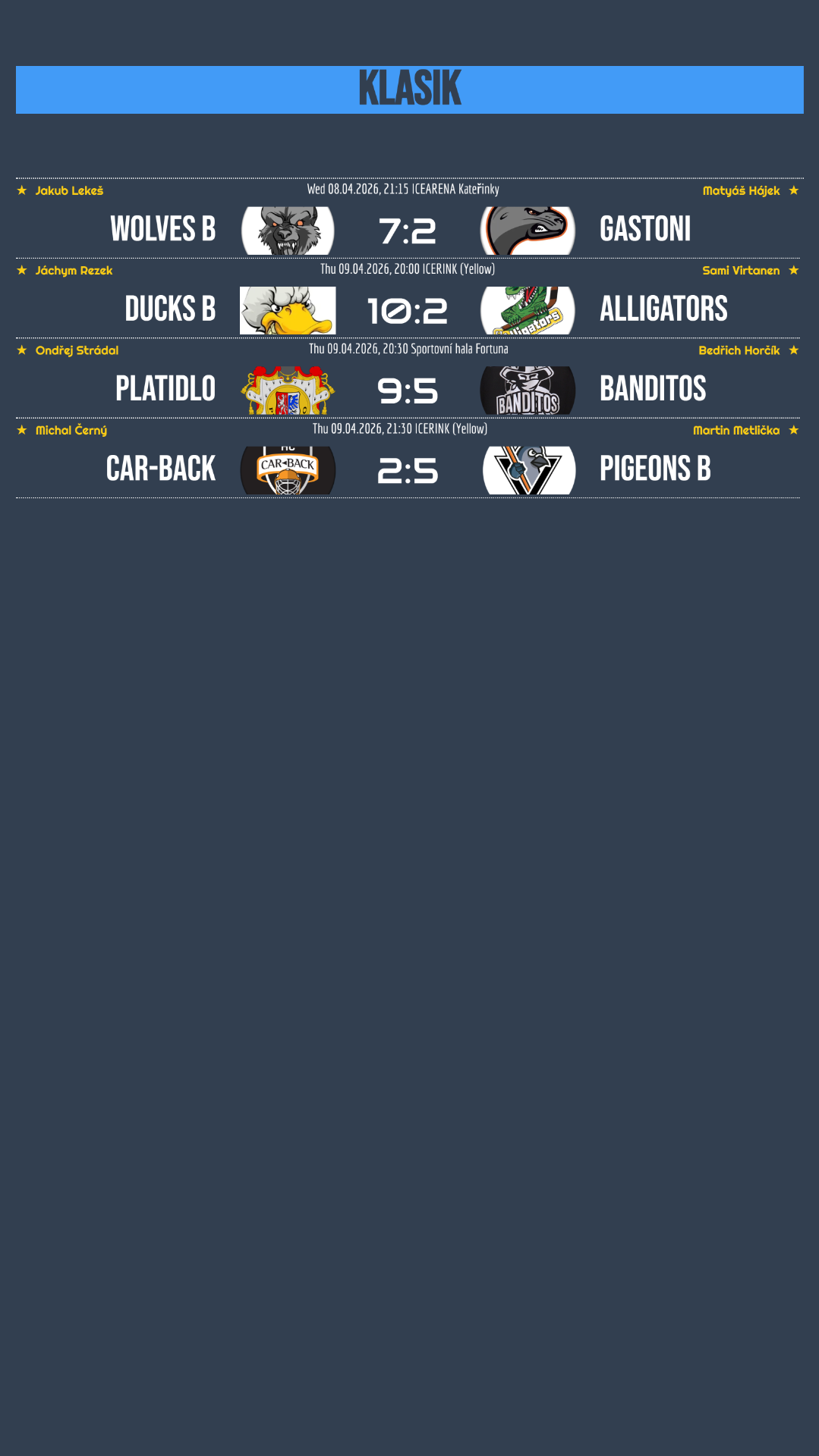 Rezerva Wolves předvedla dominantní výkon a sedmi brankami přehrála Gastony, čímž si s přehledem připsala první vítězství. Stejně suverénně si vedli i Ducks B, kteří dokonce deseti góly deklasovali Alligators a také vstoupili do série vítězně! Vyrovnanější průběh měl duel mezi Banditos a Platidlem. Hosté dlouho drželi krok a drželi zápas otevřený, ale v závěru se domácí dokázali utrhnout a nakonec zvítězili 9:5. Pohledný hokej nabídlo utkání mezi Pigeons B a Car-Back, ve kterém byli úspěšnější hráči Pigeons!