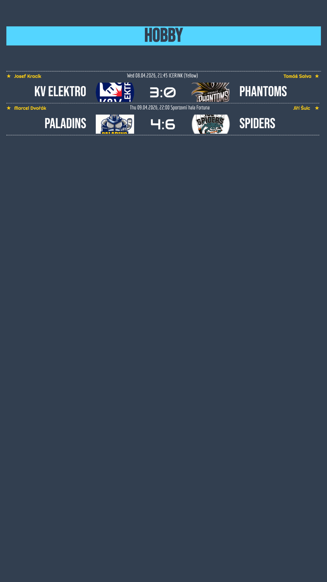 KV Elektro předvedlo velmi disciplinovaný výkon a nedovolilo Phantoms ani jednu branku. Díky pevnému defenzivnímu výkonu a efektivitě v útoku si došlo pro jasné vítězství 3:0. Mnohem dramatičtější podívanou přinesl duel mezi Paladins a Ice Spiders. Hosté měli zápas dlouho pod kontrolou a ještě 3 minuty před koncem vedli 5:1. Pak ale přišel neuvěřitelný závěr, kde Paladins dokázali během vlastního oslabení vstřelit tři góly za pouhých 23 sekund a snížili na 5:4. Závěr ale přece jen zvládli lépe Spiders, kteří v posledních chvílích využili přesilovou hru a pojistili si vítězství 6:4!