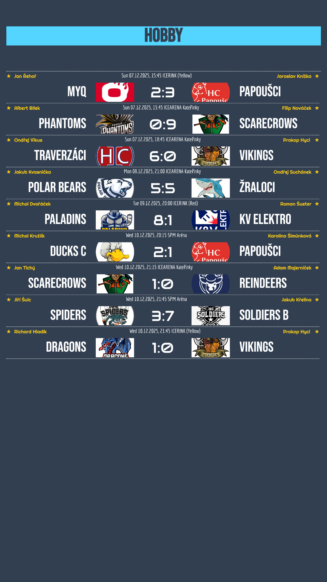 V Hobby divizi tentokrát excelovaly hlavně defenzivy. Hned čtyři týmy udržely čisté konto, což podtrhuje výborné výkony brankářů i pevnost obran v tomto hracím týdnu! Skvělý týden prožili HC Strašáci, kteří si připsali rovnou dvě vítězství a potvrzují výbornou formu. O velké překvapení se postarali BK Žraloci, když dokázali remizovat 5:5 s jedním z nejlepších týmů tabulky HC Polar Bears! Radost mají i Profinit Paladins. Předposlední tým tabulky slaví svou třetí výhru v sezoně, a to ve velkém stylu, když přestříleli KV Elektro 8:1. Důležité vítězství si připsali take hráči Ducks C, Soldiers B a HC Traverzáci!