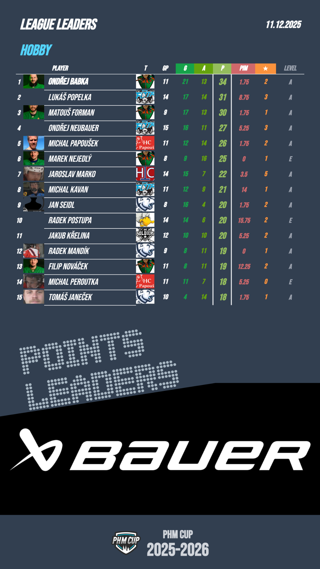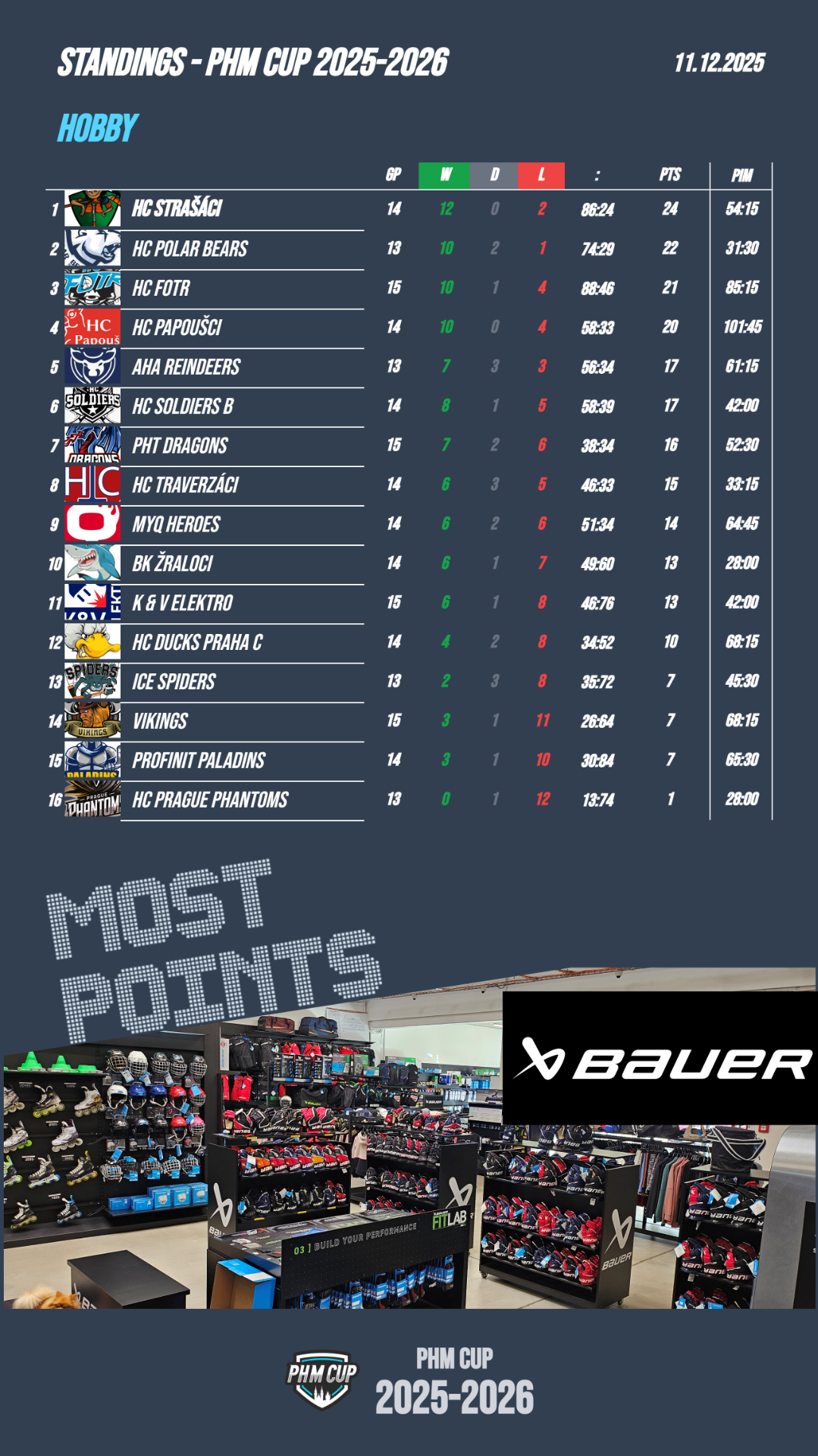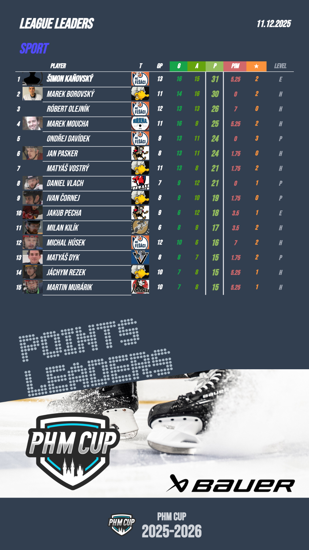 Do Vánoc zbývá poslední hrací týden a na ledě je to znát. Týmy makají naplno, protože každý chce zakončit rok vítězstvím a přenést si dobrou náladu do další části sezony. Tempo se stupňuje, zápasy mají šťávu a nikdo nechce před svátky zbytečně ztrácet body. Poslední šance urvat důležitá vítězství, posunout se v tabulce a jít na sváteční pauzu s dobrým pocitem. PHM Cup jede na plné otáčky až do úplného konce!