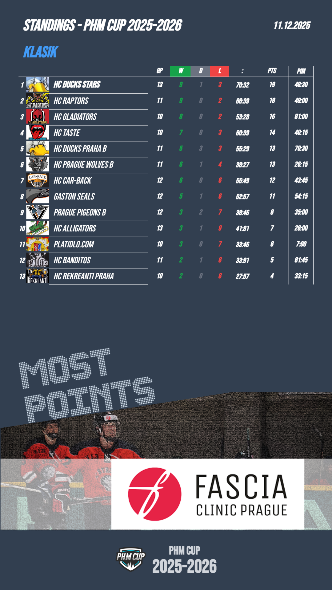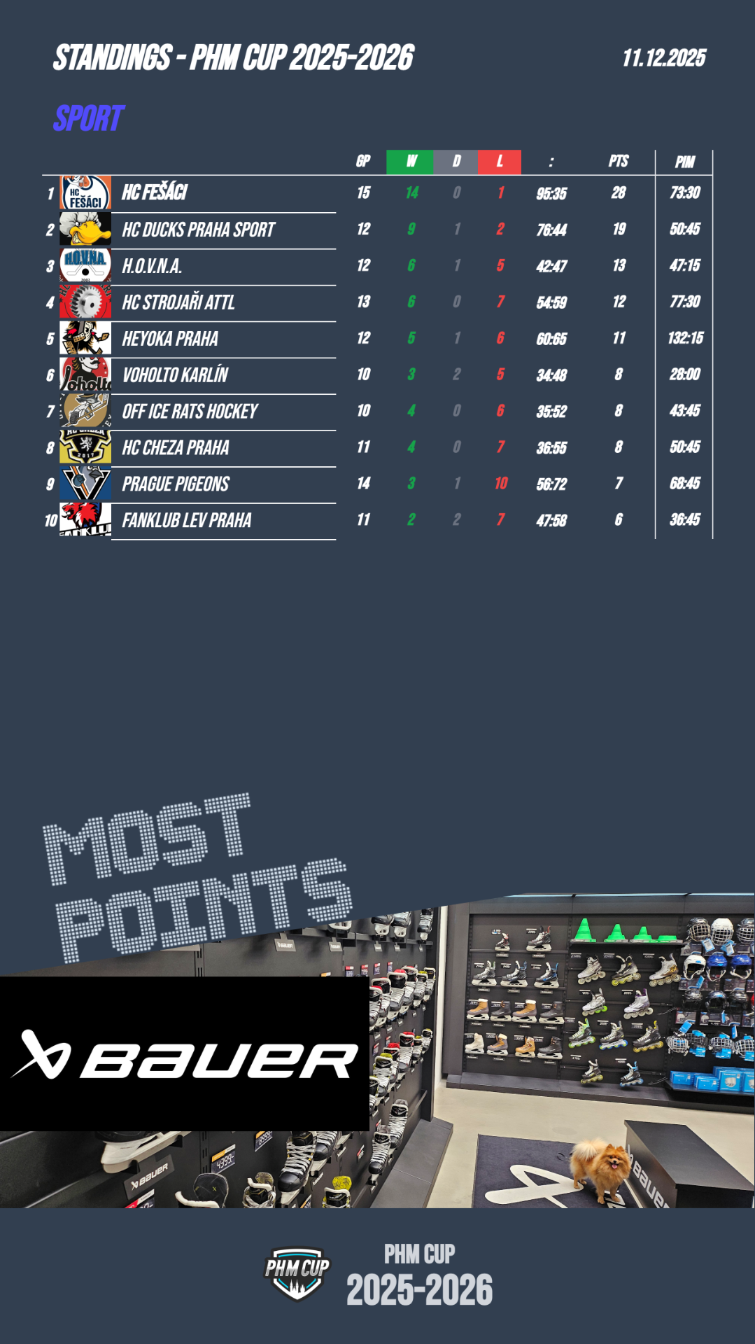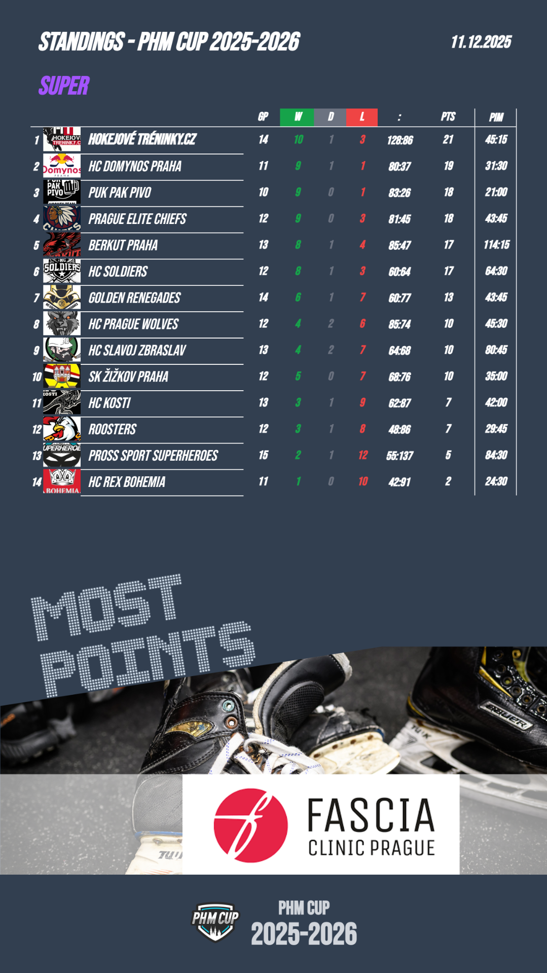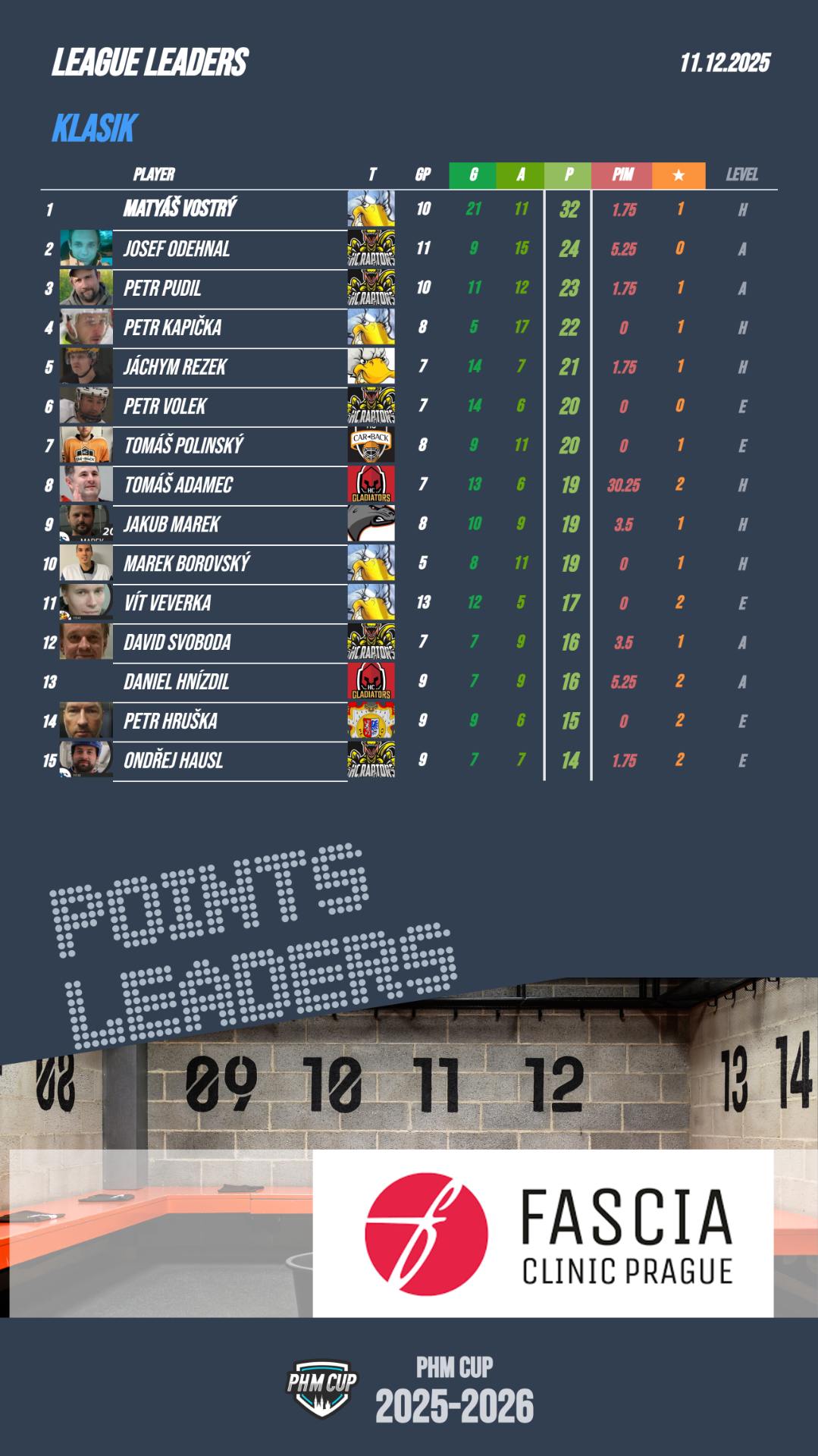 Do Vánoc zbývá poslední hrací týden a na ledě je to znát. Týmy makají naplno, protože každý chce zakončit rok vítězstvím a přenést si dobrou náladu do další části sezony. Tempo se stupňuje, zápasy mají šťávu a nikdo nechce před svátky zbytečně ztrácet body. Poslední šance urvat důležitá vítězství, posunout se v tabulce a jít na sváteční pauzu s dobrým pocitem. PHM Cup jede na plné otáčky až do úplného konce!