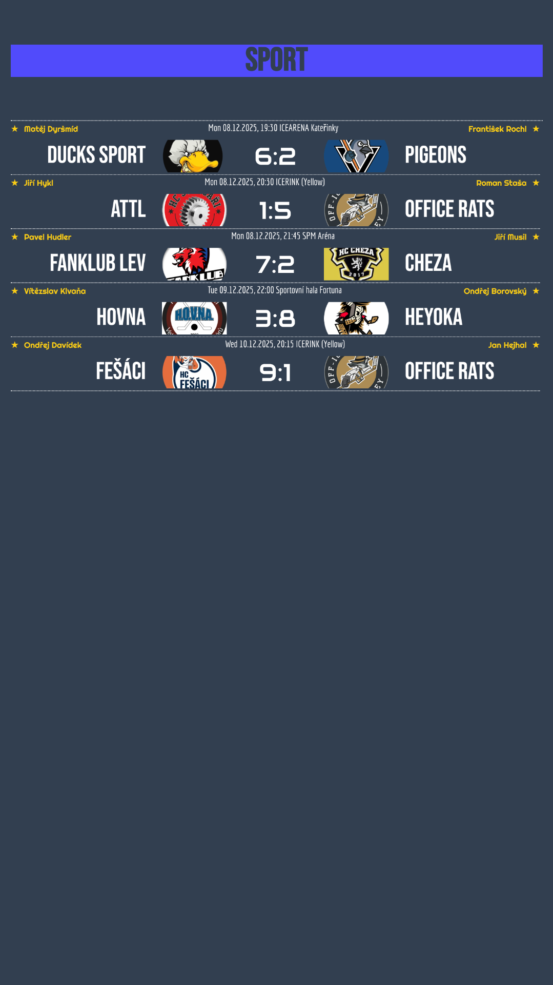 V Sport divizi tento týden padaly vysoké výsledky a týmy ukázaly své síly. Ducks Sport si poradil s Prague Pigeons 6:2 a upevnili si svou pozici v tabulce. Off Ice Rats odehrál dva zápasy. Nejdříve si hravě poradil se Strojaři 5:1, v dalším utkání však podlehl Fešákům 1:9! Ve večerním utkání v Holešovicích dominovala Heyoka, která přehrála H.O.V.N.A. 8:3. Fanklub Lev Praha si připsala teprve druhé vítězství v sezoně, když porazila Chezu 7:2!