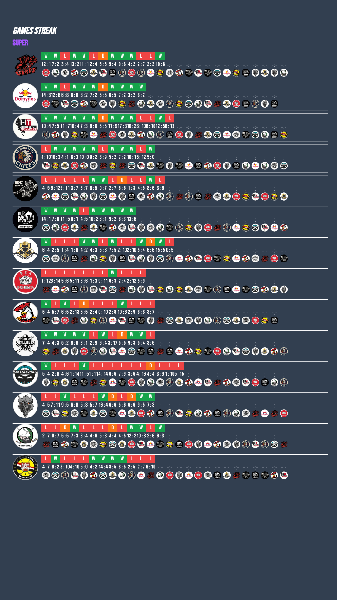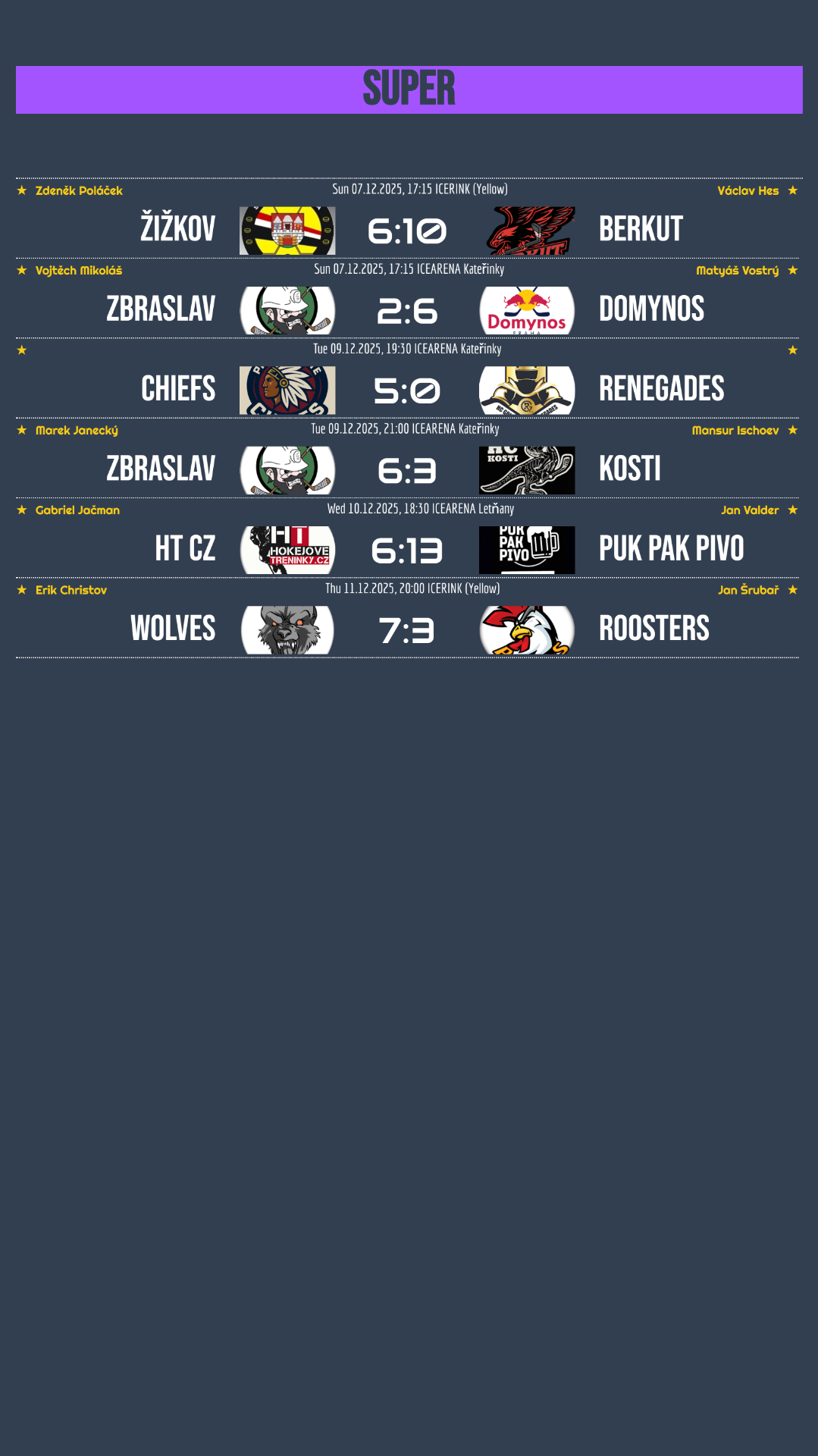 Vrchol tabulky Super divize je neskutečně vyrovnaný. Rozdíl mezi 1. a 6. týmem jsou pouhé 4 body a každý zápas může rozhodnout o posunech na špici! Berkut si v divokém utkání odnesl vítězství 10:6, Domynos si s přehledem poradil se Zbraslaví 6:2, která si ale rychle napravila náladu, když za dva dny zvítězila 6:3 nad HC Kosti! V gólové přestřelce si PUK PAK PIVO odneslo vítězství na Letňanech, když padlo dohromady 19 gólů! Wolves si ve čtvrtečním hracím dni poradil s Roosters 7:3, čímž si upevnil pozici v tabulce.