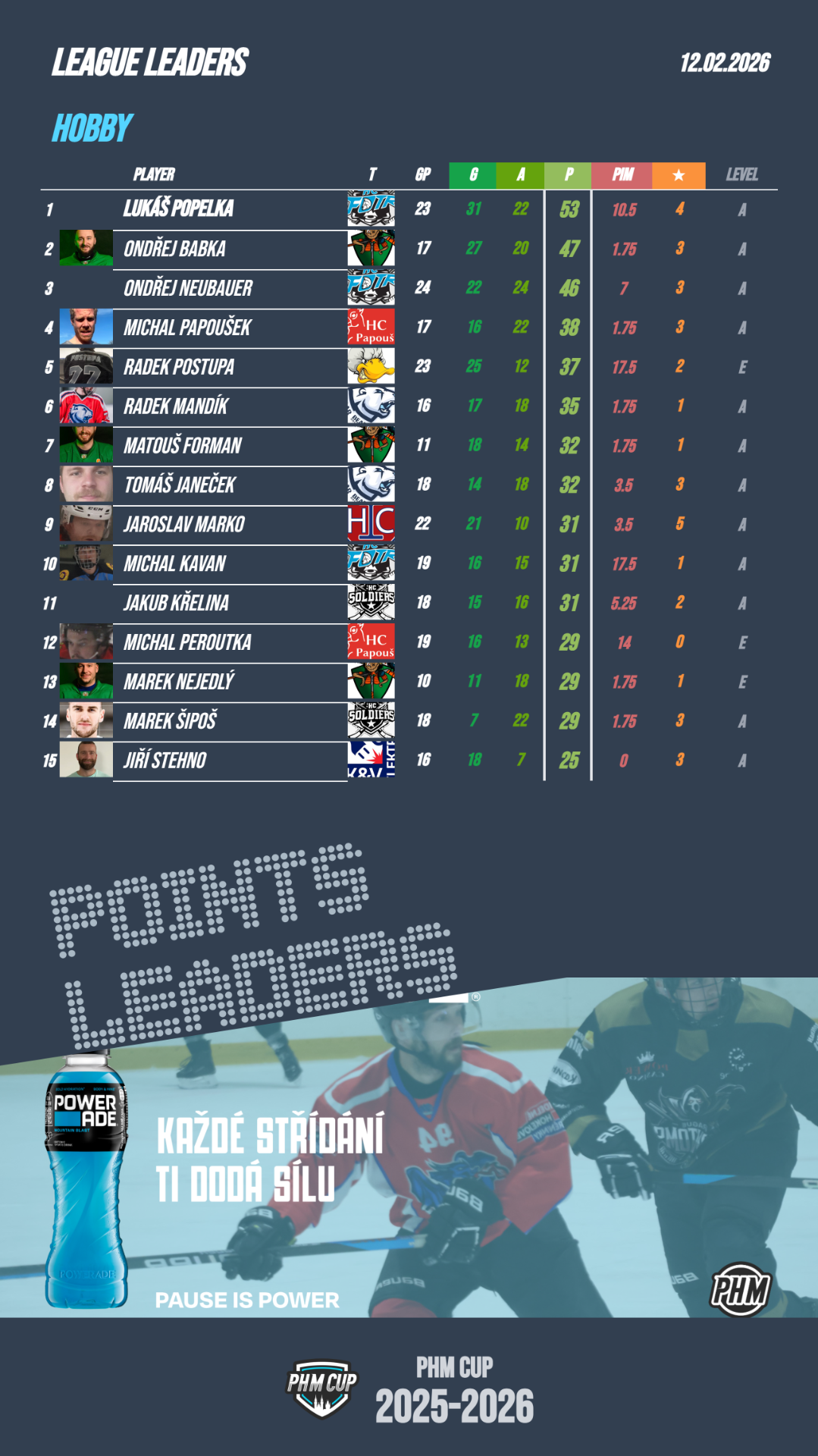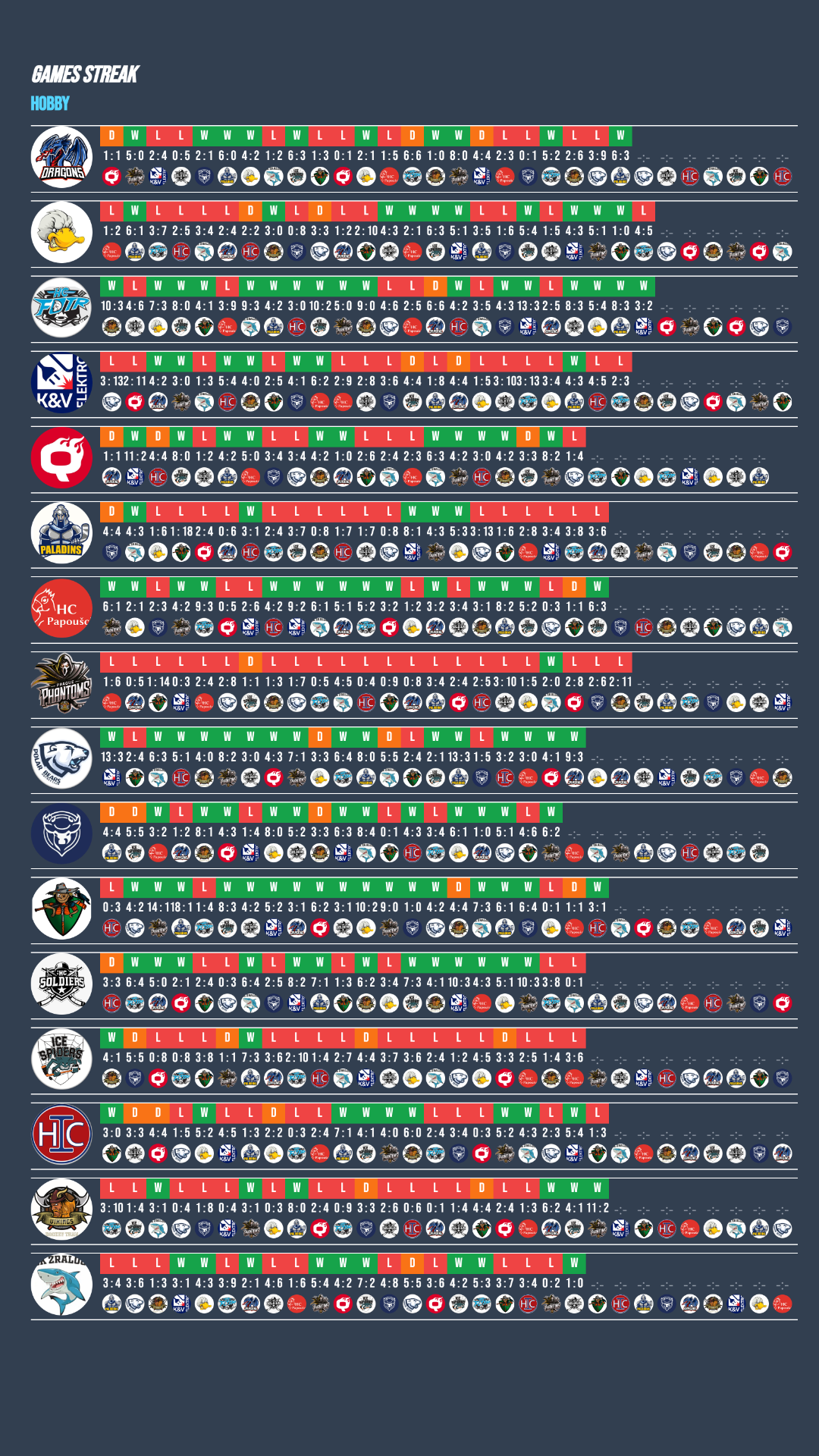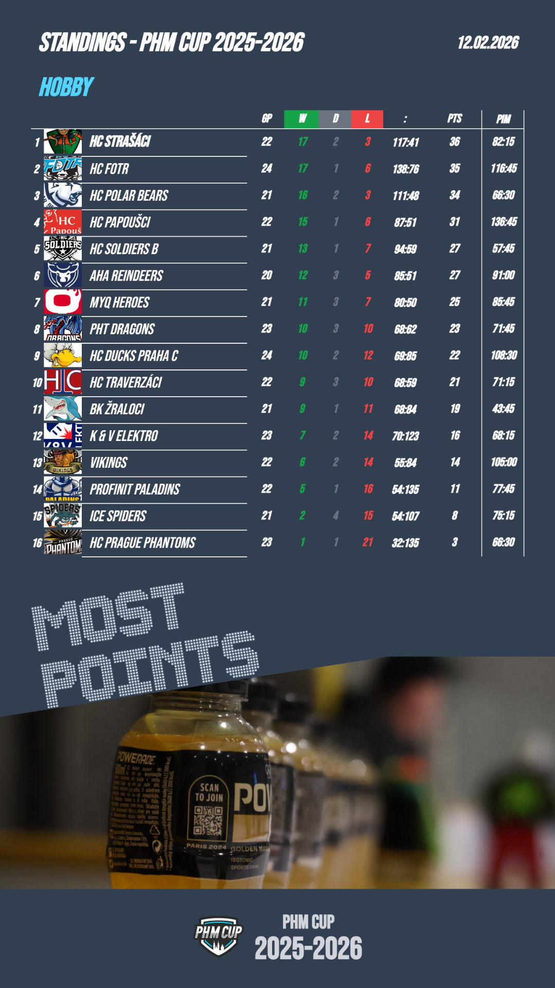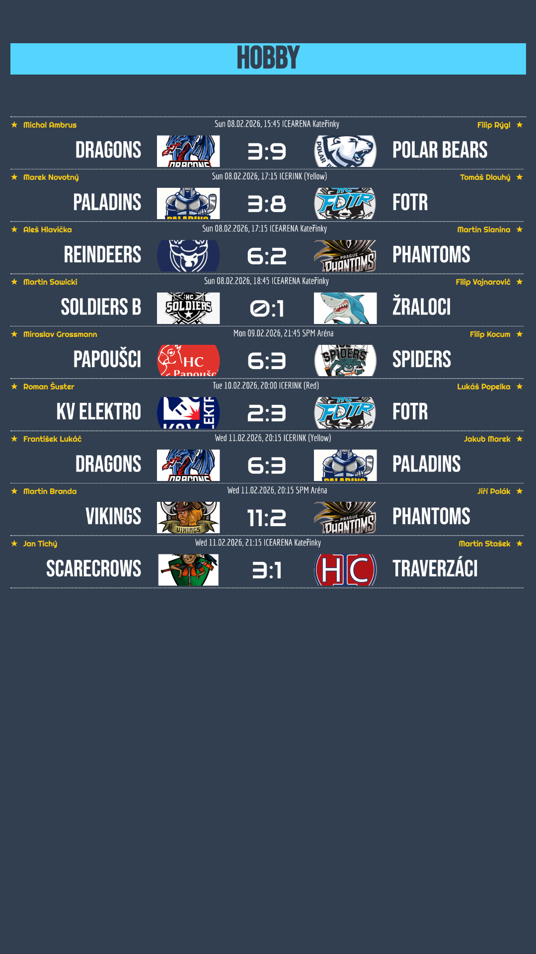 Hobby divize nabídla pořádně nabitý program, kdy se odehrálo hned devět zápasů a o góly rozhodně nebyla nouze. Vysoké výhry si připsali Polar Bears, Fotr i AHA Reindeers, kteří svým soupeřům nedali příliš prostoru na odpor. Nejvýraznější výsledek ale zaznamenali Vikings, kteří nadělili nejvyšší gólový příděl týdne a zároveň slaví už třetí vítězství v řadě. Velmi těsný duel naopak nabídli Žraloci se Soldiers B. O osudu utkání rozhodl jediný gól, který stačil Žralokům k zisku všech bodů! Strašáci si v bojovném zápase poradili s Traverzáky 3:1 a dál se drží na prvním místě!