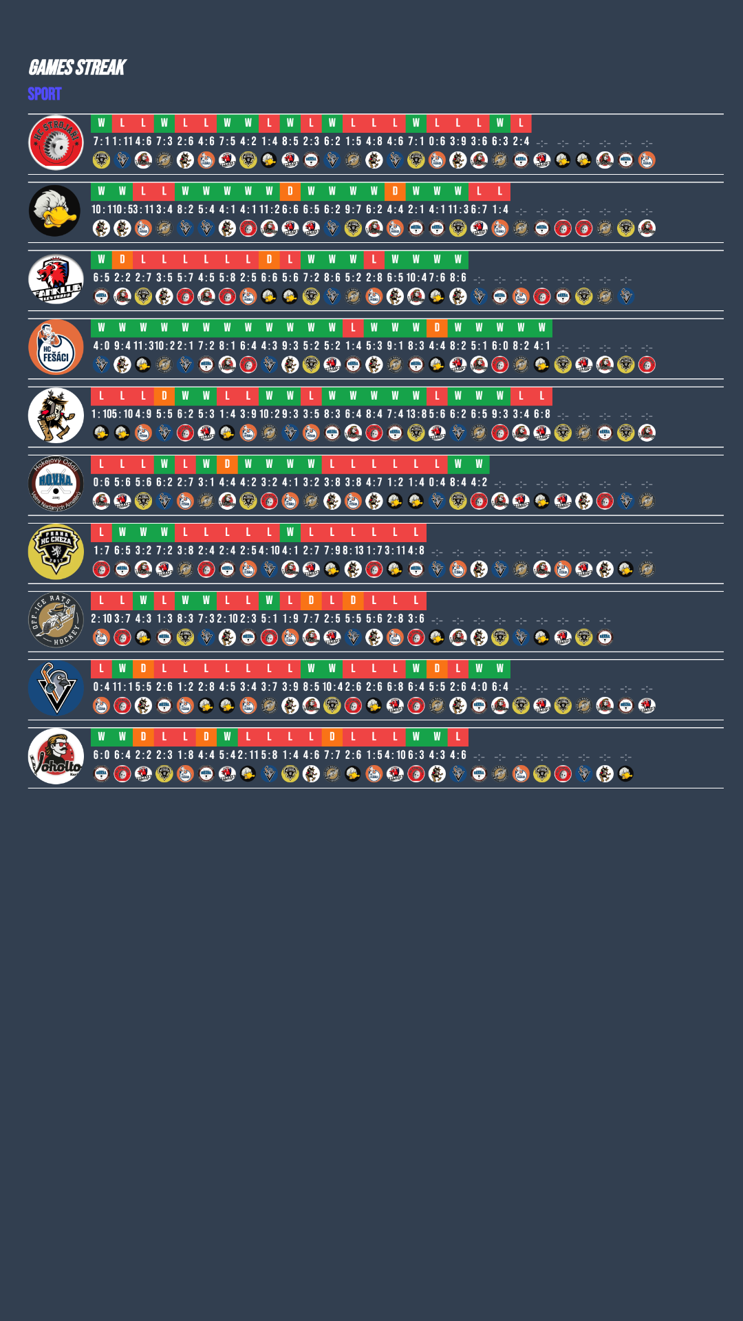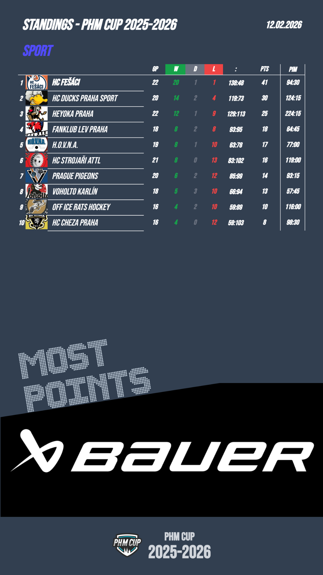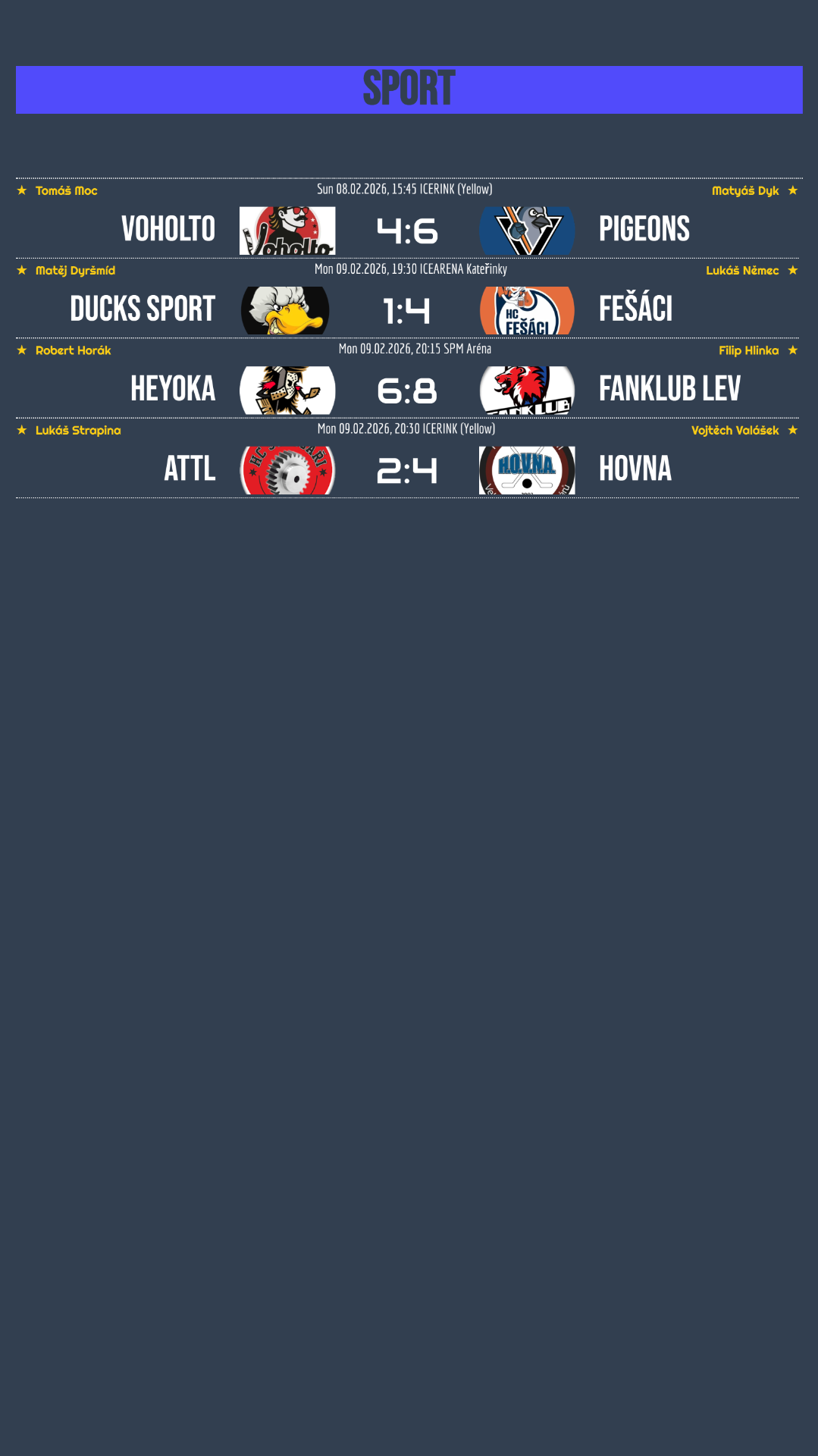 Sport divize měla na programu, stejně jako v klasik divizi, čtyři zápasy. Pigeons zvládli rychlé a vyrovnané utkání proti Voholtu Karlín, kde rozhodovaly hlavně využité přesilovky. Fanklub Lev pokračuje ve své sérii bláznivých a gólově bohatých duelů, když znovu vyzrál na Heyoku a po výsledku 8:6 si připsal další cenné vítězství! H.O.V.N.A. navázala na solidní výkon z minulého týdne a tentokrát si poradila se Strojaři. Vrchol zápasů obstarala bitva dvou nejlepších týmů sport divize. Šlágr vyzněl lépe pro Fešáky, kteří důležitým vítězstvím výrazně odskočili svým nejbližším konkurentům v tabulce a upevnili si pozici na čele soutěže!