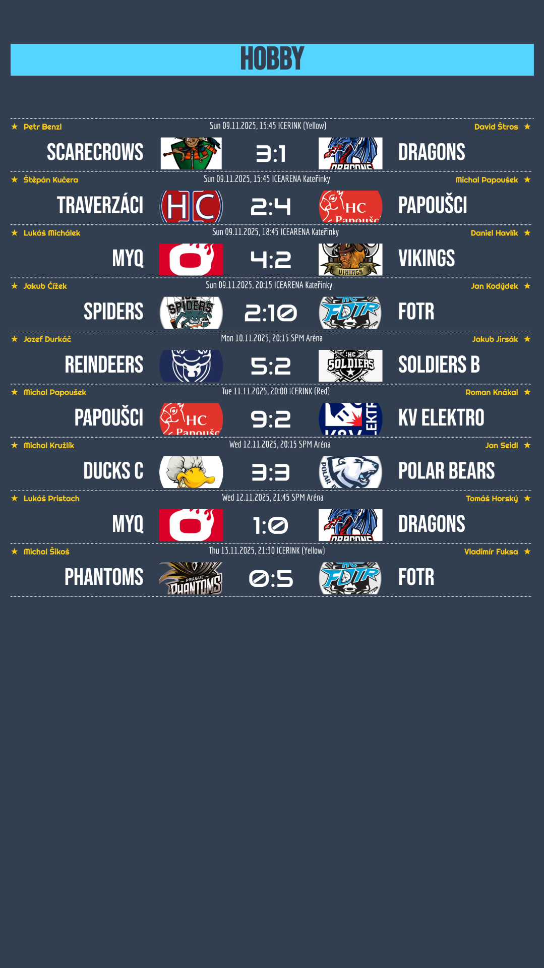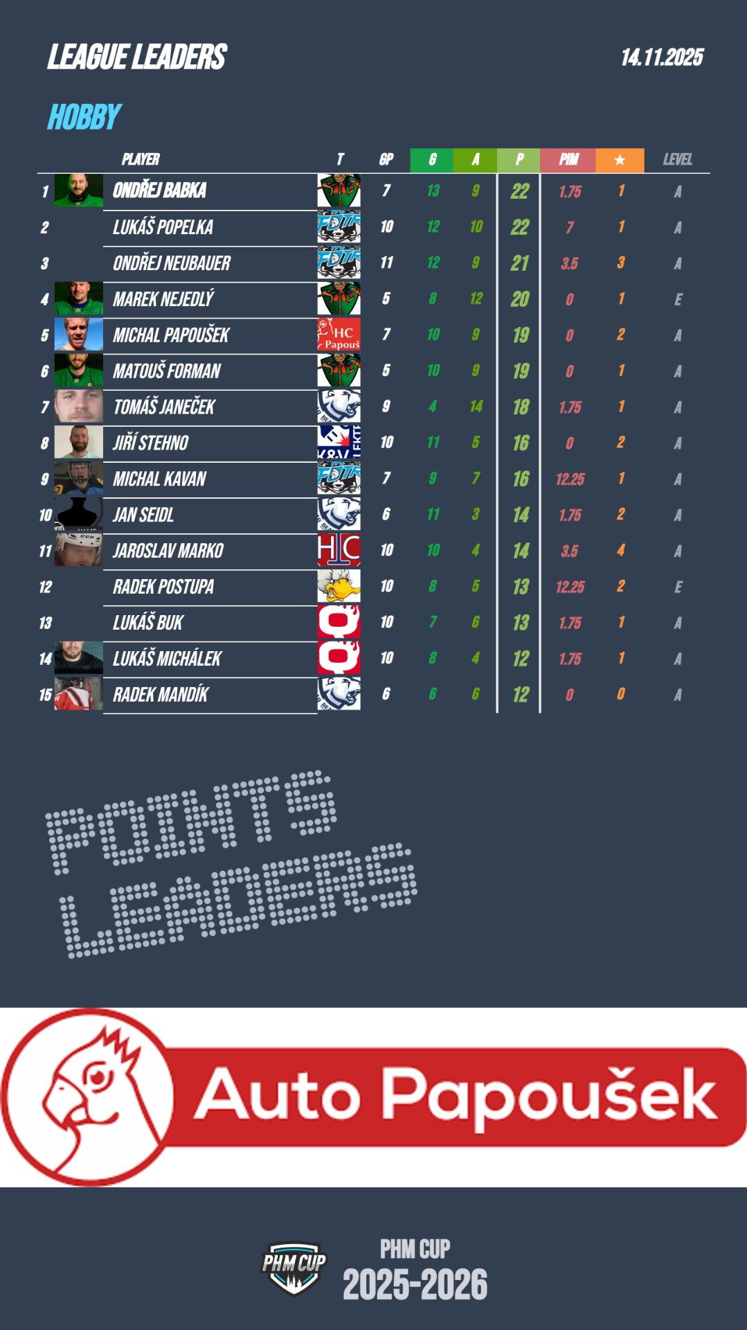 V Hobby divizi PHM Cupu jsme měli tento týden pořádnou porci hokeje – odehrálo se celkem 9 zápasů, které přinesly spoustu napětí, skvělých momentů i dominantních výkonů jednotlivců. Velkým hrdinou týdne byl Michal Papoušek z HC Papoušci, který nastřílel neuvěřitelných sedm gólů a výrazně přispěl k vysokému vítězství svého týmu 9:2! Dobře si vedli také hráči HC Fotr, kteří předvedli několik solidních výkonů a díky tomu se posunuli na první místo tabulky!