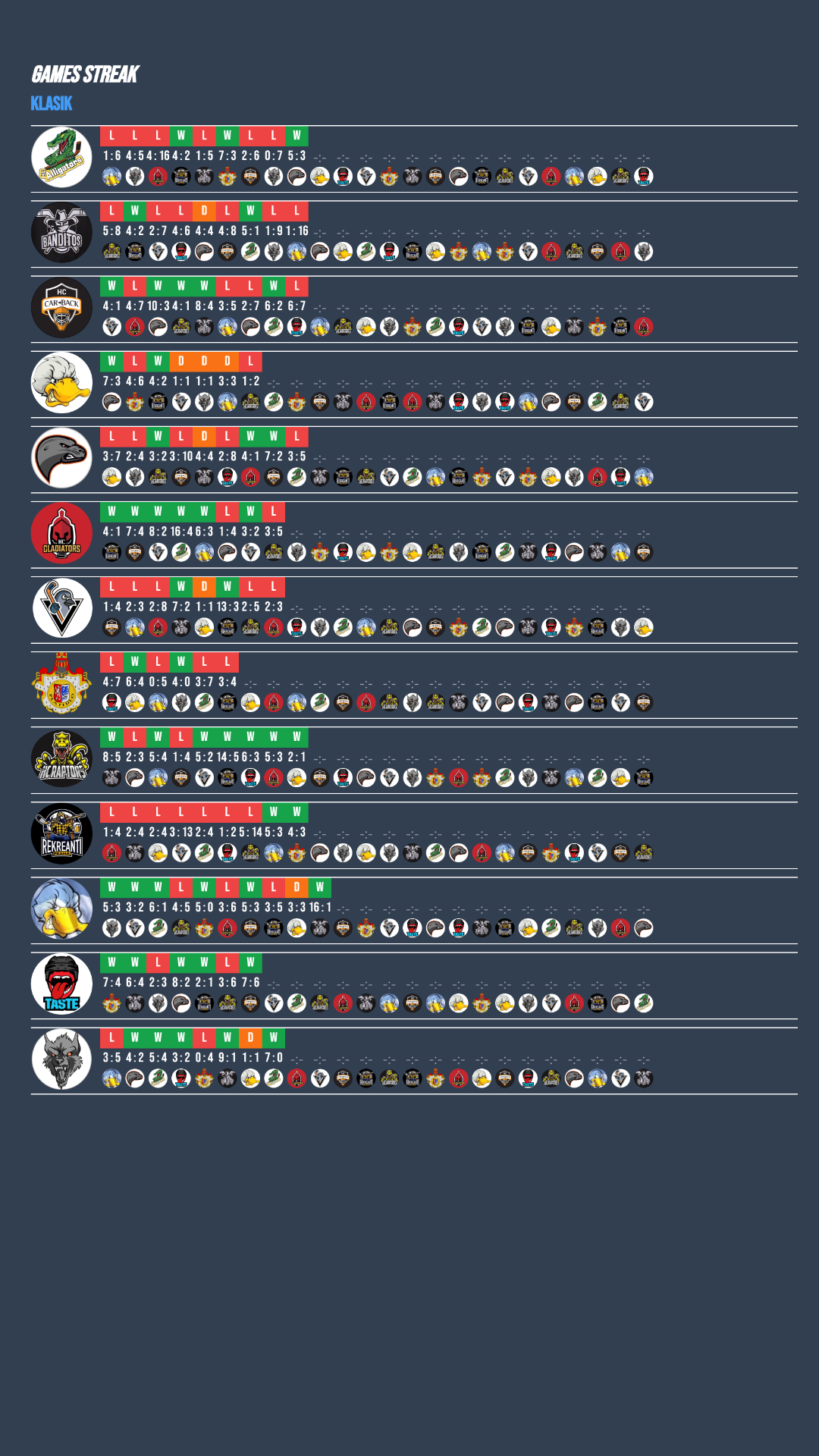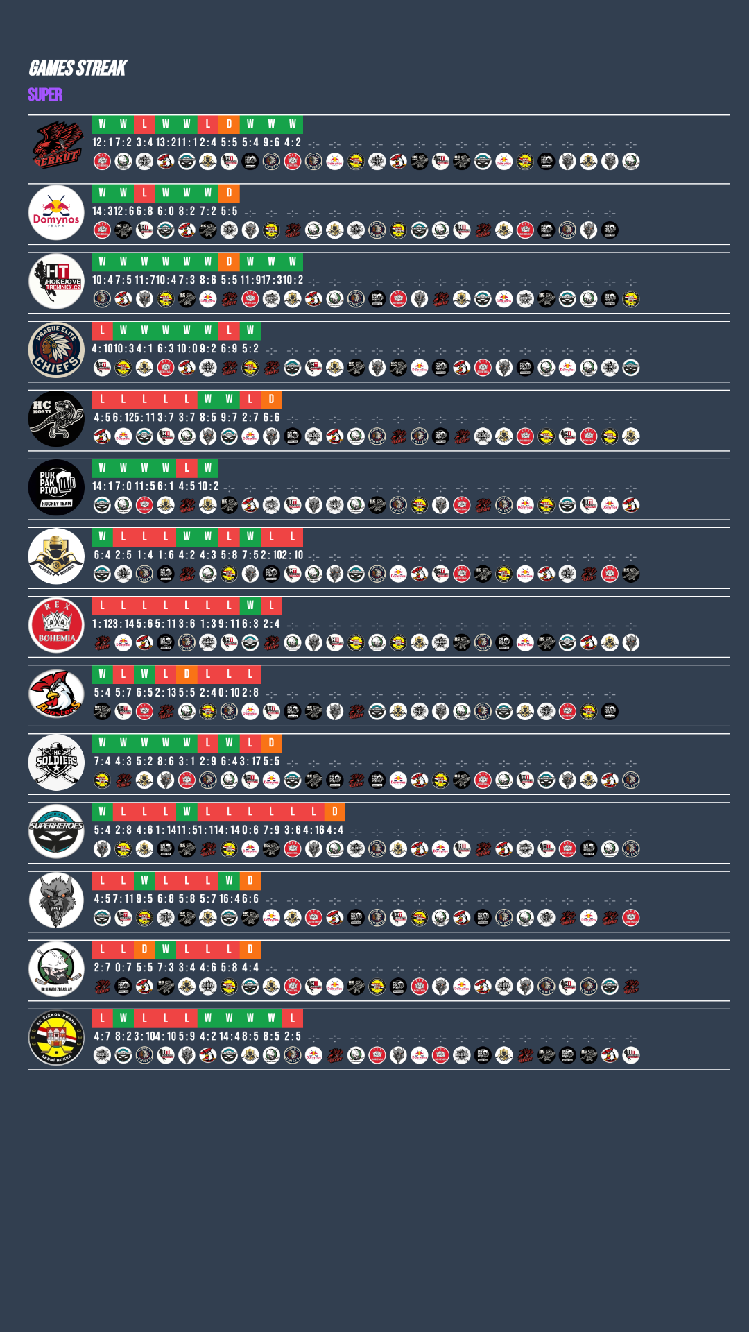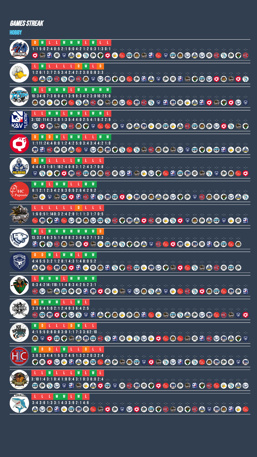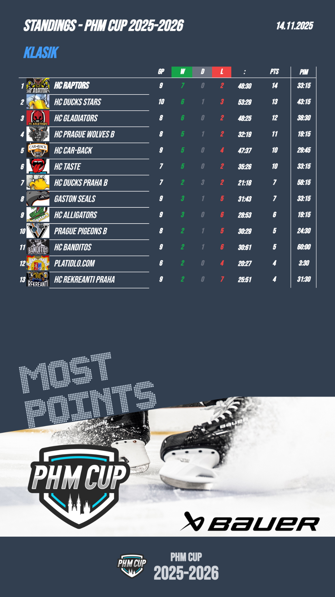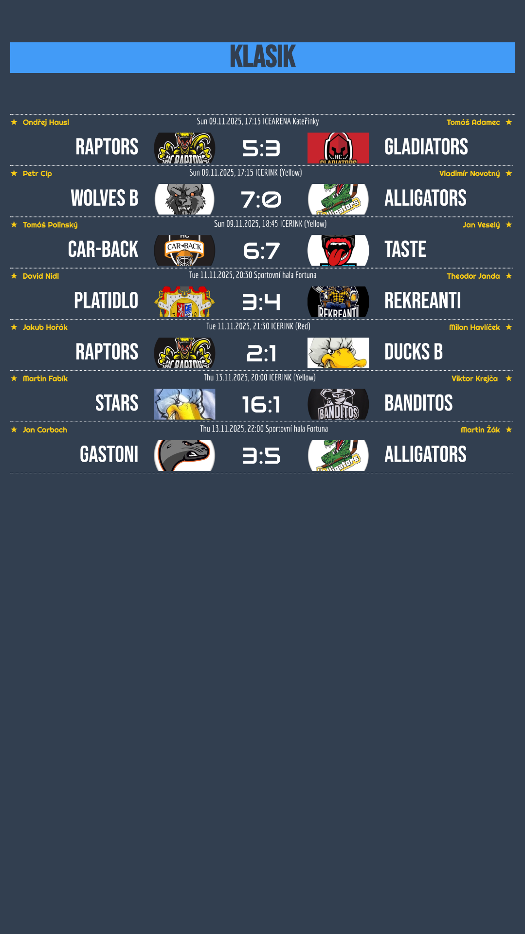 V Klasik divizi jsme viděli, že každý zápas se počítá. HC Raptors si připsali 4 body a díky nim se vyšplhali na první místo tabulky! Skvělý posun zaznamenali také HC Alligators, kteří se z 12. místa vyšvihli až na 9. příčku. Tento týden tak jasně ukázal, že v Klasik divizi není nic předem dané a každá výhra může výrazně ovlivnit postavení týmů. Celá divize je nesmírně vyrovnaná a napínavá – rozdíly mezi týmy jsou často minimální a každý bod může rozhodnout o postupu či lepší pozici v tabulce.