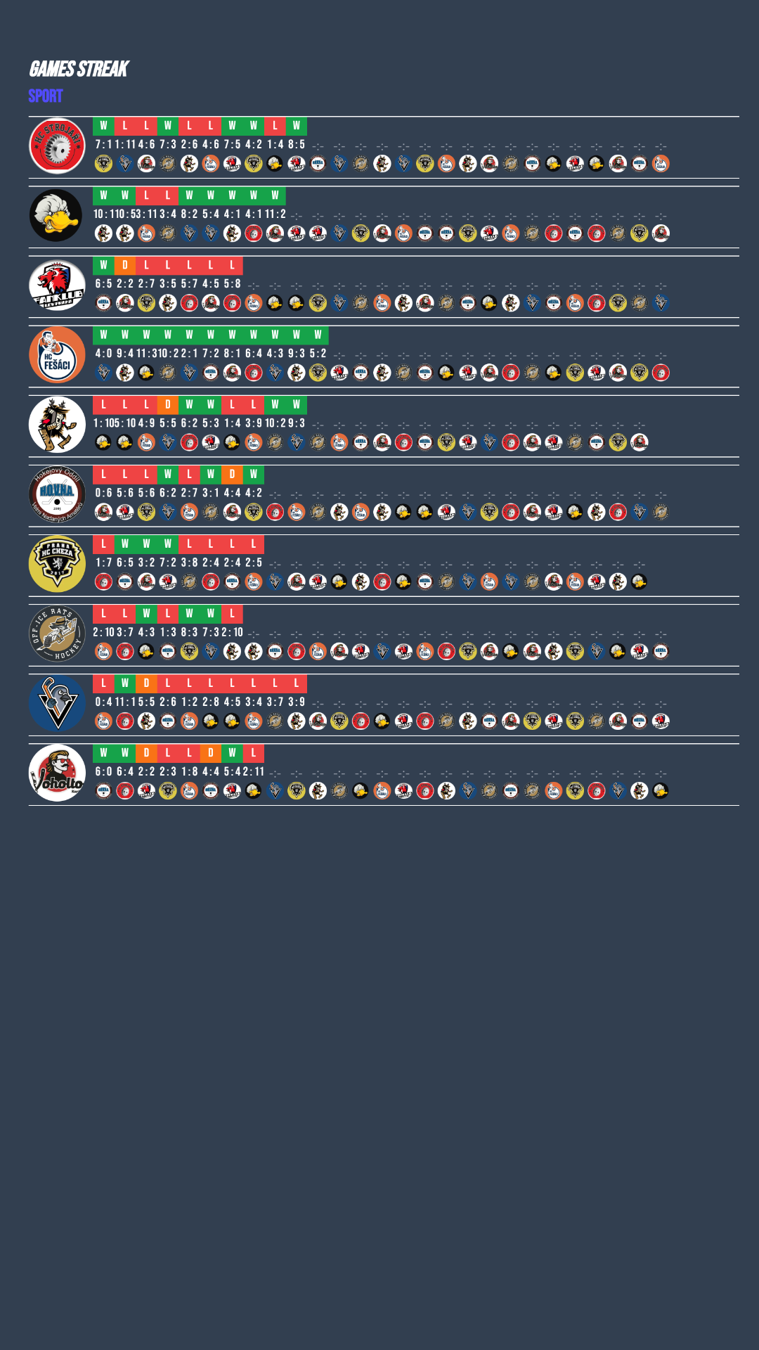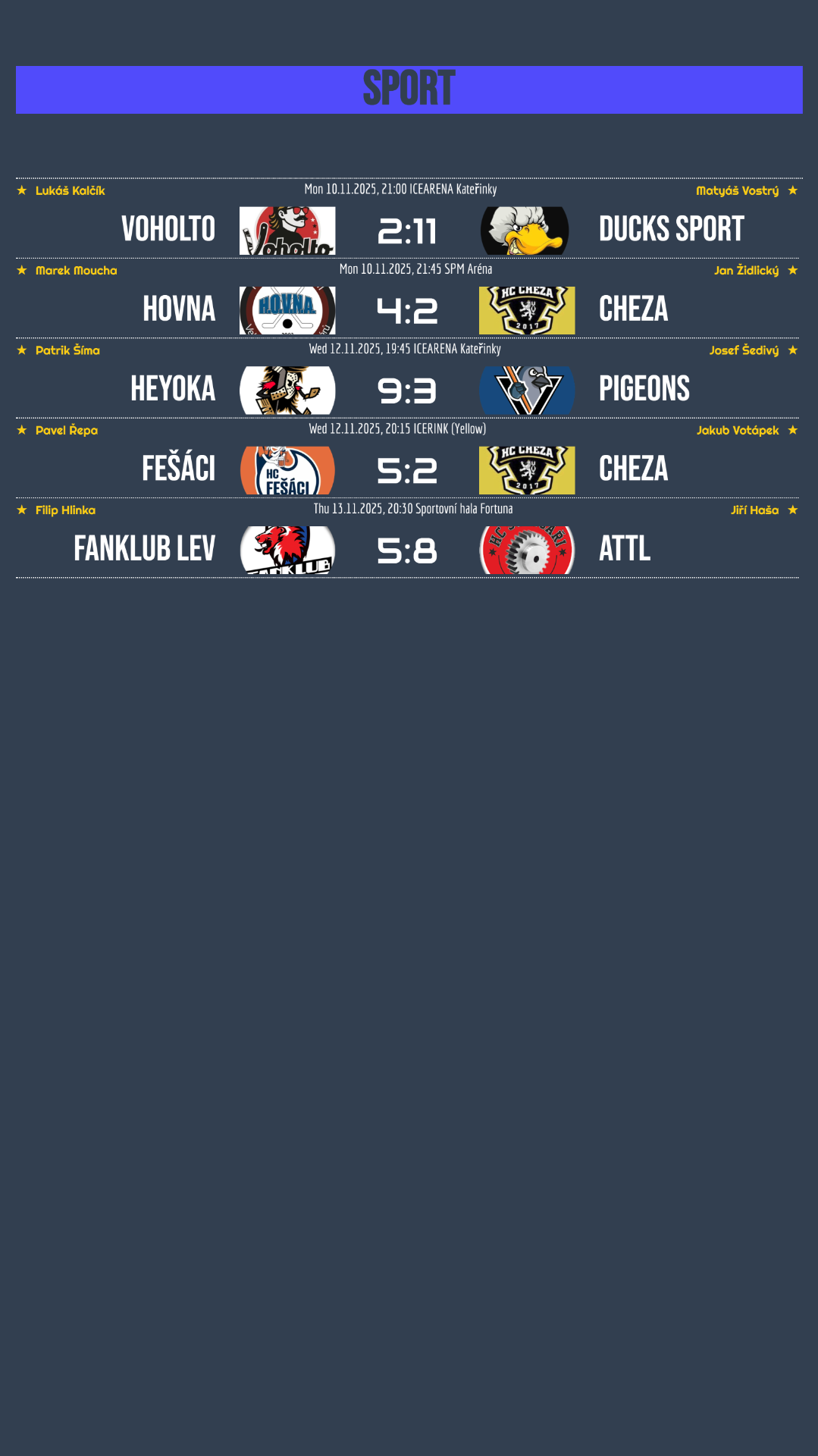 V Sport divizi pokračuje napínavý průběh soutěže, přičemž HC Fešáci zůstávají stále bez prohry a potvrzují, že patří mezi hlavní favority divize. Nechyběly ani výrazné výsledky – HC Ducks Praha Sport a Heyoka Praha předvedli vysoké výhry, které ukázaly jejich sílu a schopnost.