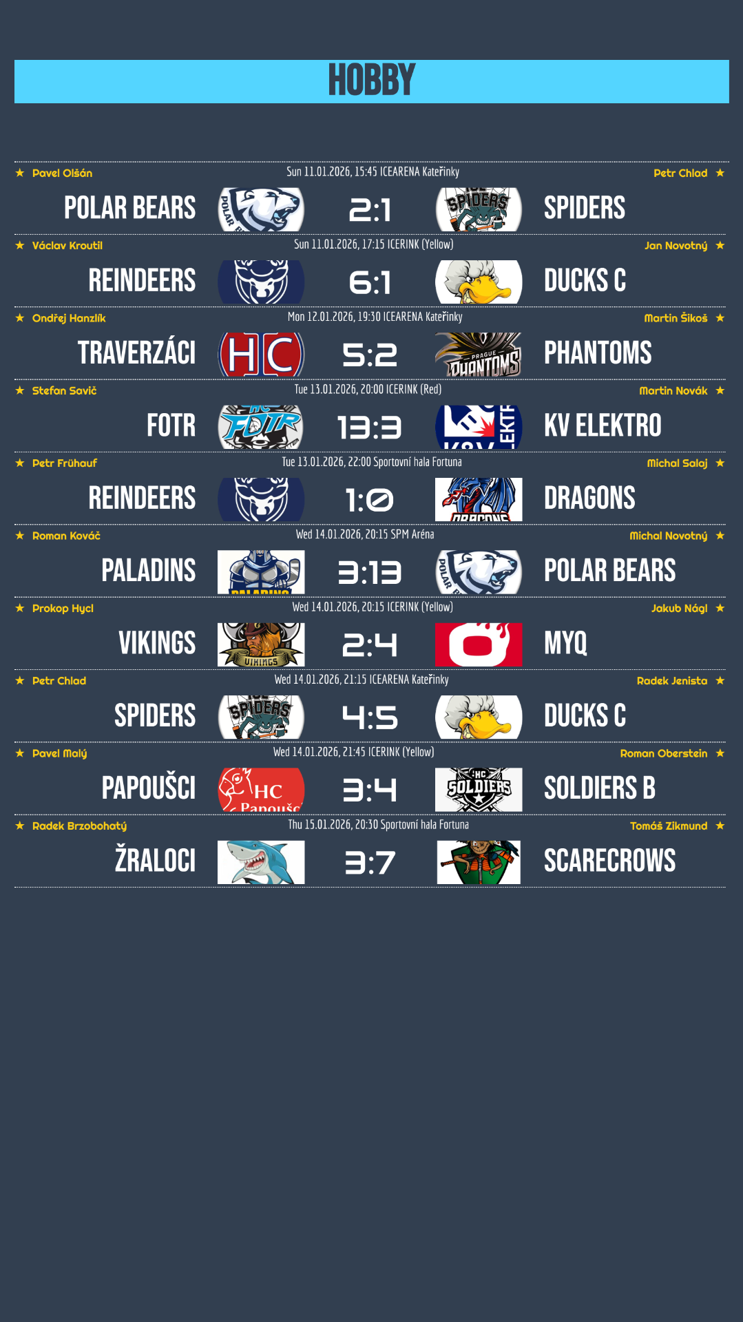 AHA Reindeers mohou být spokojení! Nejprve si s přehledem poradili s Ducks C a následně zvládli i velmi těsný duel s PHT Dragons. Dařilo se také Polar Bears, kteří sice narazili na houževnaté Ice Spiders, ale po bojovném výkonu urvali výhru 2:1. Následný zápas odehráli ve velkém stylu, když nasázeli třináct gólů Profinit Paladins, stejný gólový příděl si připsal i Fotr proti KV Elektru. Pozitivní sérii drží také Soldiers B, kteří po výhře nad Papouškama slaví už čtvrté vítězství v řadě a dál se posouvají tabulkou vzhůru! Ducks C sice nestačili na Reindeers, ale rychle se oklepali a ve velmi vyrovnaném utkání dokázali přetlačit Ice Spiders 5:4.
