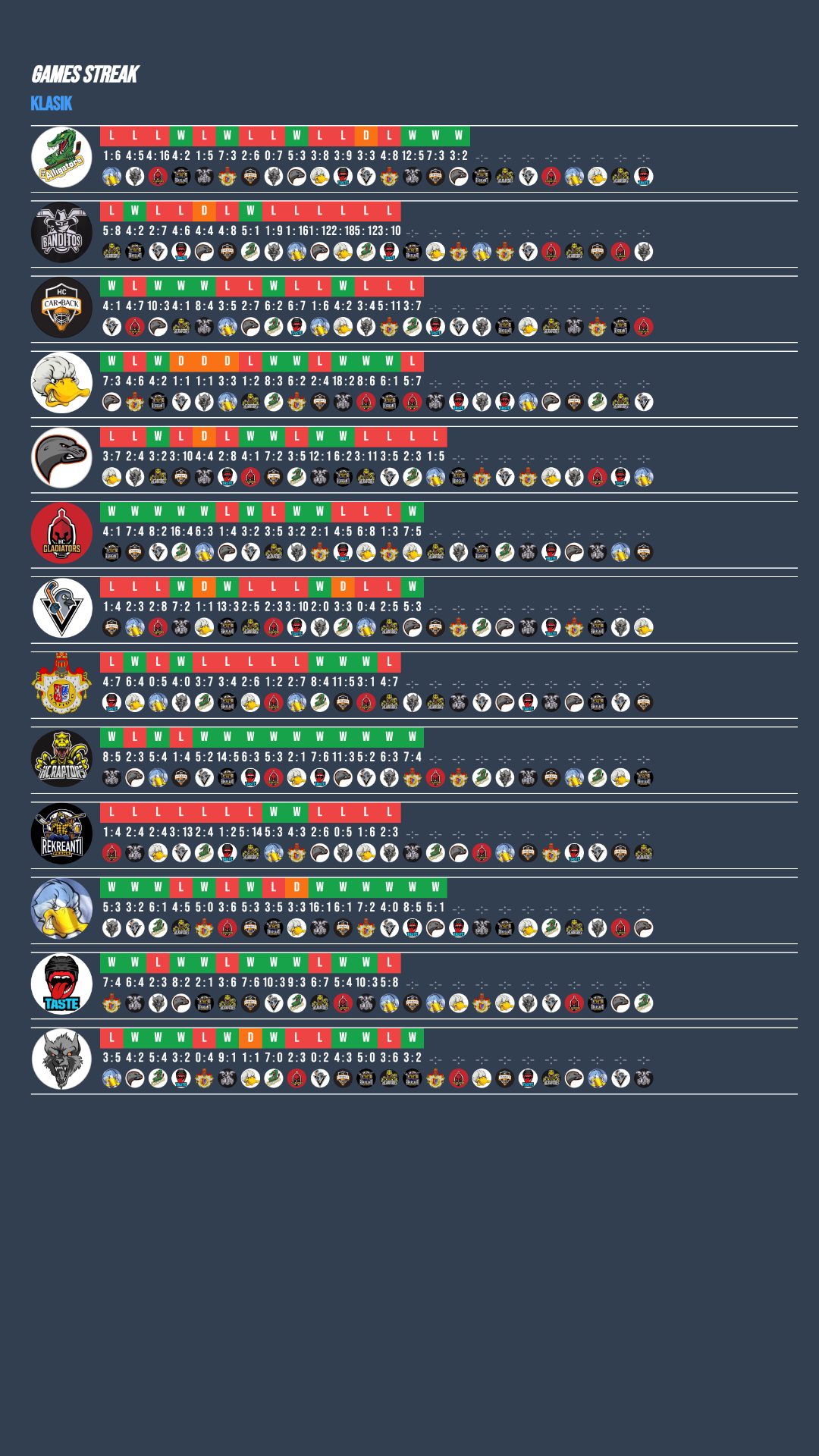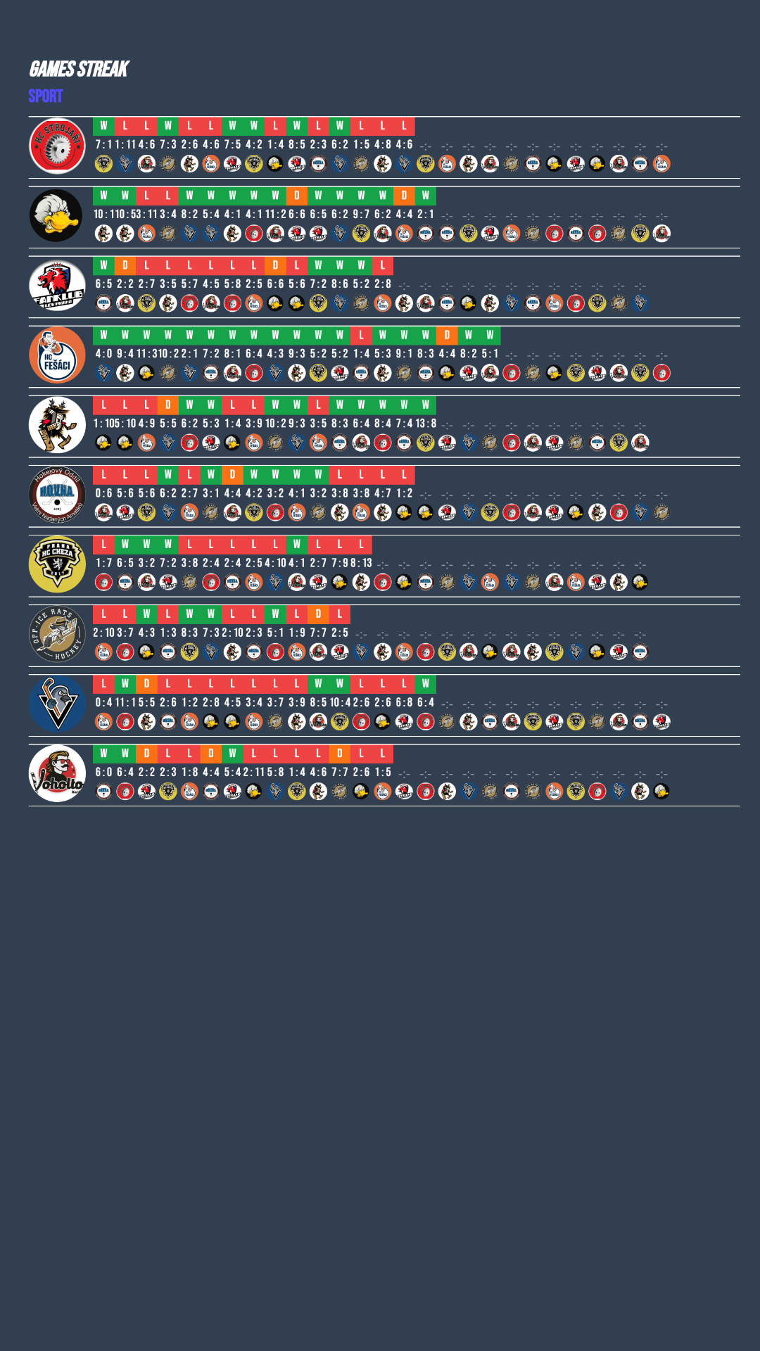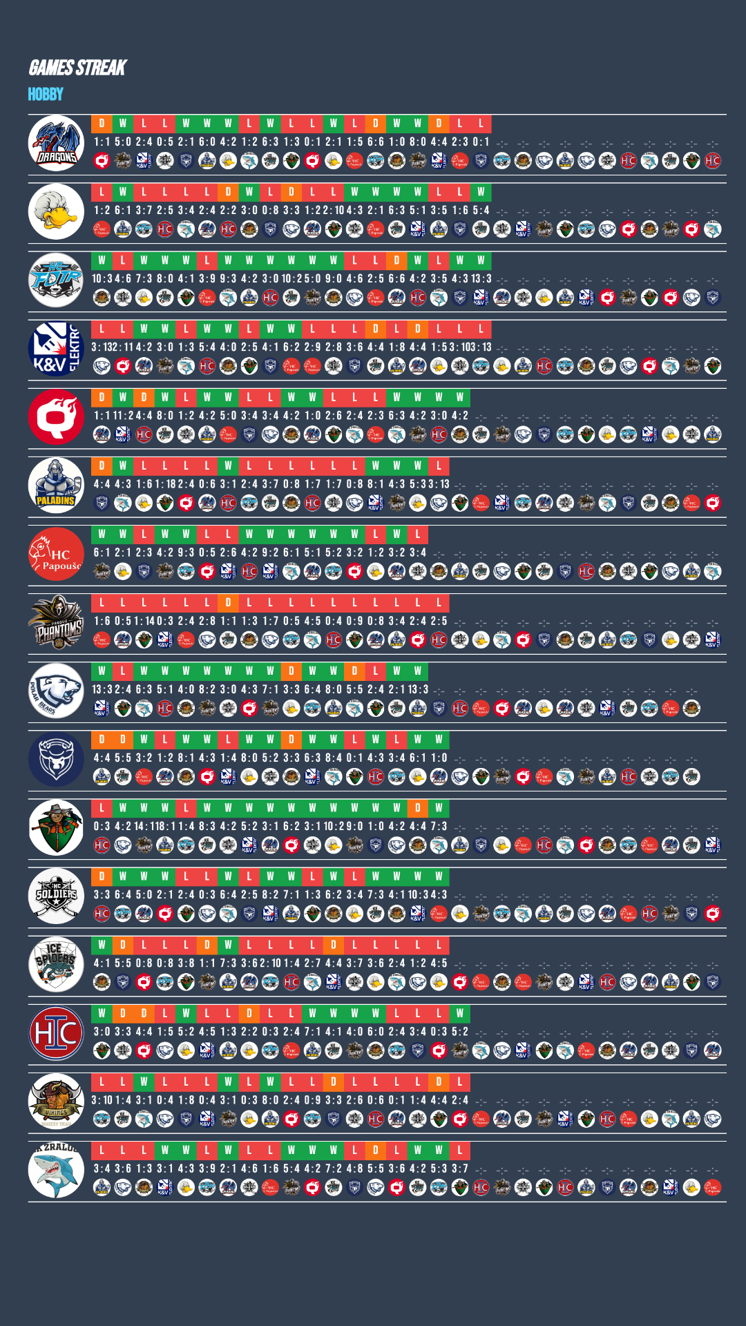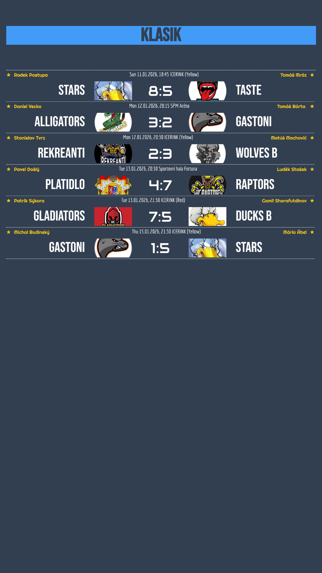 Ducks Stars prožívají parádní období. Připsali si hned dvě vítězství, udrželi si druhé místo v tabulce a jejich série se natáhla už na šest zápasů bez ztráty bodu. Výbornou formu potvrzují také Alligators, kteří zvládli duel s Gastonama a zapsali si už třetí výhru v řadě! Rezerva Wolves si připsala dva body po výhře 3:2 nad Rekreanty. Na čele tabulky zůstávají stále Raptors, kteří neponechali nic náhodě a bez větších komplikací si poradili s Platidlem. Po náročném období se konečně dočkali také Gladiators, kteří se po třech porážkách v řadě dokázali zvednout a ve velmi vyhroceném utkání přetlačili Ducks B!