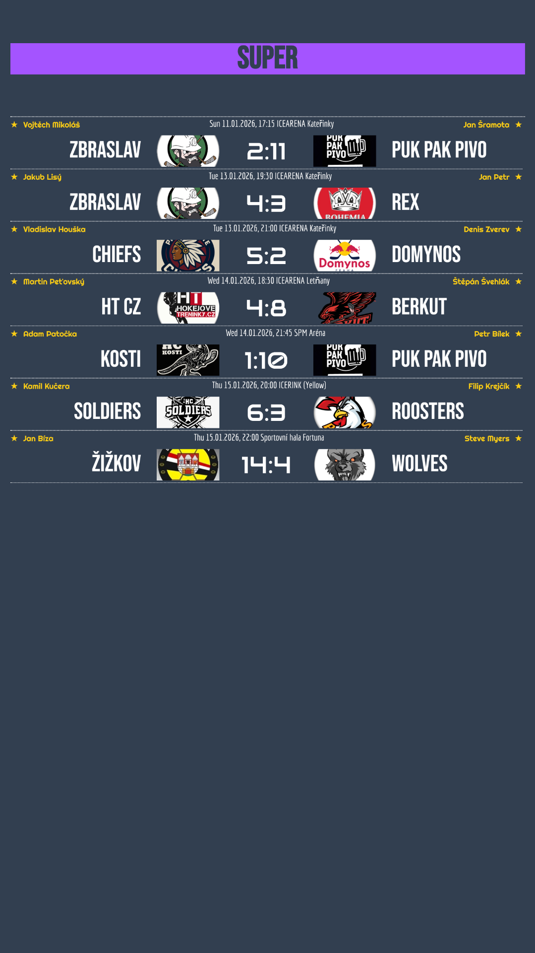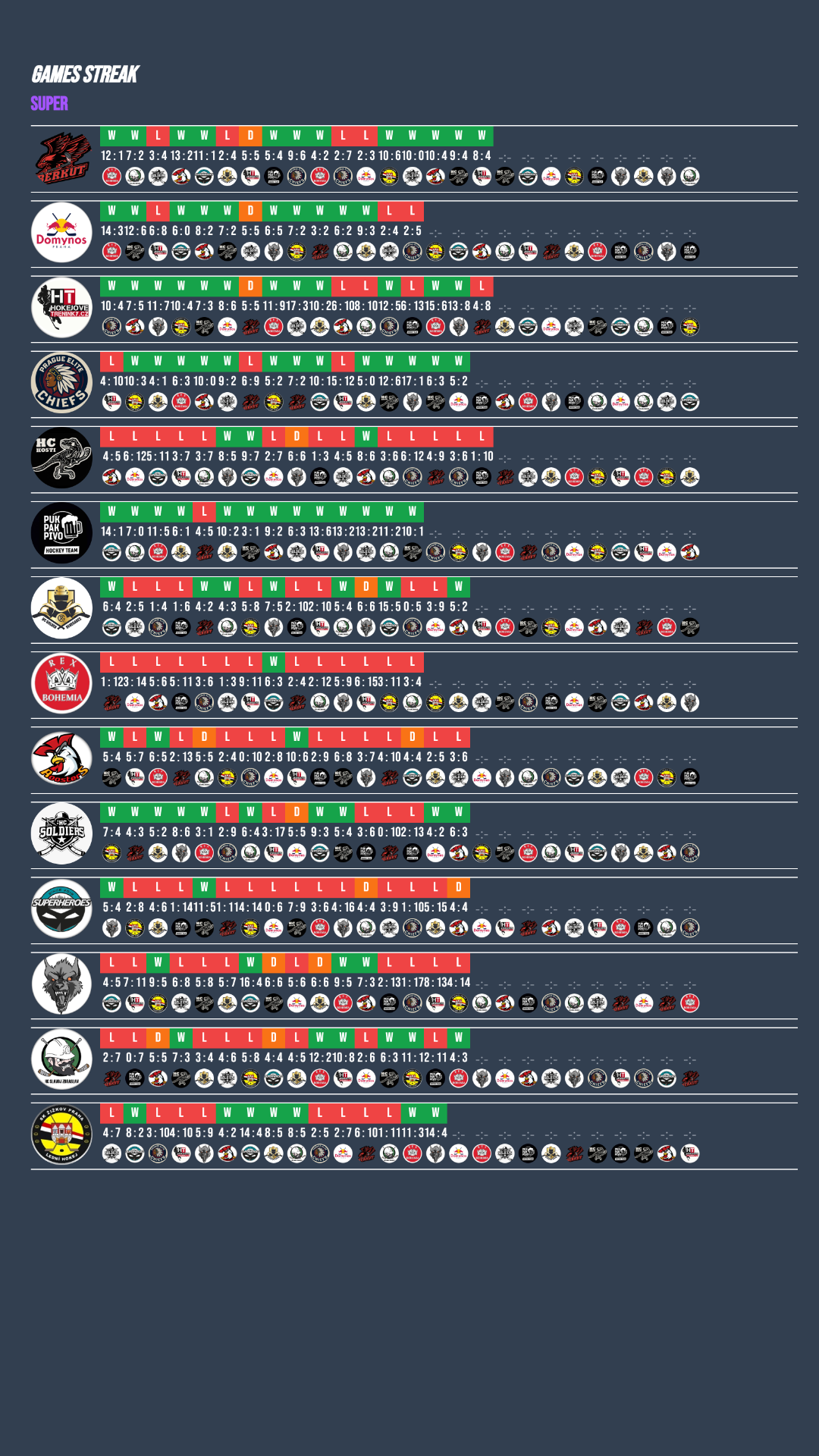 PUK PAK PIVO se po vítězstvích nad Zbraslaví a Kostí vyšvihlo na první místo a dál potvrzuje fantastickou formu a aktuálně drží už devět výher v řadě! Zbraslav si porážku dokázala rychle vynahradit, když si poradila s týmem REX 4:3. Dařilo se také Prague Elite Chiefs, kteří v těžkém utkání přehráli Domynos a protáhli svou sérii bez ztráty bodu už na pět zápasů. Berkut Praha zvládl klíčový duel v Letňanech, kde výhrou sesadil Hokejové tréninky z první pozice, sám si ale udržel třetí místo a slaví, stejně jako Chiefs, páté vítězství v řadě. Bodově uspěli i Soldiers po výhře 6:3 nad Roosters a Žižkov, který čtrnáctigólovým přídělem doslova smetl Vlky.