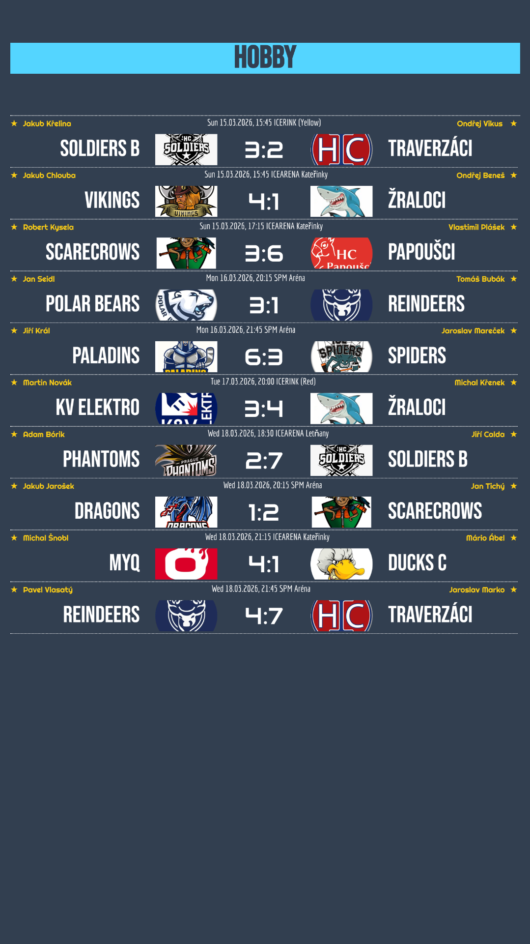 Soldiers B potvrdili svou sílu, když si poradili jak s Traverzáky, tak s Phantoms a připsali si dvě cenné výhry. Dařilo se také Vikings, kteří zvládli duel se Žraloky a zvítězili 4:1. Žraloci ale dokázali rychle zareagovat a v dalším utkání si spravili chuť výhrou nad KV Elektro. Naopak nepovedený týden zažili Reindeers, kteří nedokázali bodovat ani v jednom ze svých zápasů a podlehli jak Polar Bears, tak i Traverzákům. Vítězství slavili Paladins i MyQ Heroes, kteří si připsali důležité body do tabulky. Zajímavý vývoj měl také výkon Strašáků. Po porážce s Papoušky dokázali zabrat a v dalším utkání přehráli Dragons. O jejich vítězství rozhodla až branka 15 vteřin před koncem, která jim zajistila cenné dva body!