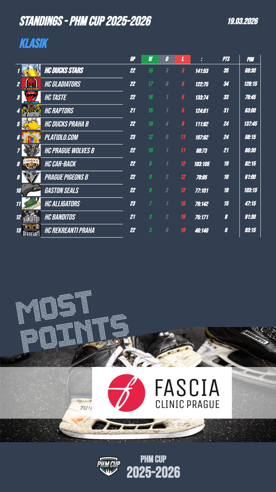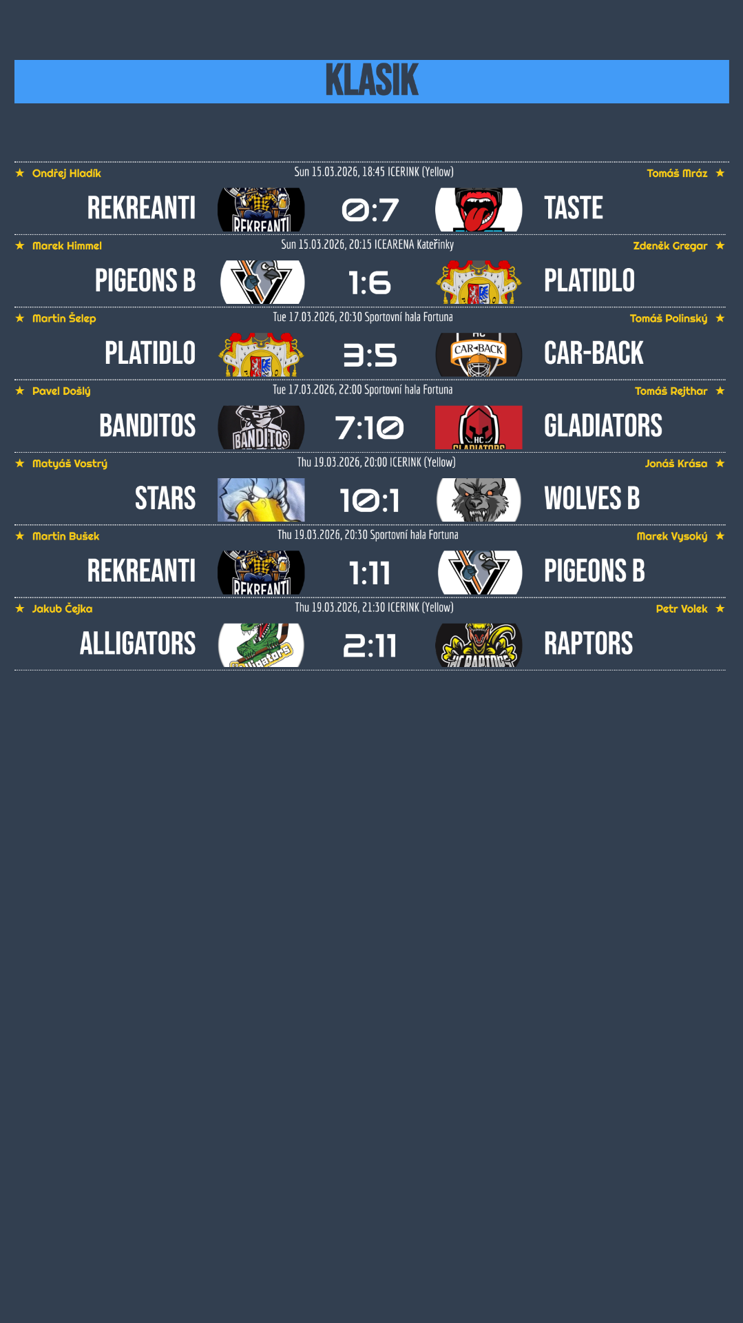 Rekreanti vyšli naprázdno, když nedokázali bodovat ani v jednom ze svých utkání. Podlehli jak Taste, tak i Pigeons B a zaznamenali tak bezbodový týden. Rozporuplné výsledky má za sebou Platidlo. V prvním zápase sice dokázalo přehrát rezervu Pigeons, ale v dalším utkání už nestačilo na Car-Back. Střeleckou přestřelku nabídli Gladiators s Banditos. Po divokém průběhu nakonec zvítězili Gladiators 10:7 a připsali si další výhru. Čtvrteční program pak patřil jednoznačným výsledkům. Ducks Stars, Pigeons B i Raptors předvedli ofenzivní konzert a své soupeře zasypali aspoň deseti góly!