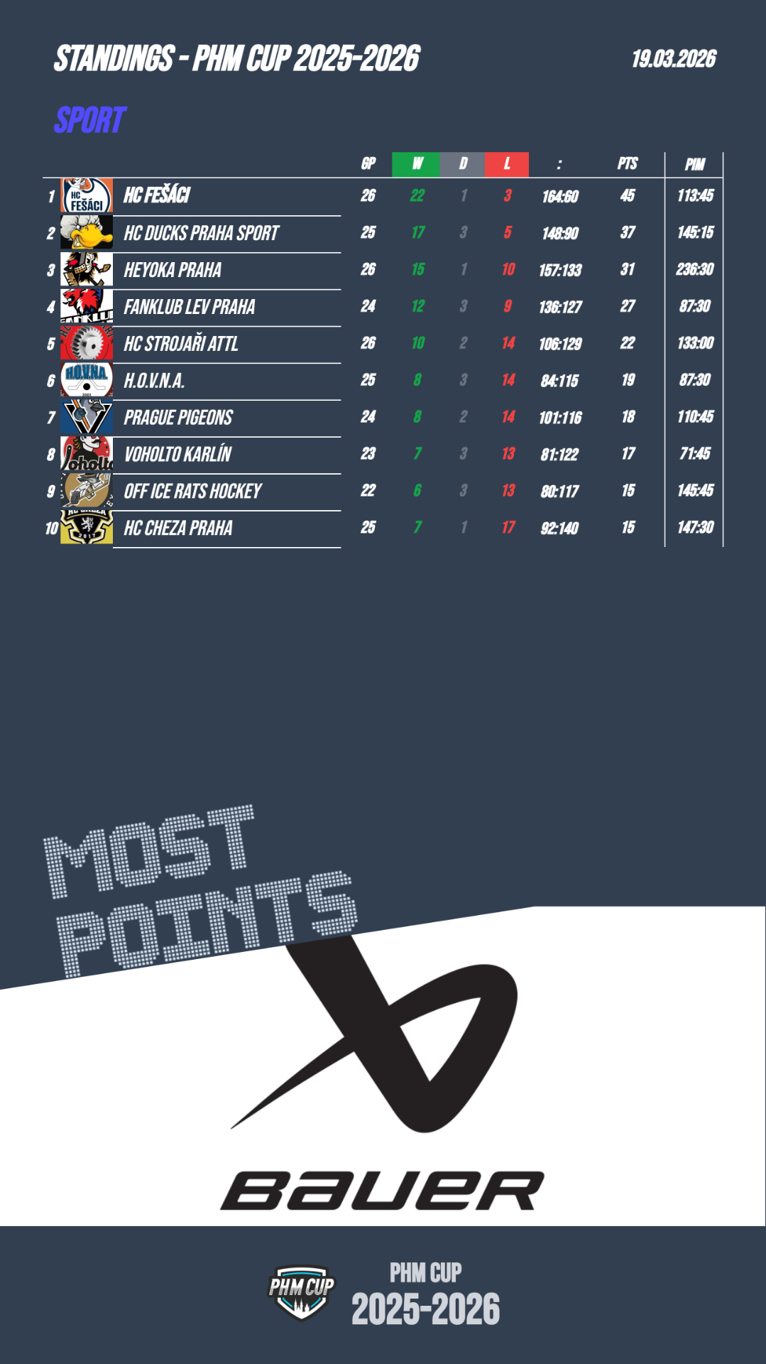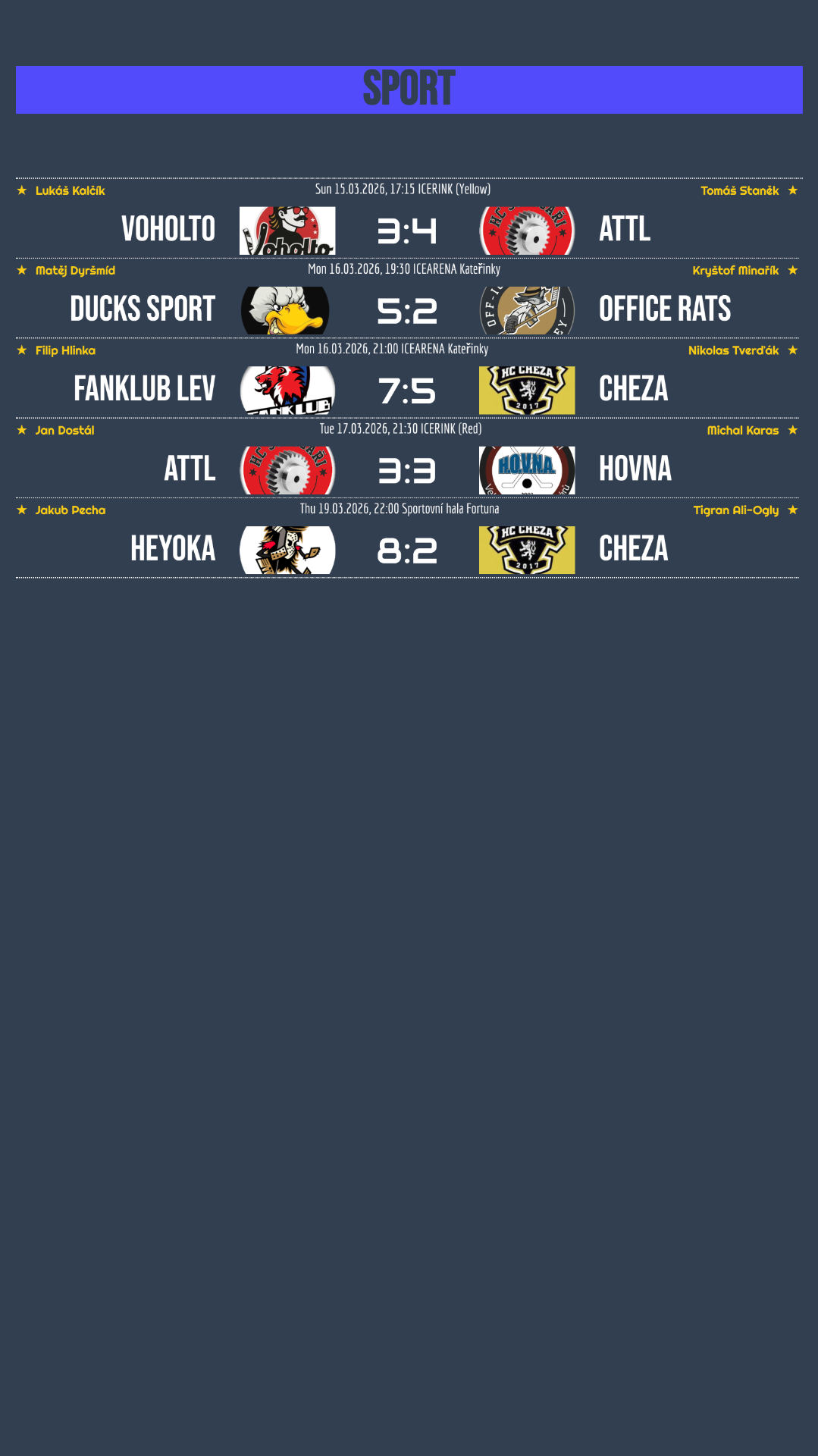 Strojaři vstoupili do týdne úspěšně, když v prvním utkání porazili Voholto Karlín těsně 4:3. Ve svém dalším zápase pak znovu sahali po bodech, ale nakonec se museli spokojit s remízou, když si body rozdělili s H.O.V.N.A. Ducks Sport dokázali zareagovat na porážku z minulého týdne a v dalším utkání si poradili s Office Rats. Naopak méně vydařený týden má za sebou Cheza, která nedokázala bodovat ani v jednom ze svých zápasů. Nejprve nestačila na Fanklub Lev a následně ani na Heyoku, která tak využila příležitosti a připsala si cenné vítězství.