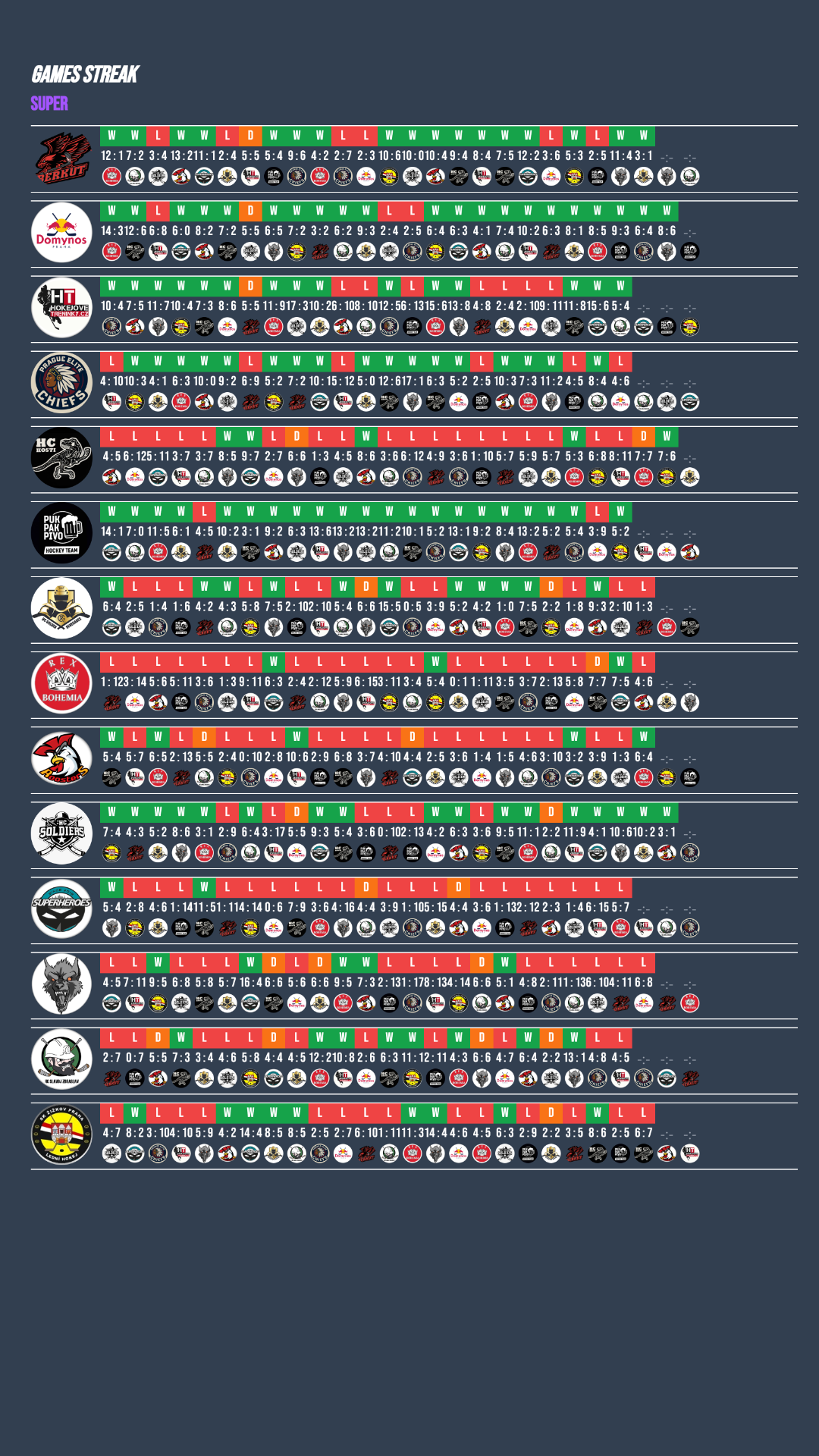 REX si připsali teprve třetí výhru v sezóně, když ve vyrovnaném utkání dokázali porazit Superheroes. Nebyli daleko ani od dalšího bodového zisku. Proti Roosters dlouho drželi krok, ale v závěrečné minutě dvakrát inkasovali a vítězství tak nakonec připadlo jejich soupeři! Vyrovnaný duel odehráli také Wolves, kteří ale nakonec nestačili na Domynos a podlehli 6:8. Další dramatický moment přišel v utkání Žižkov vs Kosti, kde rozhodla až branka v poslední minutě. Ta zajistila hostům těsné vítězství a spokojený týden. Těžké utkání zvládl také Berkut, který si poradil s Golden Renegades!