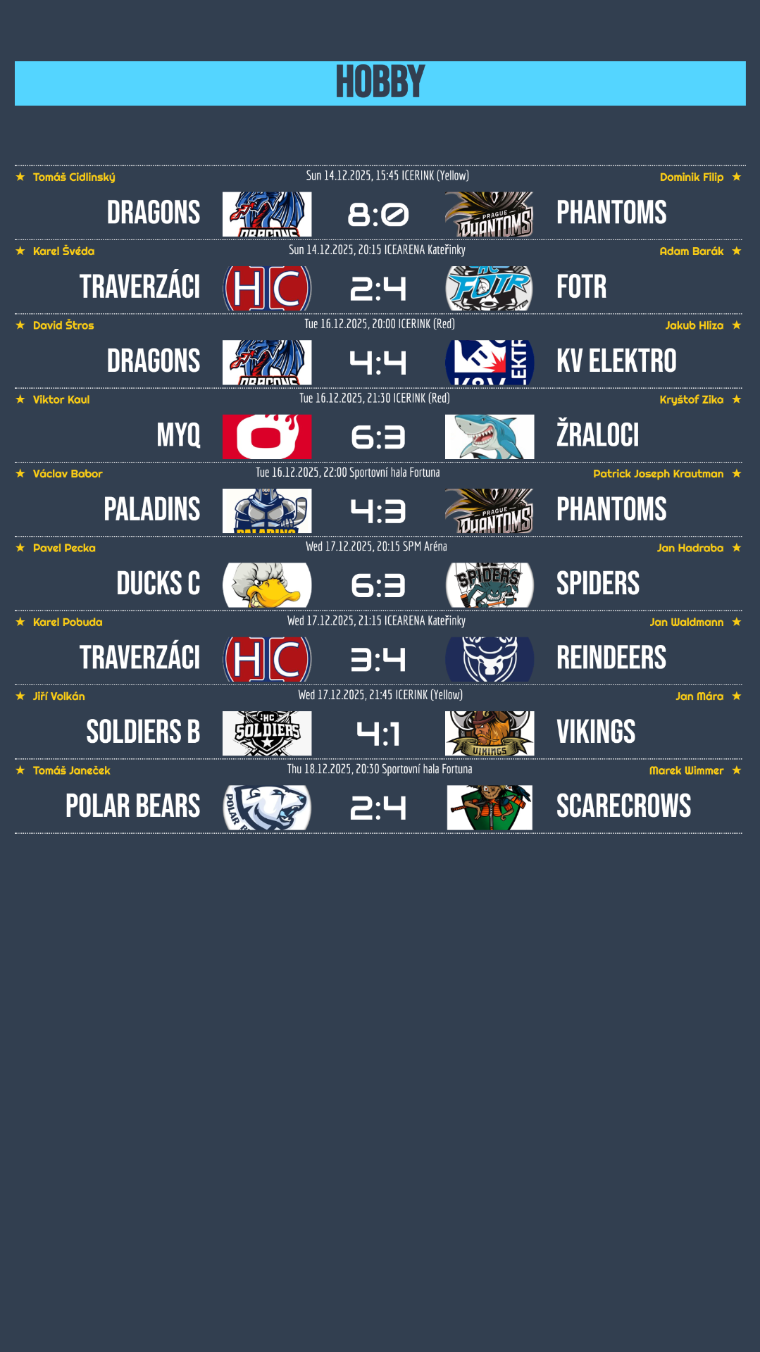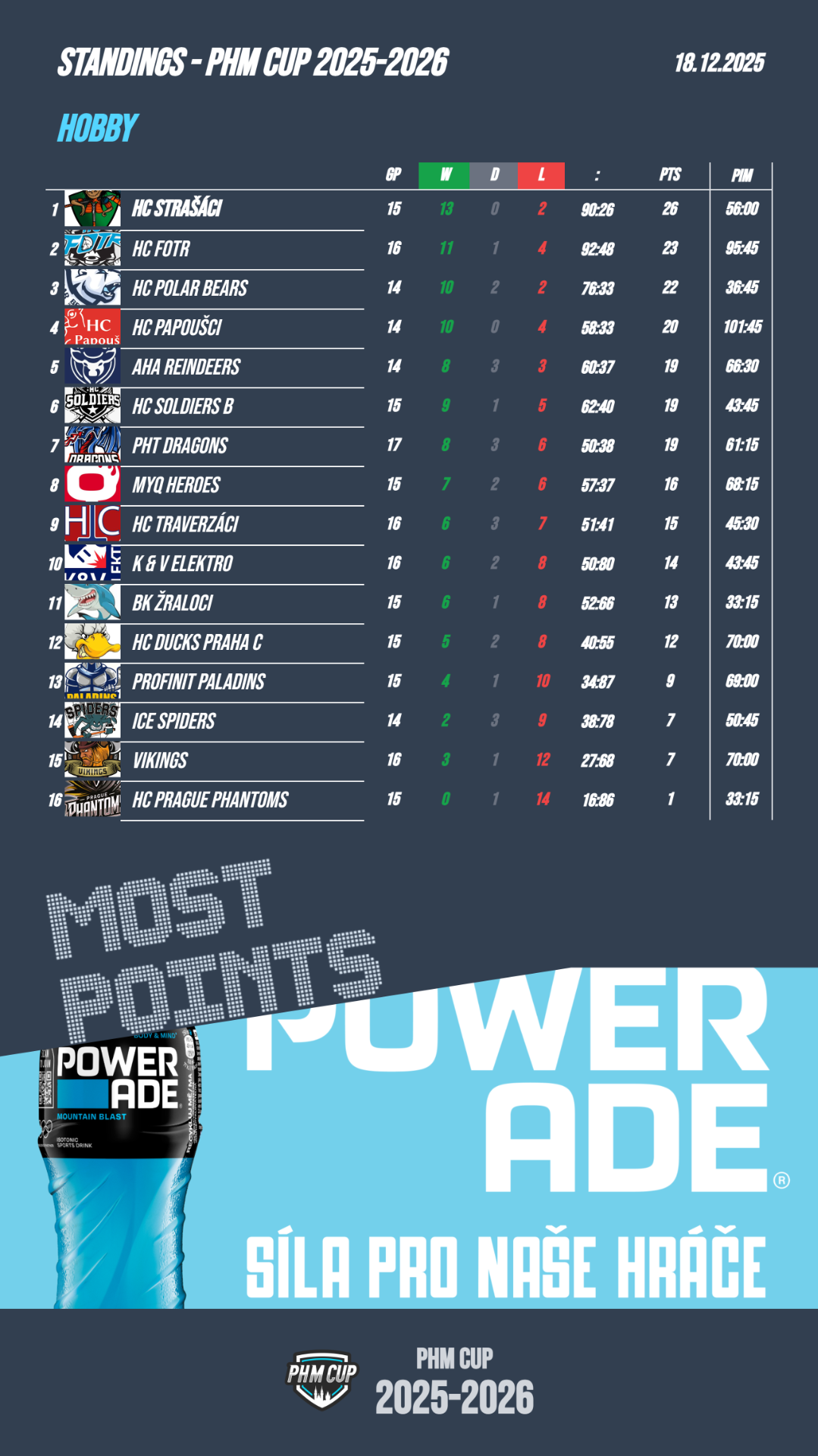 Traverzáci neprožili povedený týden a ze dvou odehraných zápasů si neodnesli ani bod. Profinit Paladins navázali na výhru z minulého týdne a po těsném souboji si poradili s Phantoms 4:3! HC Strašáci si ve čtvrtek vyšlápli na třetí Polar Bears, které porazili 4:2 a tím si udrželi první příčku v tabulce! Jejich dominance se navíc odráží i v individuálních statistikách. V TOP 5 kanadského bodování se nachází hned tři hráči v čele s Ondřejem Babkou, který má na kontě 36 bodů. Další dva hráči v elitní pětce pak patří týmu HC Fotr!