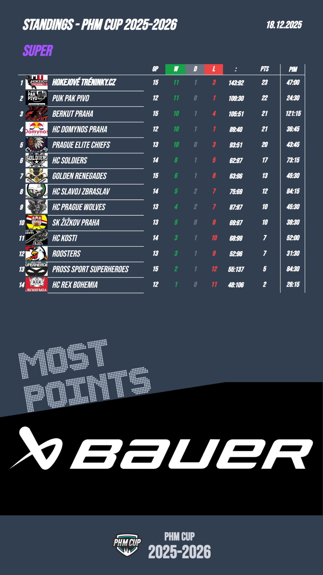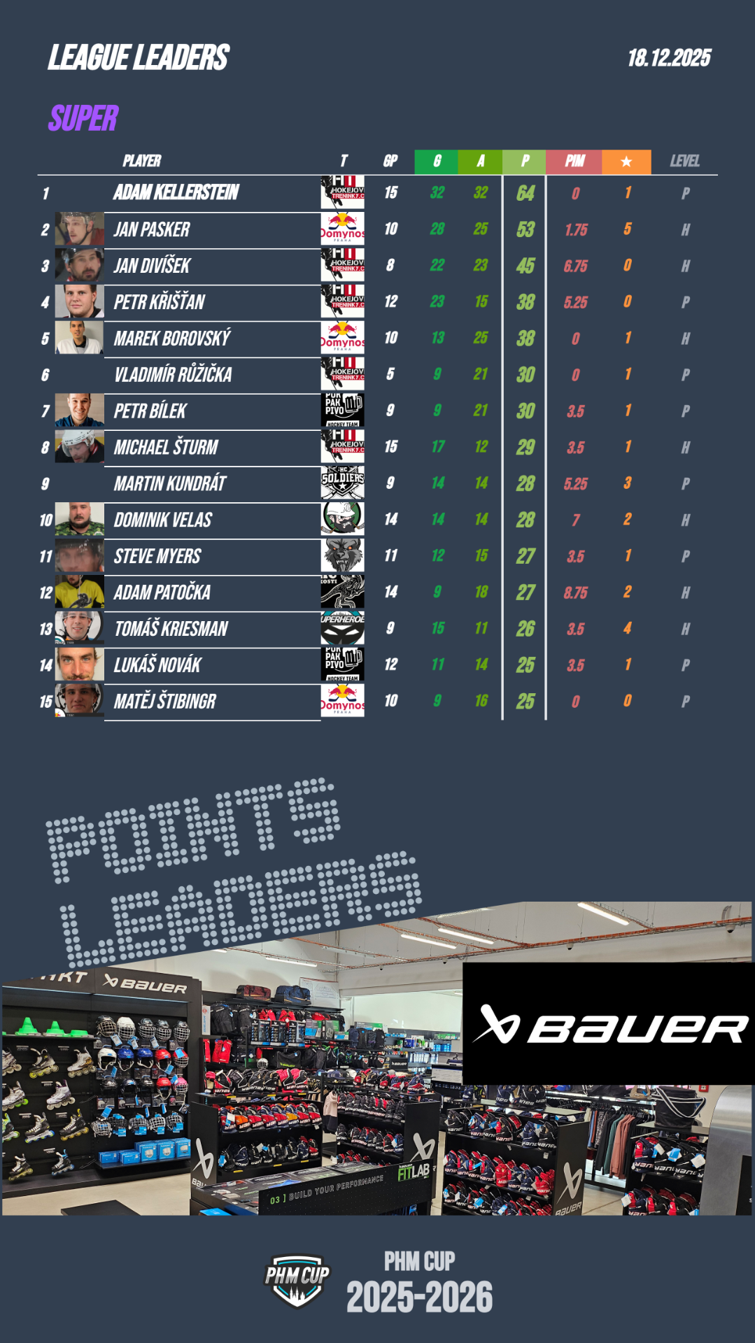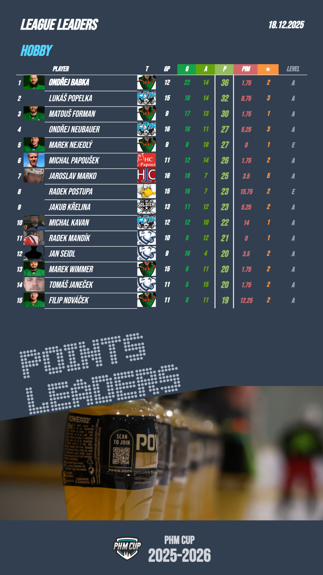 Góly se tento hrací týden opravdu nešetřilo! V každém utkání padlo alespoň 10 branek a diváci se rozhodně nenudili. Berkut slavil dvě výhry a nastřílel dohromady 20 gólů, zatímco PUK PAK PIVO si vedlo ještě lépe, když během dvou zápasů nasázelo svým soupeřům 26 branek a dotahuje se na vedoucí Hokejové Tréninky! V individuálních statistikách jednoznačně kraluje Adam Kellerstein, který nasbíral 64 bodů v 15 zápasech a drží si pozici lídra soutěže. Do TOP 5 se kromě něj dostali i jeho spoluhráči Jan Divíšek a Petr Křišťan, stejně tak i Jan Pasker a Marek Borovský z Domynos, kteří zároveň patří i do elitní pětky SPORT divize!