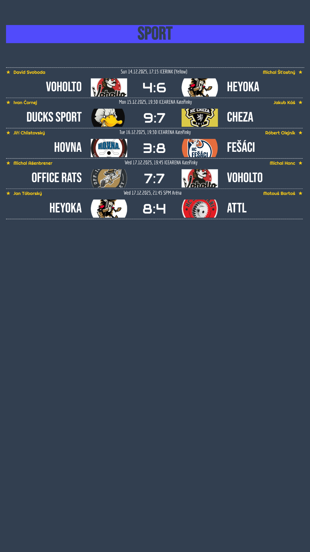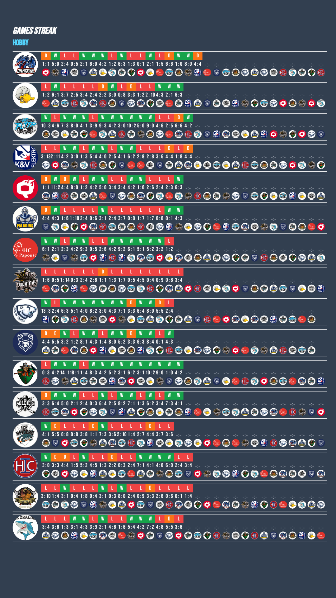 Heyoka si připsala hned dvě výhry a díky povedenému týdnu se posunula na 3. místo tabulky! Důležitý výsledek zaznamenali také HC Fešáci, kteří vrátili H.O.V.N.A. porážku z jejich posledního vzájemného duelu a tentokrát je přehráli jasně 8:3! Voholto Karlín si rozdělilo body po remíze s Off Ice Rats, zatímco Ducks Sport si poradilo s Chezou. Individuálním statistikám vévodí Jan Pasker, který nasbíral 36 bodů, těsně za ním se drží Šimon Kaňovský a Marek Borovský!