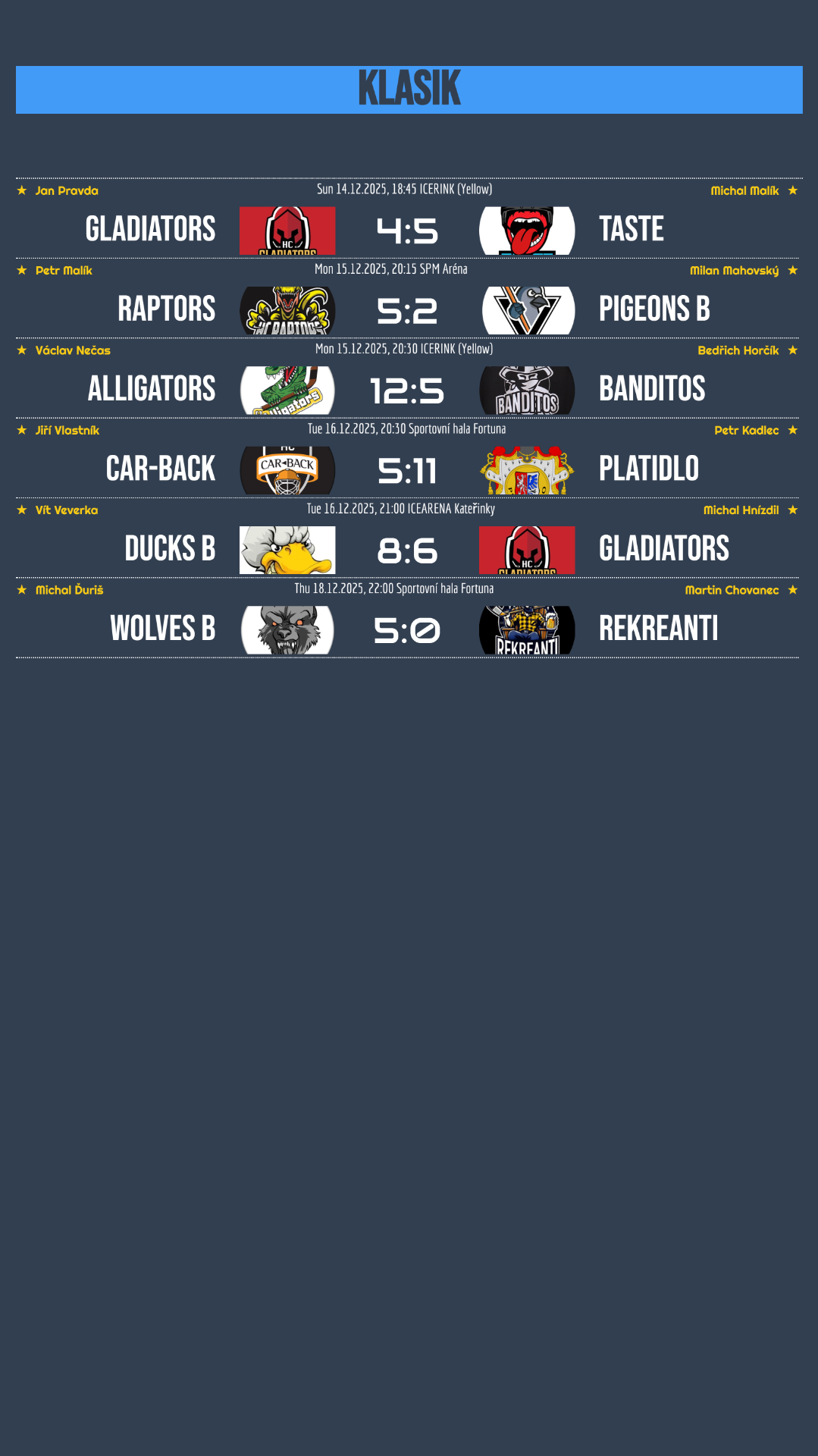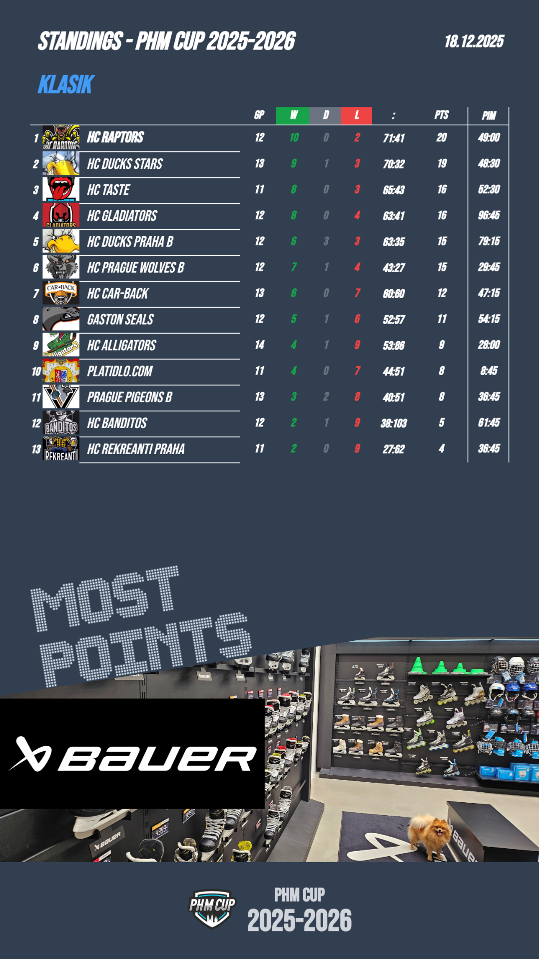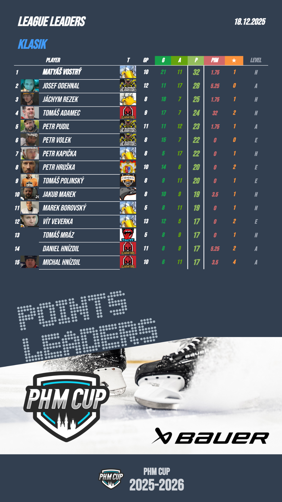 HC Raptors potvrdili svou formu vítězstvím 5:2 nad Pigeons B a přezimují tak na prvním místě tabulky! Důležitý výsledek si připsali HC Taste, kteří ve velmi vyrovnaném utkání dokázali přetlačit Gladiators 5:4. Ti zaváhali i v dalším zápase, když o dva dny později podlehli také Ducks B! Radost z výrazných vítězství mají i týmy Platidlo a HC Alligators, které si připsaly cenné body do tabulky. Individuálně pak kraluje Matyáš Vostrý, jenž se s 32 body v 10 utkáních usadil na čele kanadského bodování klasik divize!