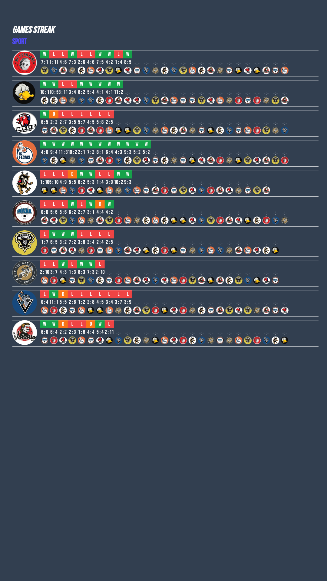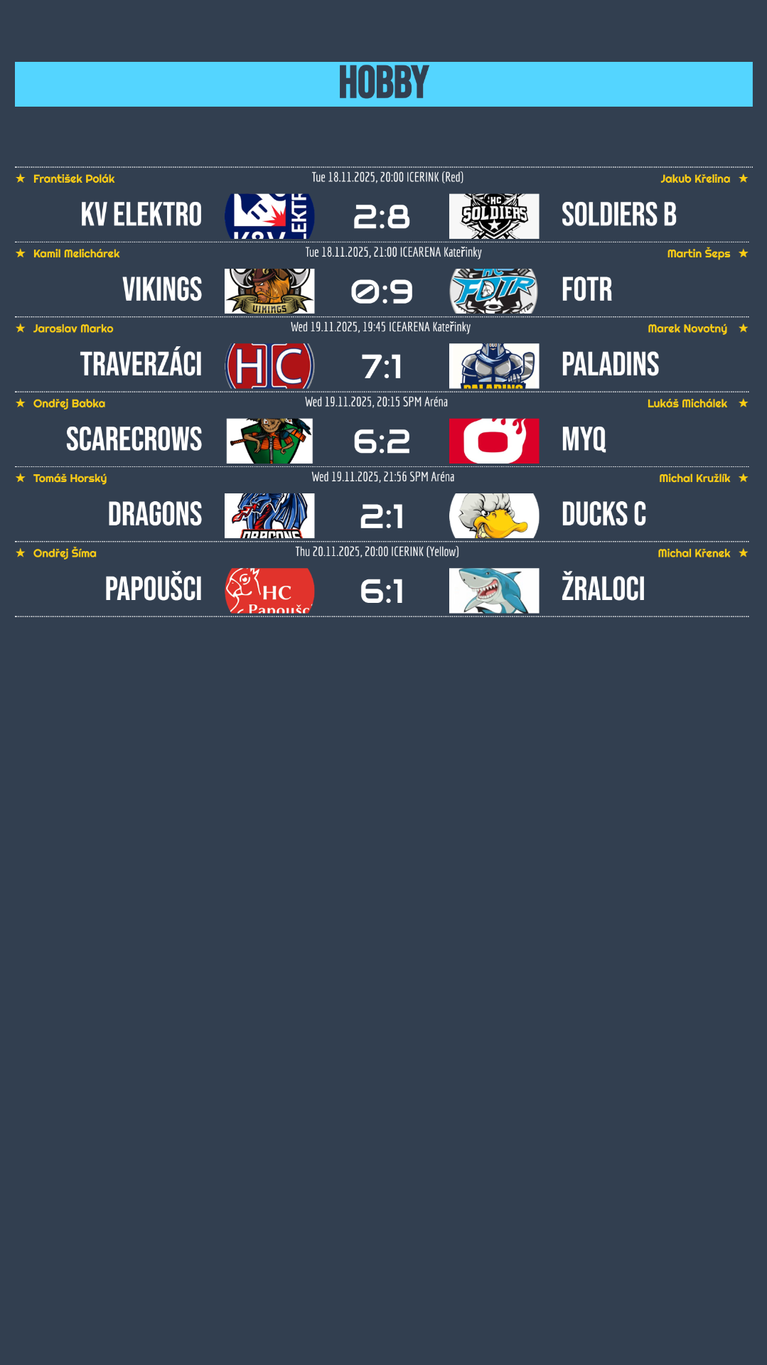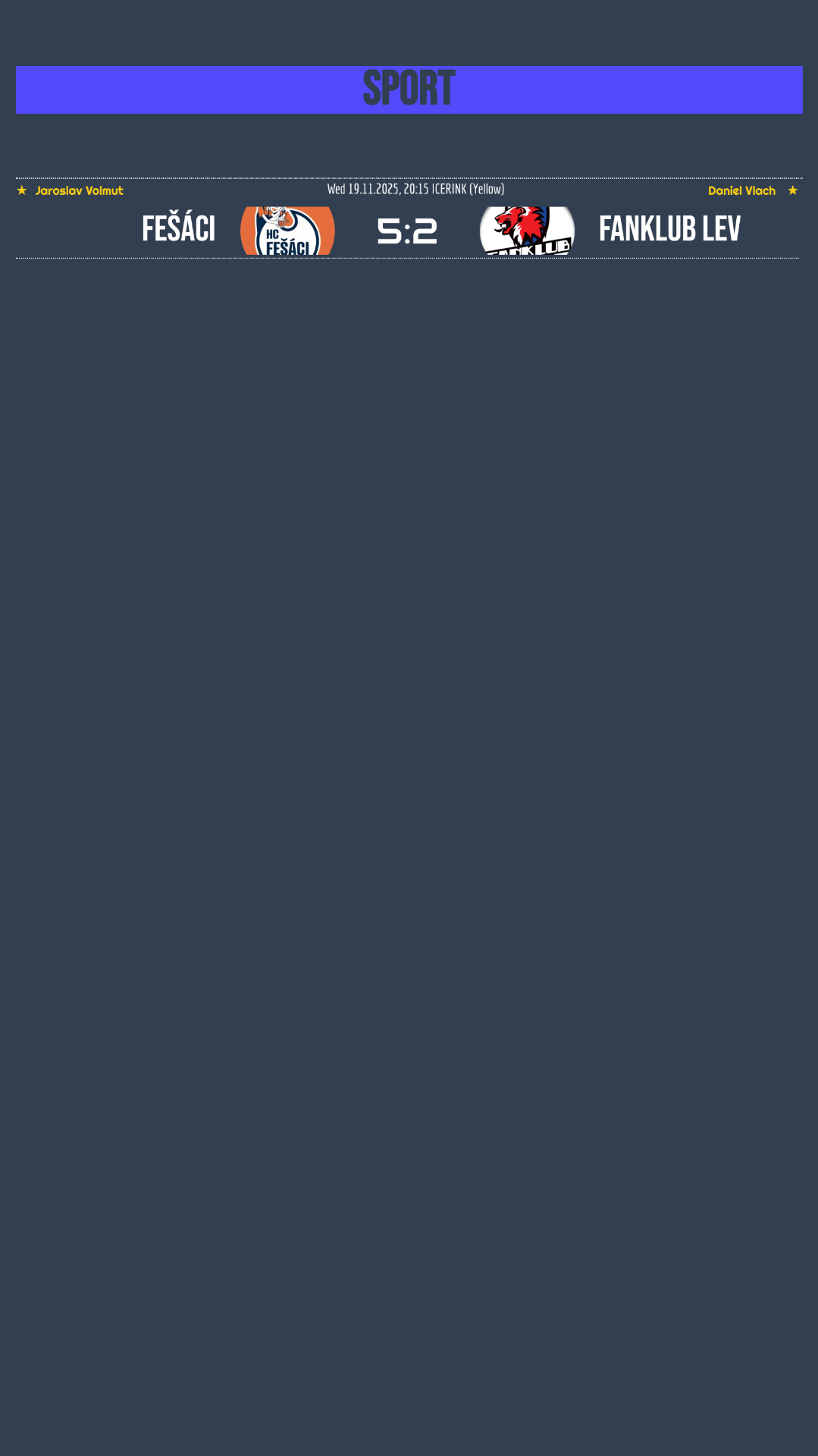 Jediný zápas ve Sport divizi se odehrál ve středu na Icerinku, kde tým HC Fešáci opět potvrdil roli favorita a odnesl si výhru 5:2! Po dvou gólech se trefili Jaroslav Volmut a Róbert Olejník. Příští hrací týden nás čekají hned 4 zápasy, tak se máte na co těšit!
