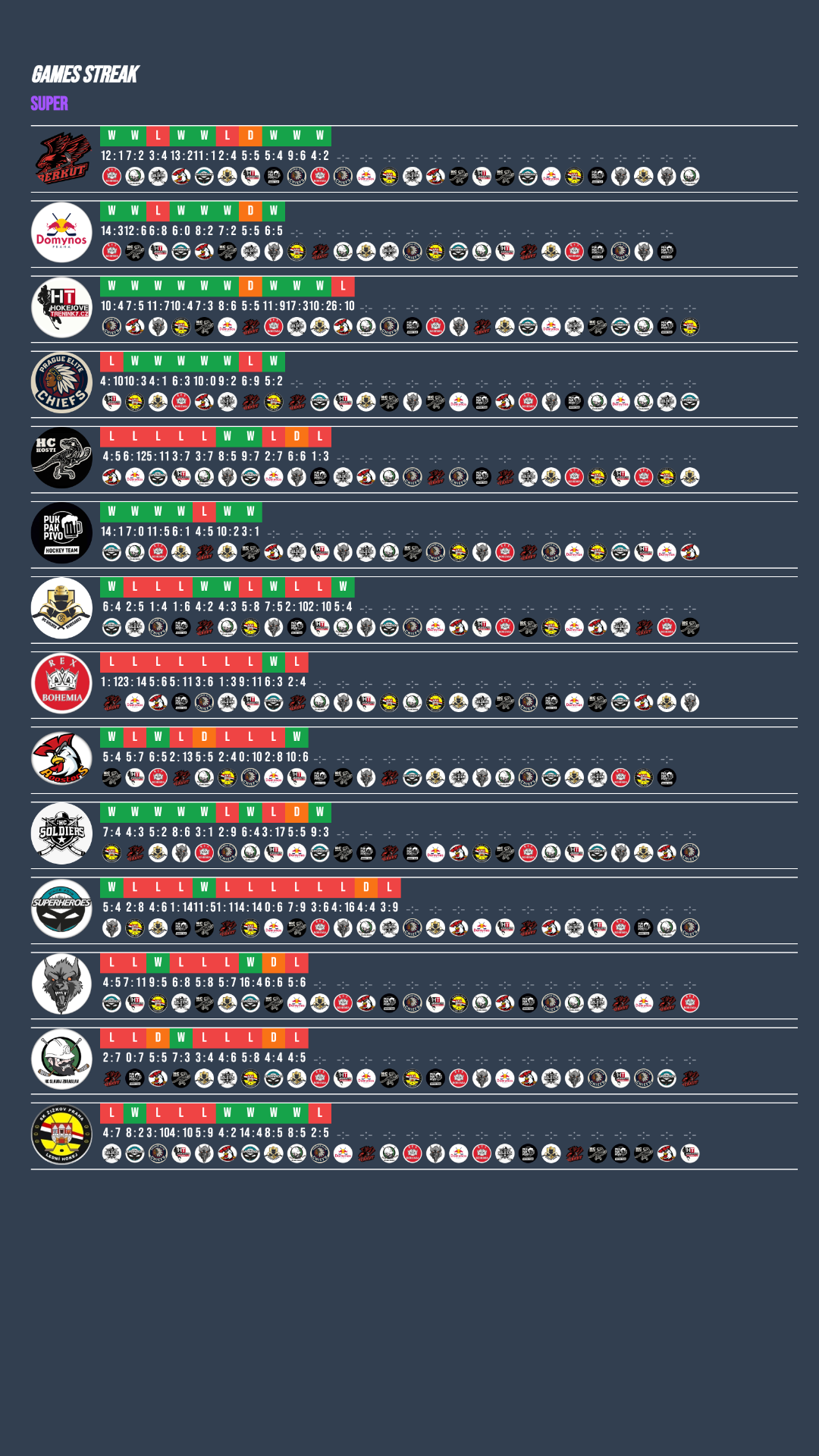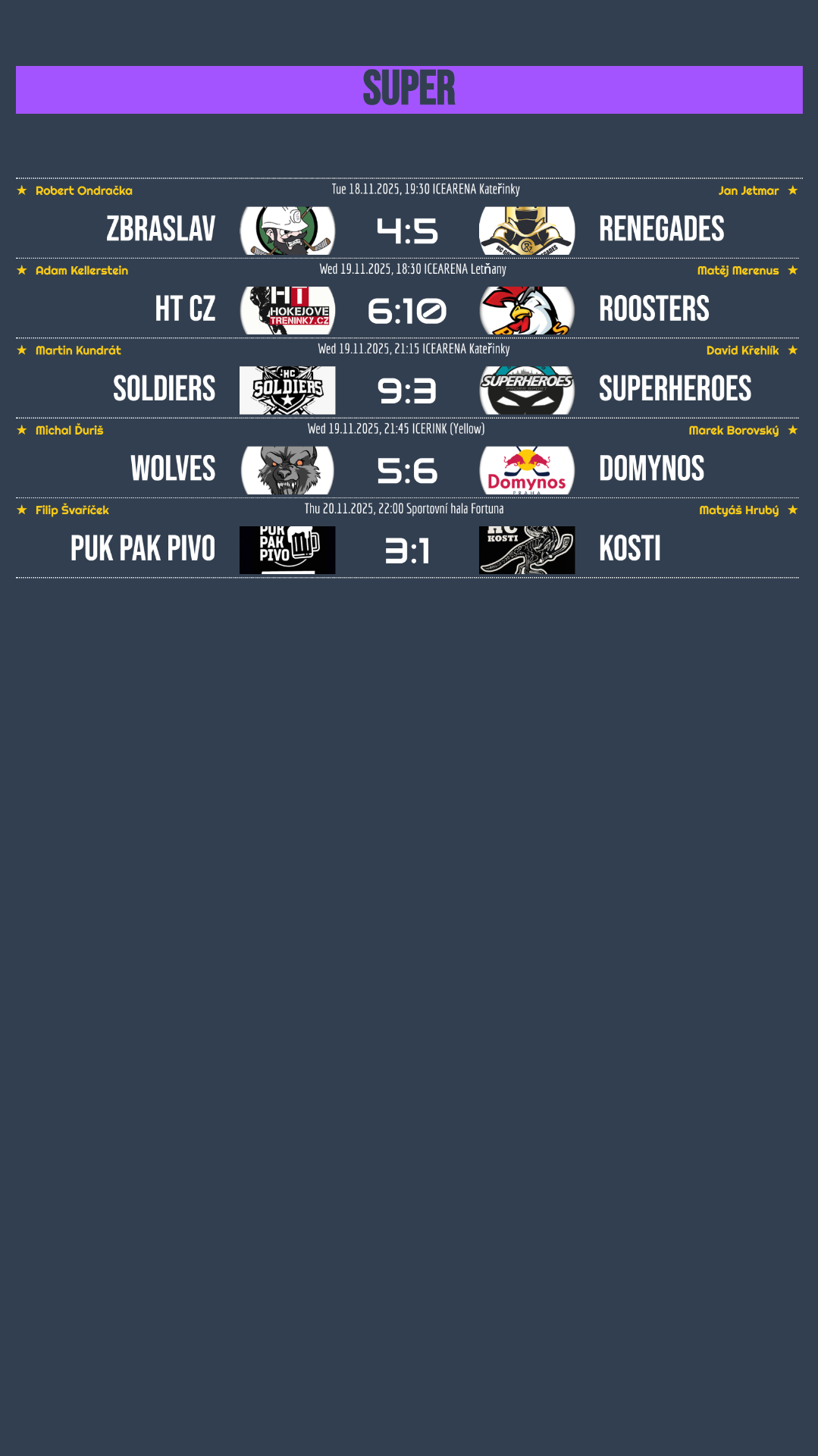 Super divize nabídla tento týden několik zajímavých momentů. Poprvé v sezóně prohráli Hokejové tréninky.cz! Matěj Merenus z Roosters zazářil 7 body a výrazně pomohl svému týmu k vítězství. Velký výkon předvedl také Martin Kundrát z HC Soldiers, který se také prosadil 7 body a přispěl k vysoké výhře svého týmu 9:3! Divoké utkání se odehrálo mezi týmy HC Prague Wolves a HC Domynos Praha, kdy se Matyášovi Vostrému podařilo vstřelit branku necelou minutu před koncem, čímž utkání rozhodl a přinesl týmu HC Domynos Praha cenné vítězství!