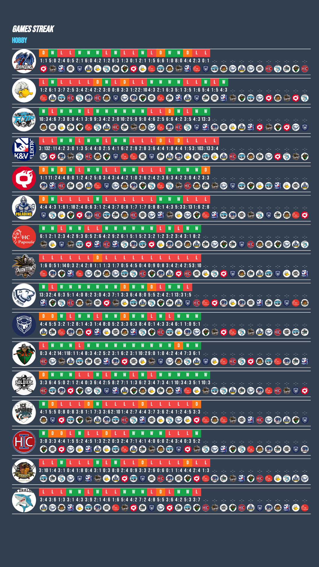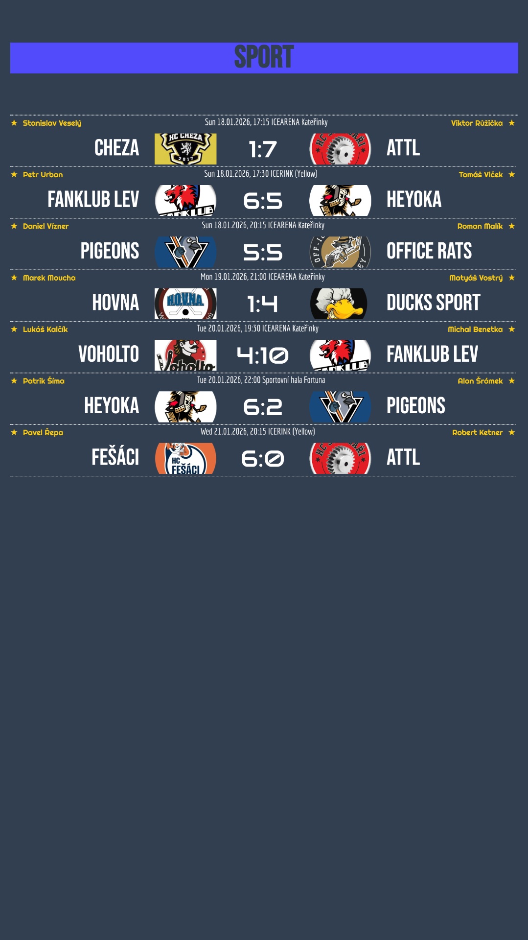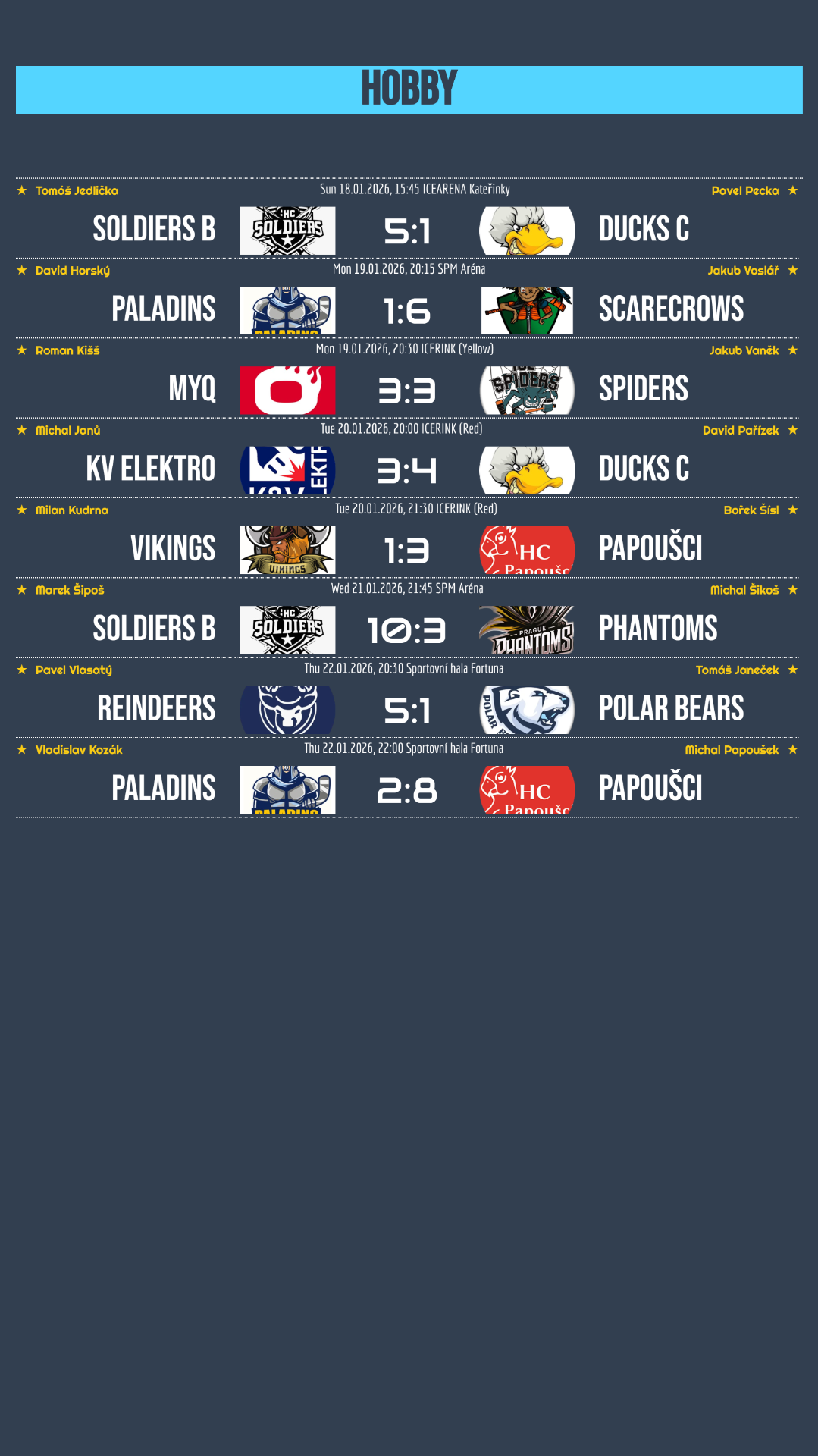 Soldiers B potvrdili skvělou formu, když si připsali dvě přesvědčivé výhry nad Ducks C a Phantoms a natáhli svou vítěznou šňůru už na šest zápasů v řadě! Stejně úspěšní byli také Papoušci, kteří zvládli těžký duel s dobře hrajícími Vikings a následně si poradili i s Paladins. Ducks C si alespoň částečně spravili chuť po nedělní porážce, když v utkání proti KV Elektro předvedli parádní obrat. I v deseti hráčích dokázali v posledních pěti minutách otočit nepříznivý stav 1:3 na konečných 4:3! Velmi cenné vítězství zaznamenali AHA Reindeers, kteří v náročném souboji přehráli silné Polar Bears 5:1. MyQ Heroes tentokrát pouze remizovali s Ice Spiders, což je může mrzet v boji o tabulku, zatímco pro Spiders jde o zisk cenného bodu.