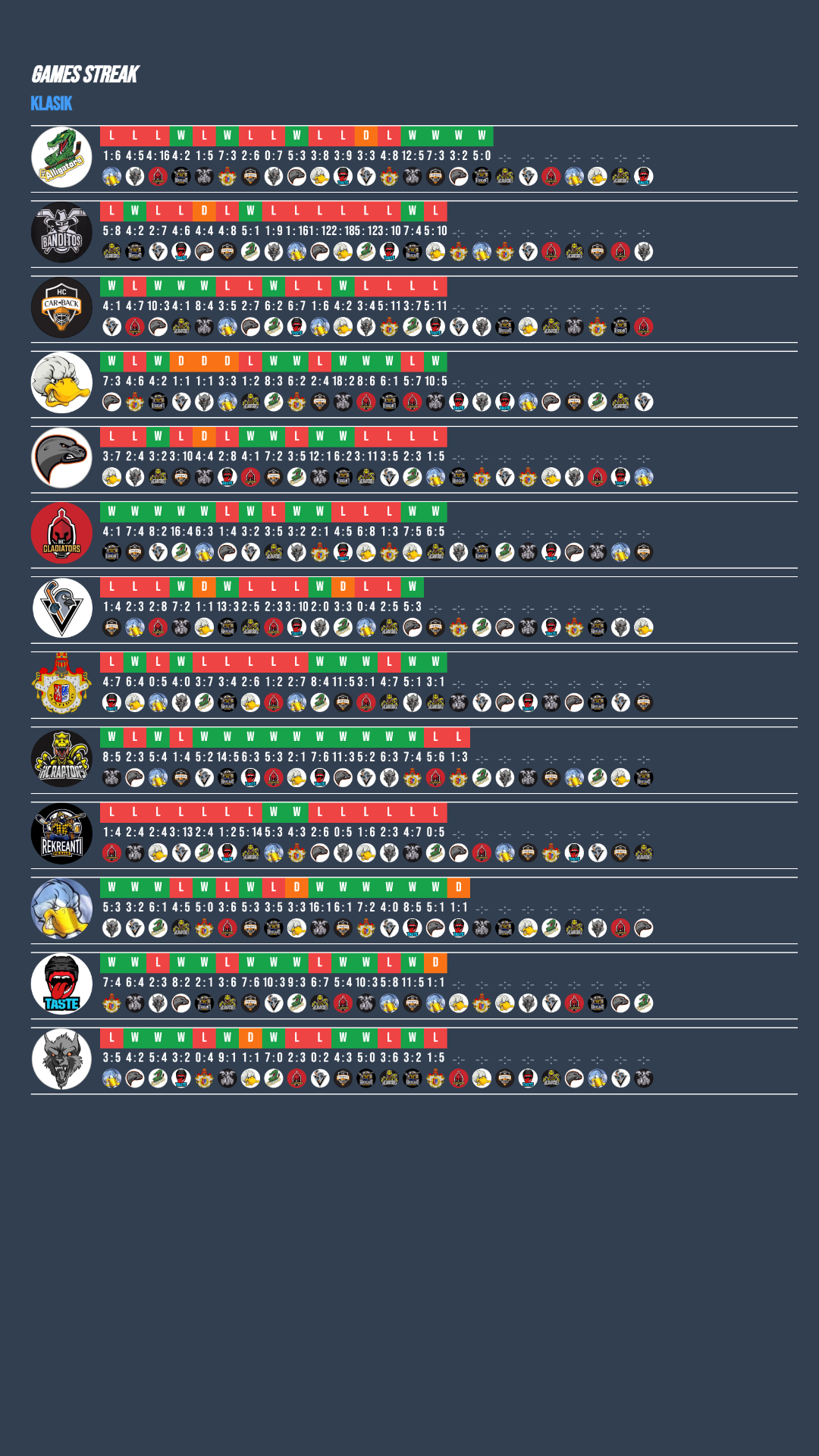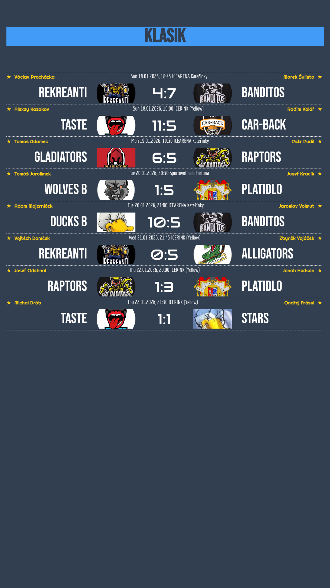 Banditos po šesti porážkách v řadě konečně prolomili smůlu, když si poradili s Rekreanty. O dva dny později ale narazili na Ducks B, kteří nic nepodcenili a nedovolili Banditos přidat druhou výhru v řadě. Taste po vysokém vítězství nad Car-Back čekal netradičně čtvrteční šlágr proti vedoucím Ducks Stars. Souboj týmů ze špičky klasik divize nabídl vyrovnanou podívanou a nakonec skončil dělbou bodů po remíze 1:1. Vedoucí Raptors po neuvěřitelné sérii deseti výher narazili. Gladiators jim půl minuty před koncem vystřelili porážku a Raptors následně ve čtvrtek nestačili ani na Platidlo, které si v tomto týdnu připsalo ještě jednu výhru a posouvá se tabulkou vzhůru! Na vítězné vlně zůstávají také Alligators, kteří jasně přehráli Rekreanty 5:0.