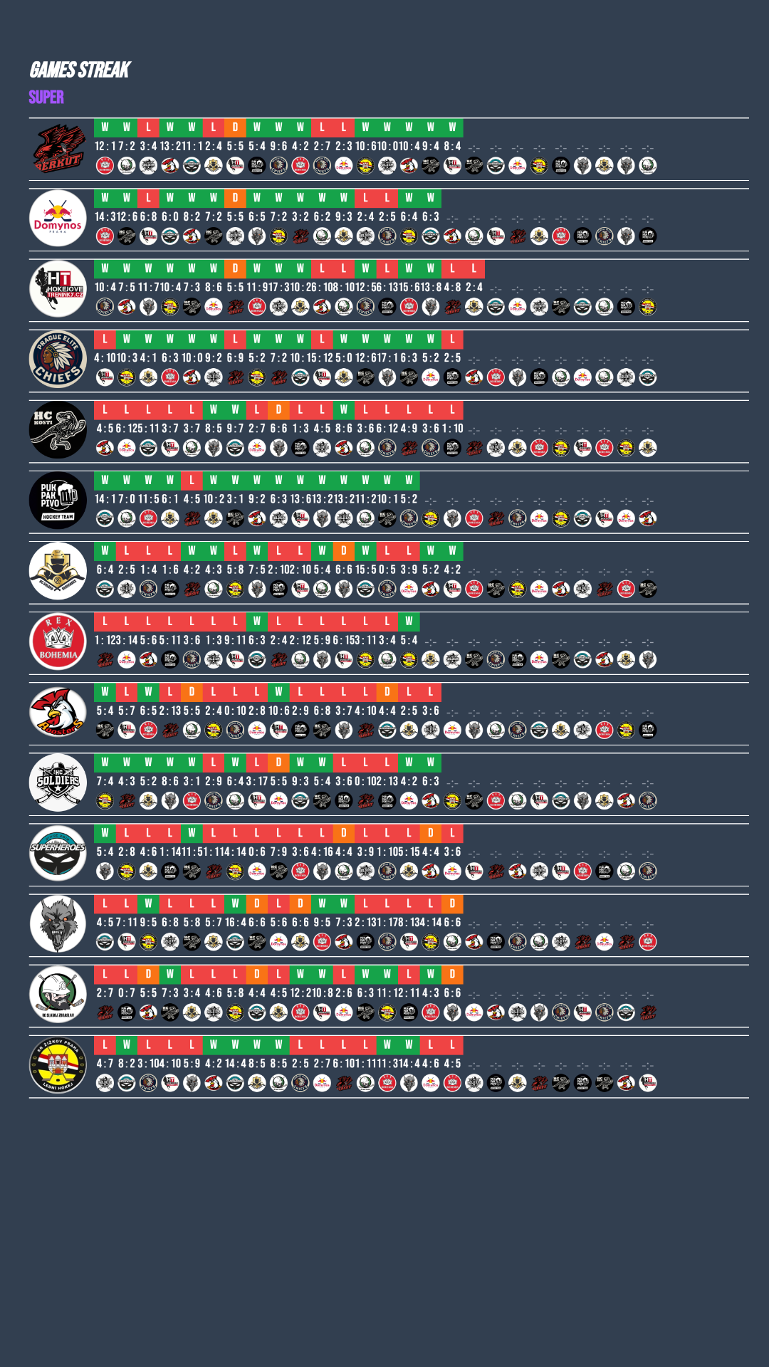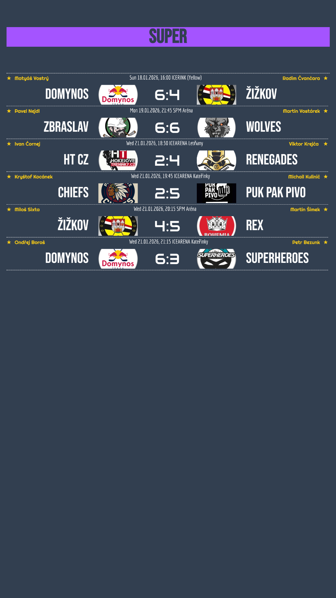 Domynos se po dvou porážkách dokázali zvednout a zapsali rovnou dvě vítězství, když si postupně poradili se Žižkovem a Superheroes. Zbraslav si body rozdělila s Wolves, zatímco Renegades ve vyhroceném utkání přetlačili Hokejové tréninky, který tak zaznamenaly už druhou porážku v řadě! Další emotivní bitvu nabídlo střetnutí dvou aktuálně nejlepších týmů super divize, ze kterého nakonec vyšel vítězně lépe postavený PUK PAK PIVO. Radost zavládla také u REX, který se po šesti porážkách v řadě konečně dočkal vítězství, když v těsném zápase přemohl Žižkov 5:4!