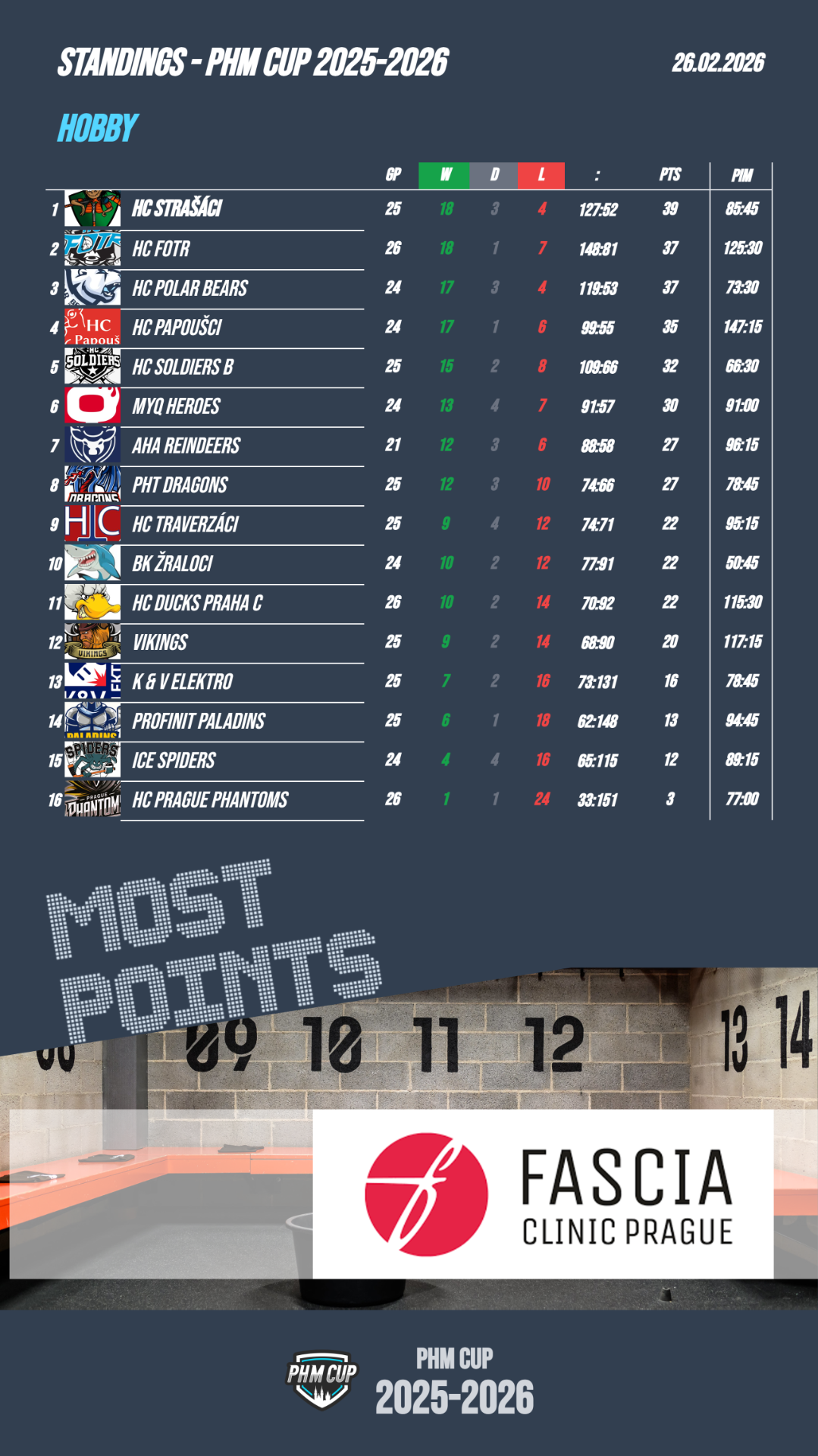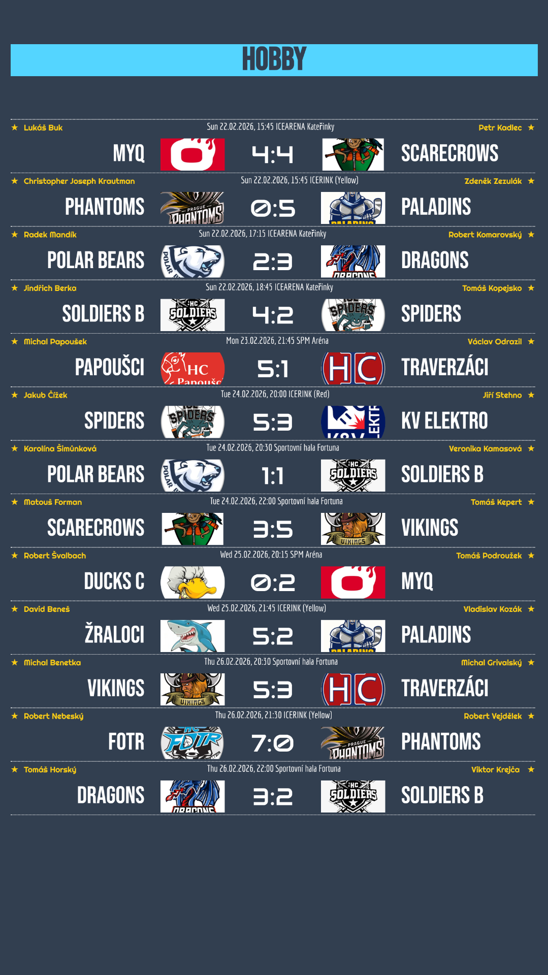 Hobby divize má za sebou mimořádně nabitý týden. Odehrálo se rekordních 13 zápasů, které výrazně zamíchaly tabulkou i aktuální formou týmů. Skvělý týden prožili Dragons, kteří slaví dvě cenné výhry. Nejprve zvládli těžký duel s Polar Bears a následně si poradili i se Soldiers B. Velké překvapení přinesli Vikings. Ti senzačně přehráli dosud vedoucí Strašáky a stejným výsledkem 5:3 si následně poradili i s Traverzáky! Defenzivně laděné výkony předvedli Paladins, MyQ i Fotr. Všechny tři týmy dokázaly vynulovat své soupeře a pomohly svým brankářům k čistému kontu!