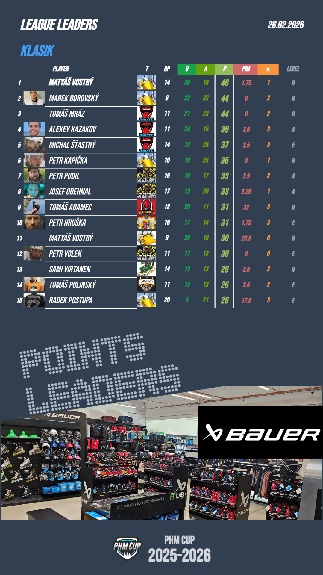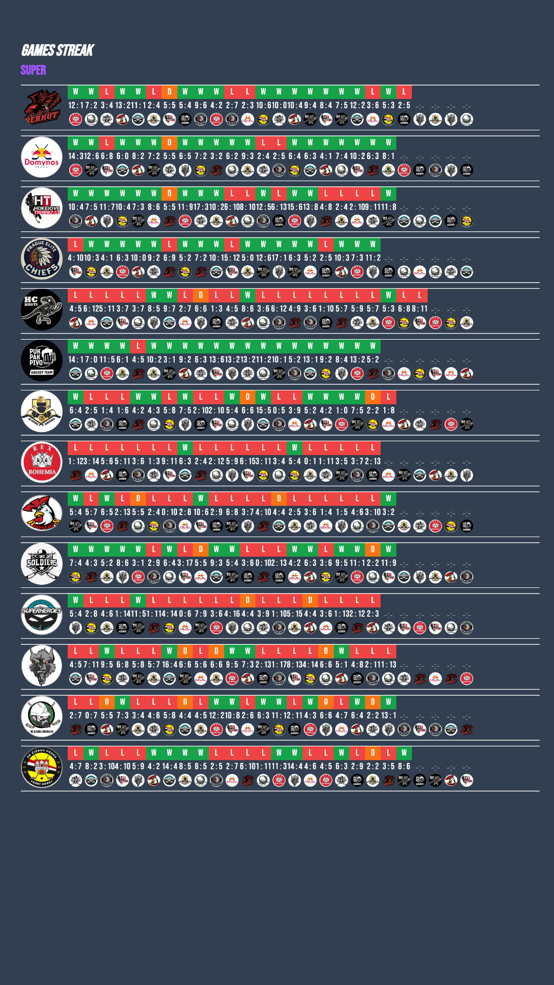 Domynos byli tento týden nekompromisní a připsali si dvě cenné výhry. Postupně přehráli Renegades i REX a potvrdili, že jejich forma před závěrem základní části graduje! Ofenzivní smršť předvedla Zbraslav, která nasázela Wolves hned 13 branek a jasně ukázala svou útočnou sílu. Naopak Kosti nenavázali na vítězství z minulého týdne a tentokrát se museli smířit se dvěma porážkami. Rozjeté PUK PAK PIVO znovu potvrdilo svou dominanci, když přehrálo Berkut 5:2 a dál drží pevnou pozici na vrcholu tabulky!