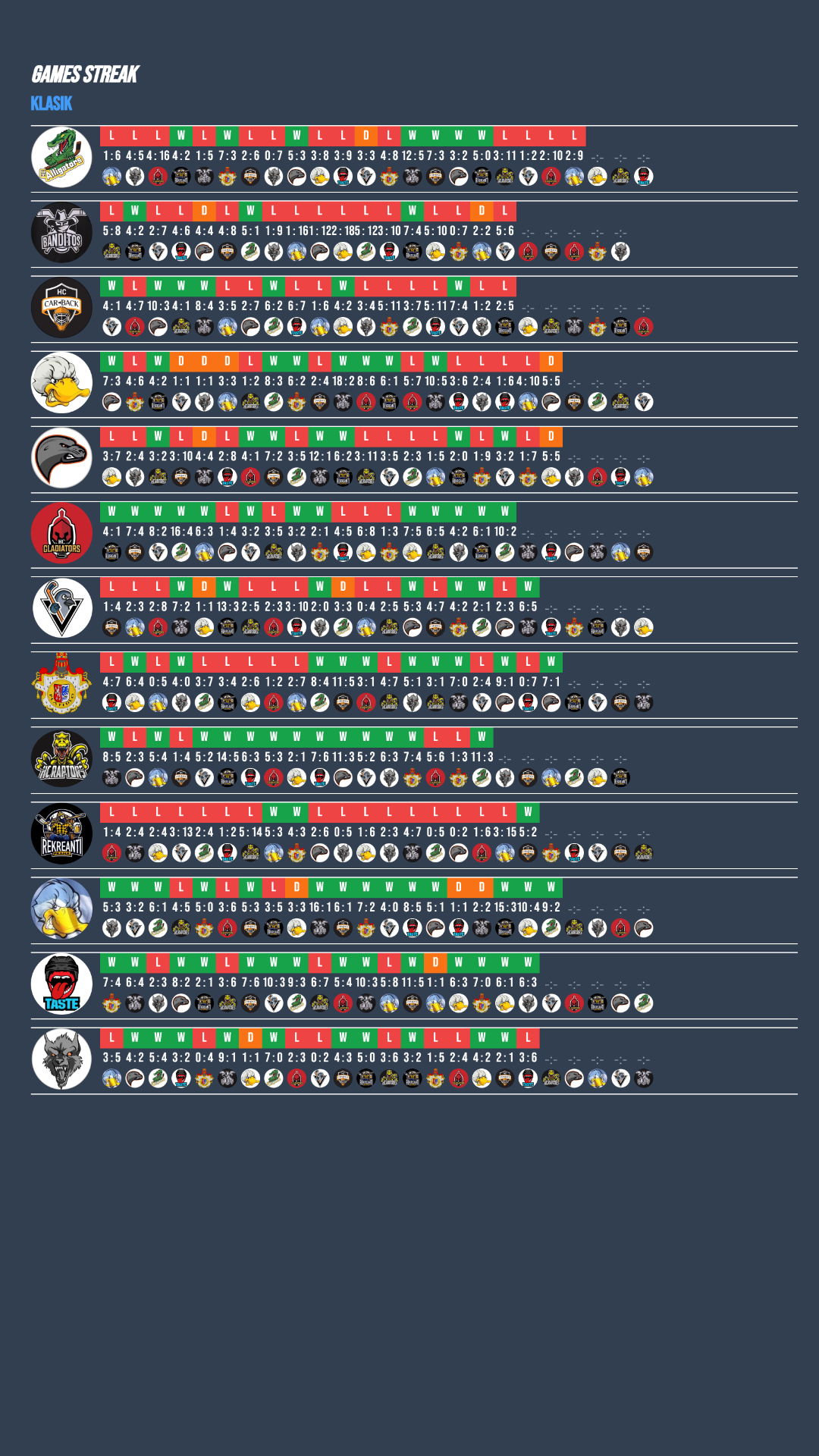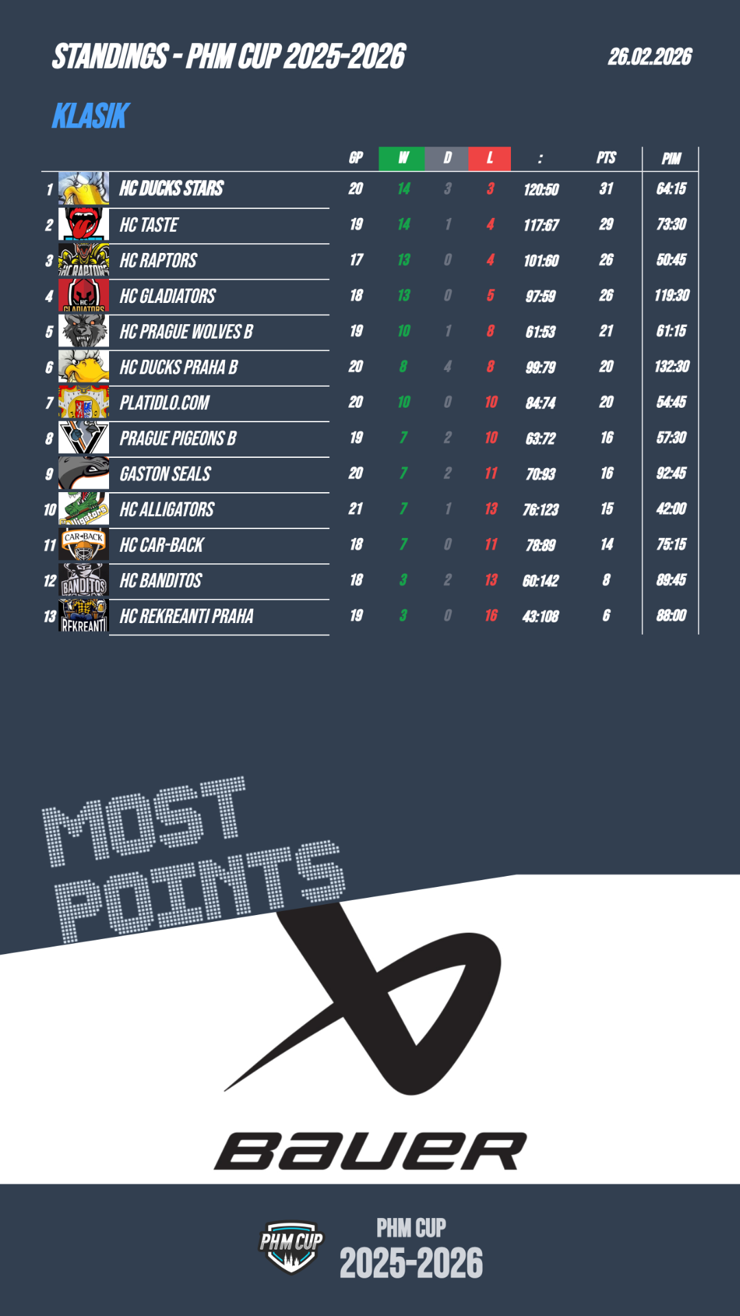 Taste potvrdili svou formu a po zvládnutém utkání proti Wolves B si připisují už čtvrtou výhru v řadě. Velmi vyrovnaný duel přinesl zápas mezi Pigeons B a Banditos. Přestřelka nakonec vyzněla lépe pro Pigeons B, kteří zvítězili těsně 6:5 a odnesli si cenné body. Souboj mezi Gastony a B týmem Ducks skončil smírně, když si oba celky rozdělily body po remíze. O výrazný ofenzivní výkon se postarali Ducks Stars, kteří nasázeli Alligators devět branek a znovu ukázali svou útočnou sílu!