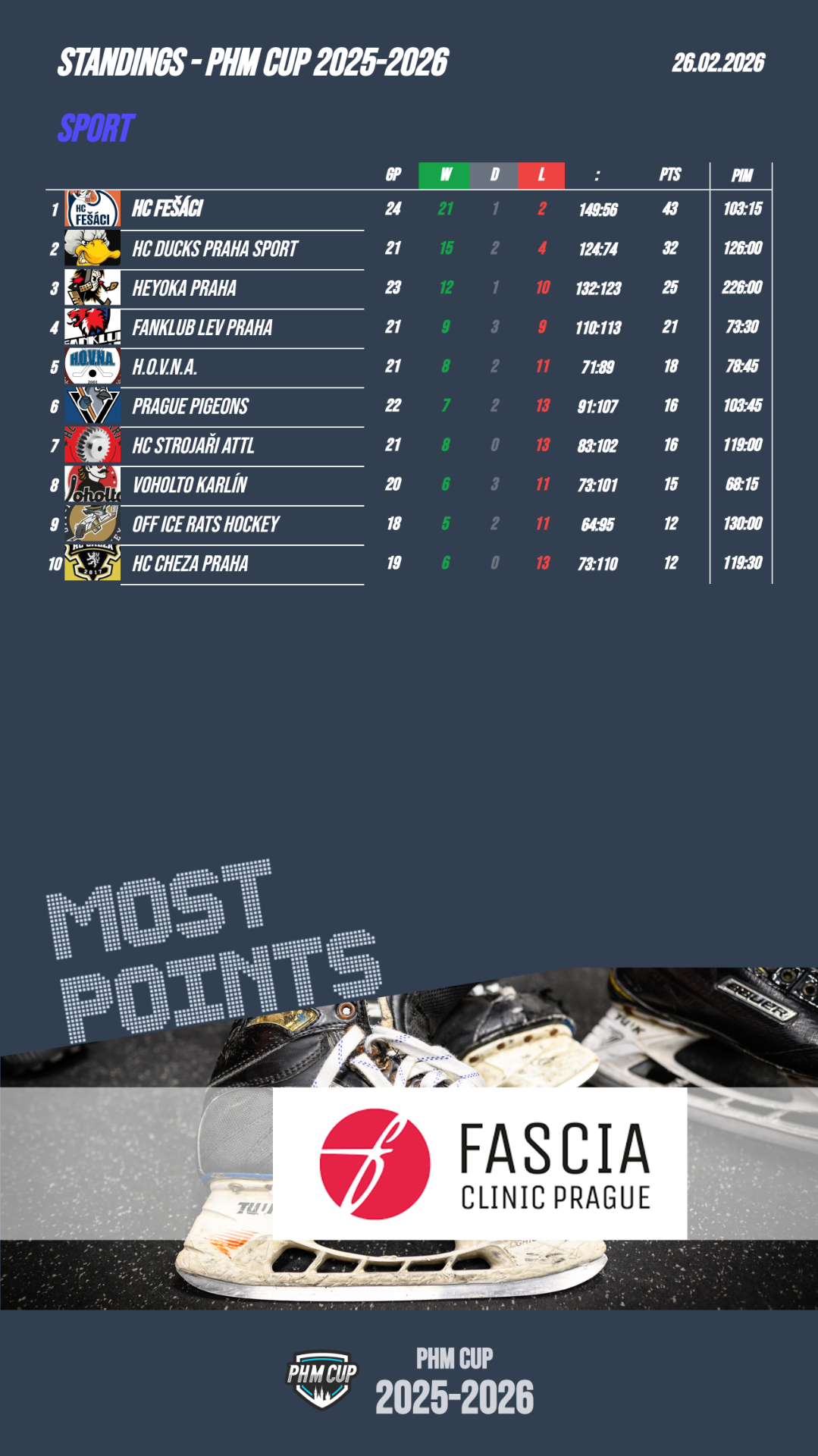 Cheza po cenném vítězství nad Fešáky z minulého týdne zůstala při chuti a tentokrát jasně přehrála Heyoku 10:3. Vyrovnaný souboj nabídlo utkání mezi H.O.V.N.A. a Fanklubem Lev, které skončilo dělbou bodů. Fanklub Lev však měl na programu ještě jeden zápas, ve kterém nestačil na silné Fešáky. Radost ze zisku bodů mají také Off Ice Rats, kteří po delší době slaví vítězství. Ve vypjatém utkání dokázali přehrát Voholto 4:1 a zapsali důležité body do tabulky!