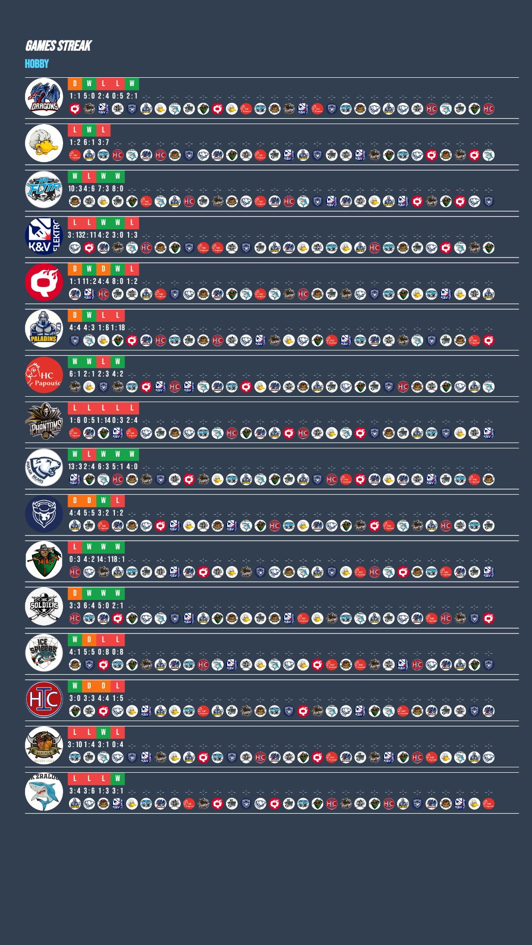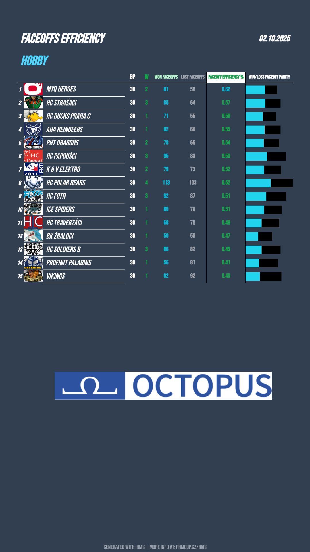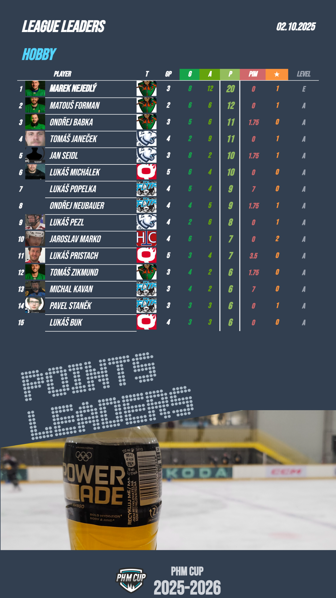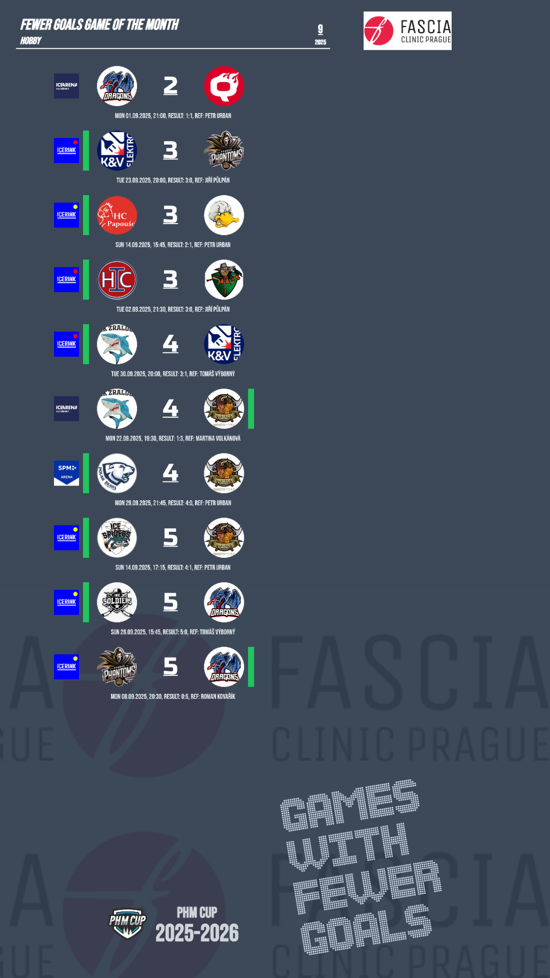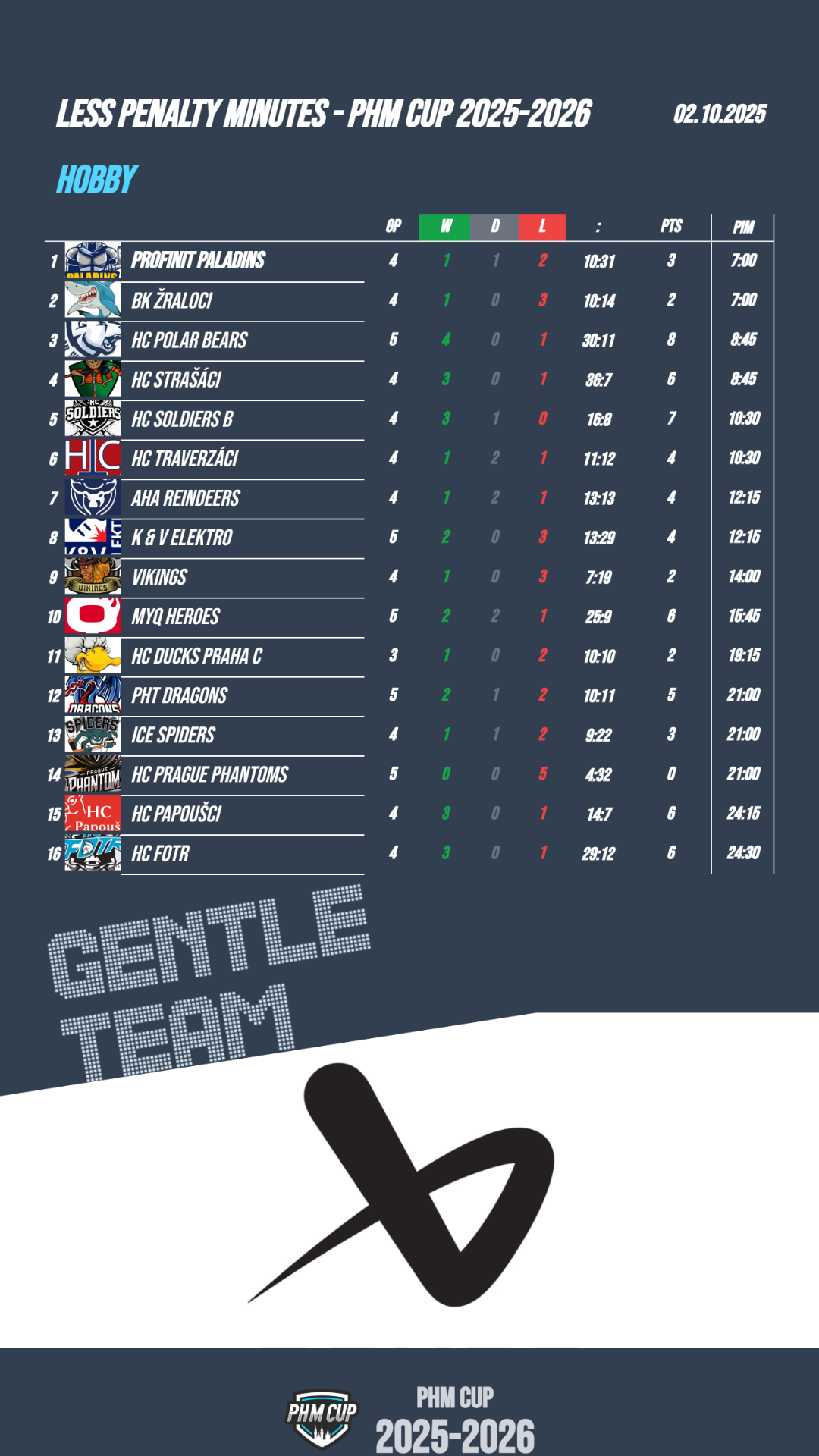 Na špici tabulky září Polar Bears se čtyřmi výhrami z pěti zápasů. Výborně hrají také Soldiers B, kteří ještě neprohráli. Třetí místo okupují srovnatelně výkonné týmy: Strašáci, Fotr a Papoušci – všichni se 6 body. Naopak se zatím nedaří Phantoms, kteří v pěti zápasech ještě nebodovali. Ducks C, Žraloci a Vikings mají shodně jen po jedné výhře.