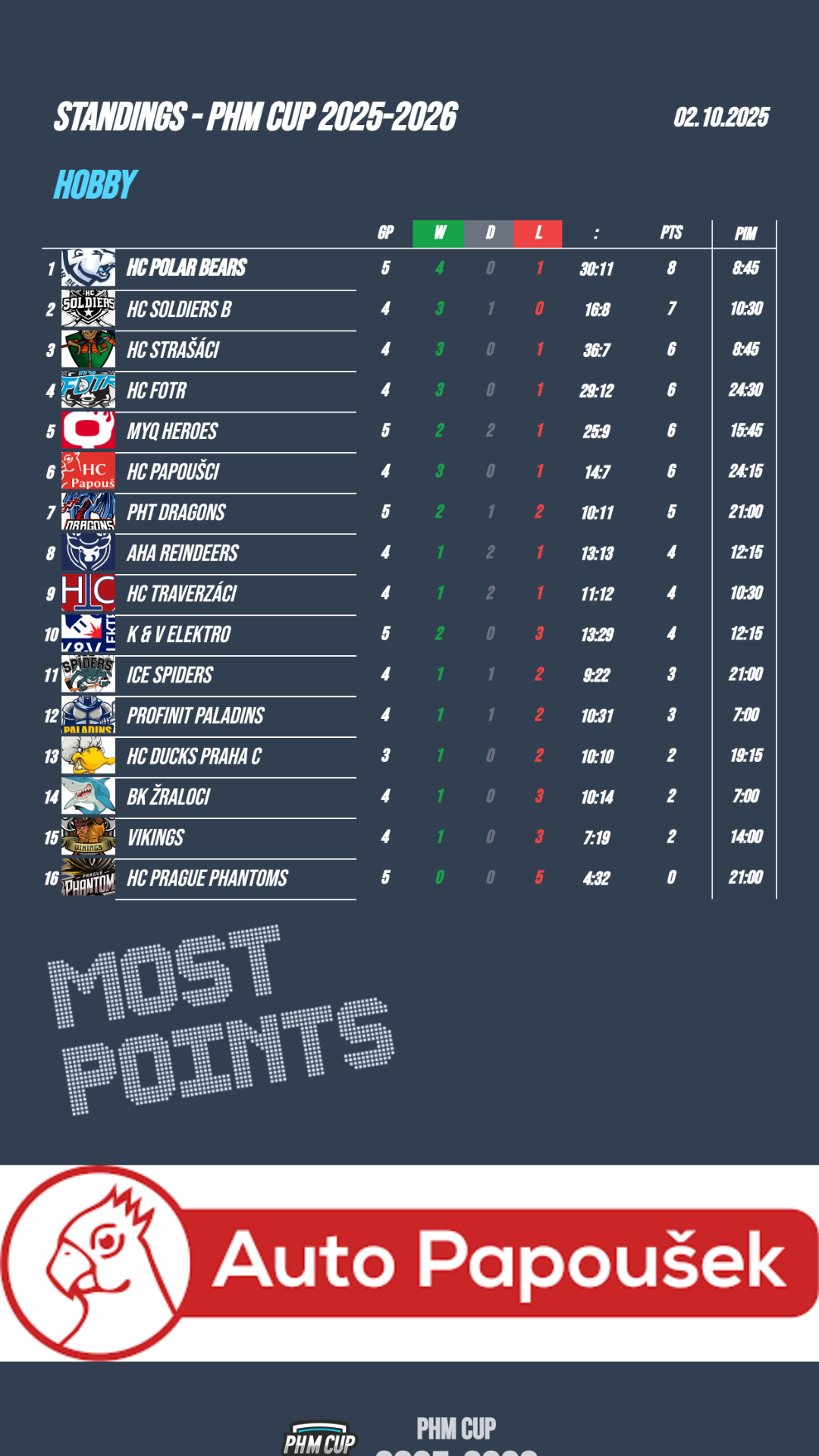 🚗 POŘADÍ TÝMŮ AUTO PAPOUŠEK STANDINGS
