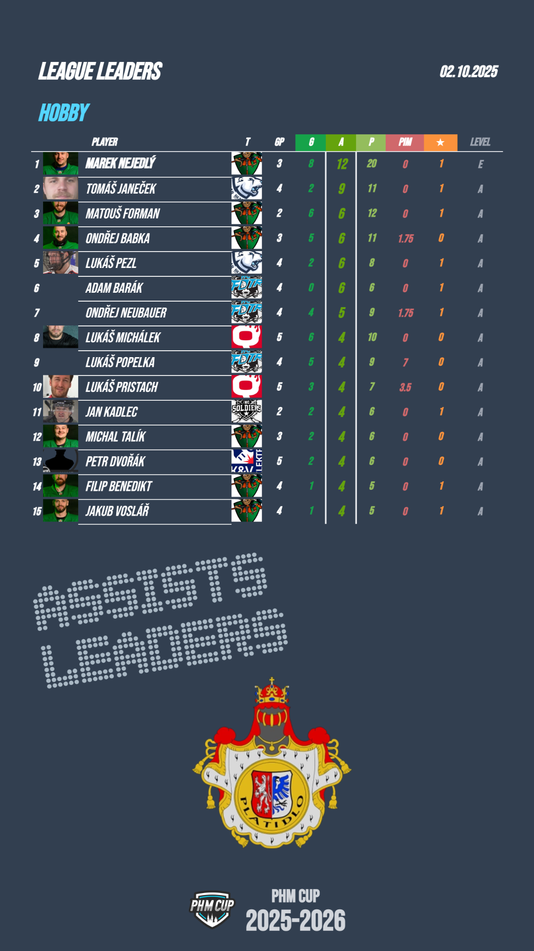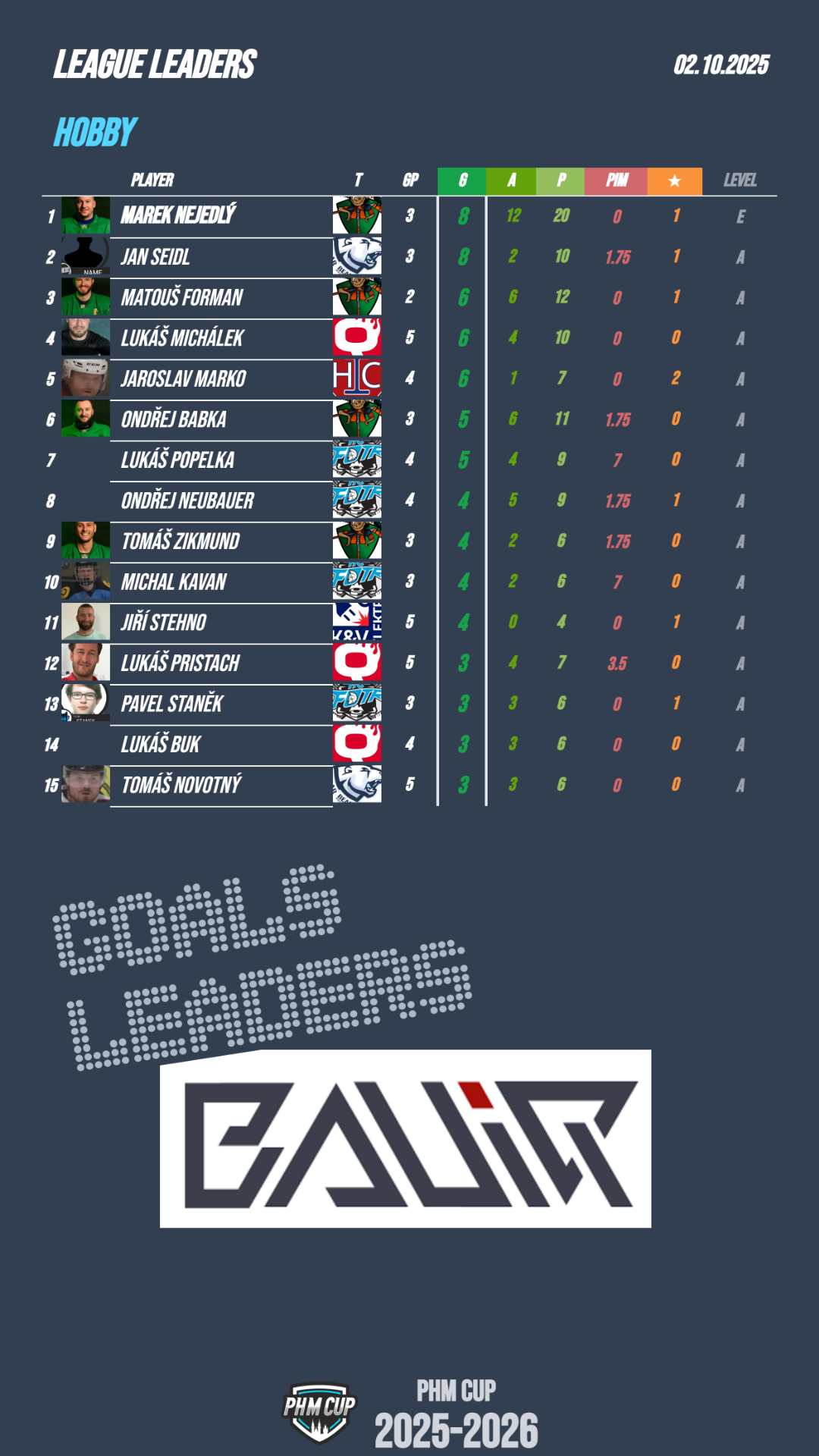 Skvěle zatím brání svou branku Tichý ze Strašáků průměr přesně jeden gol na zápas, nebo pod dvě branky jsou dokonce Švalbach z Ducks C nebo Matoušek z Polar Bears a 1,5 má ještě Chovanec z MyQ Heroes.