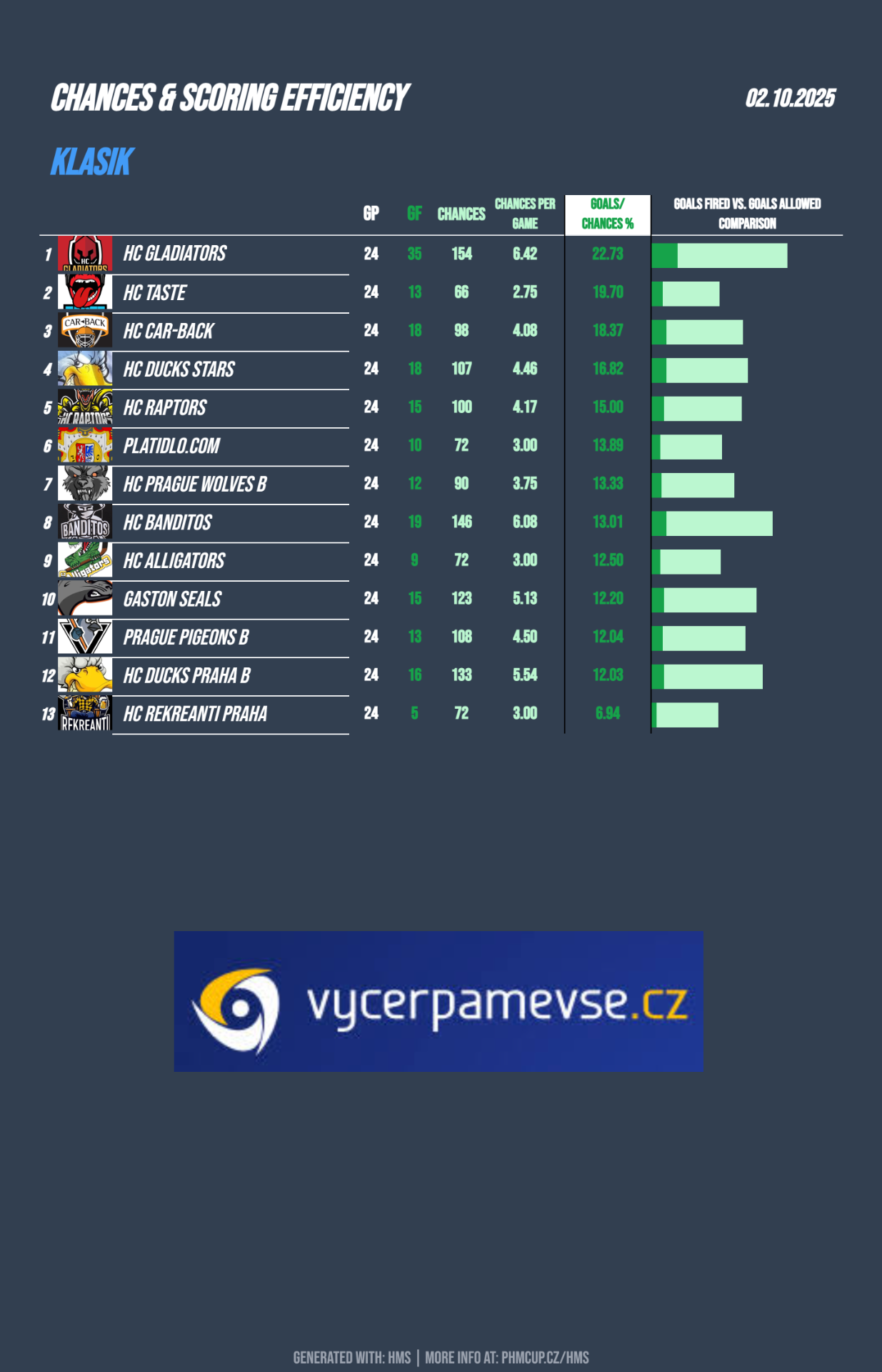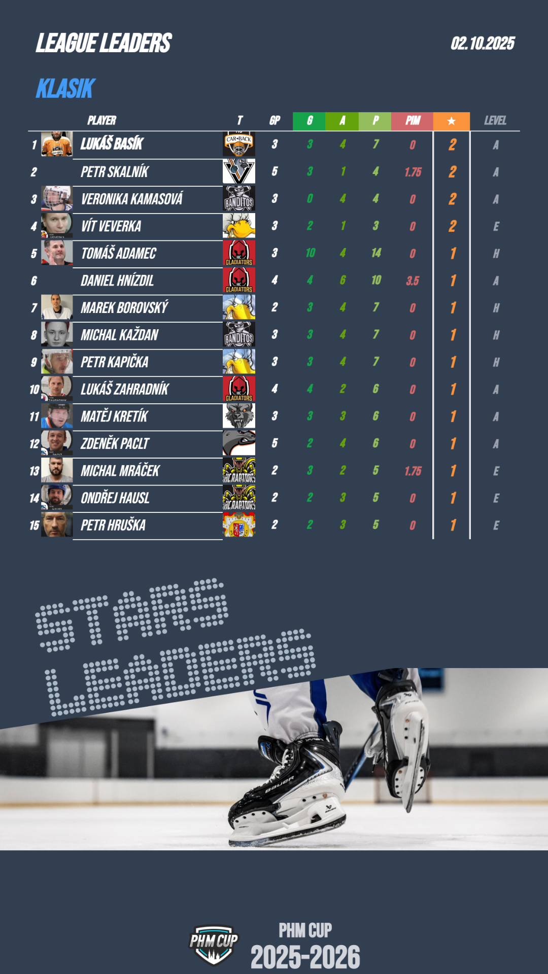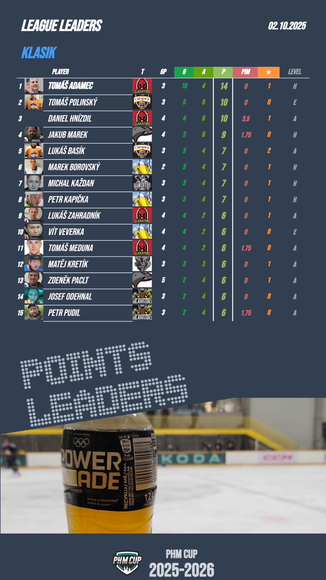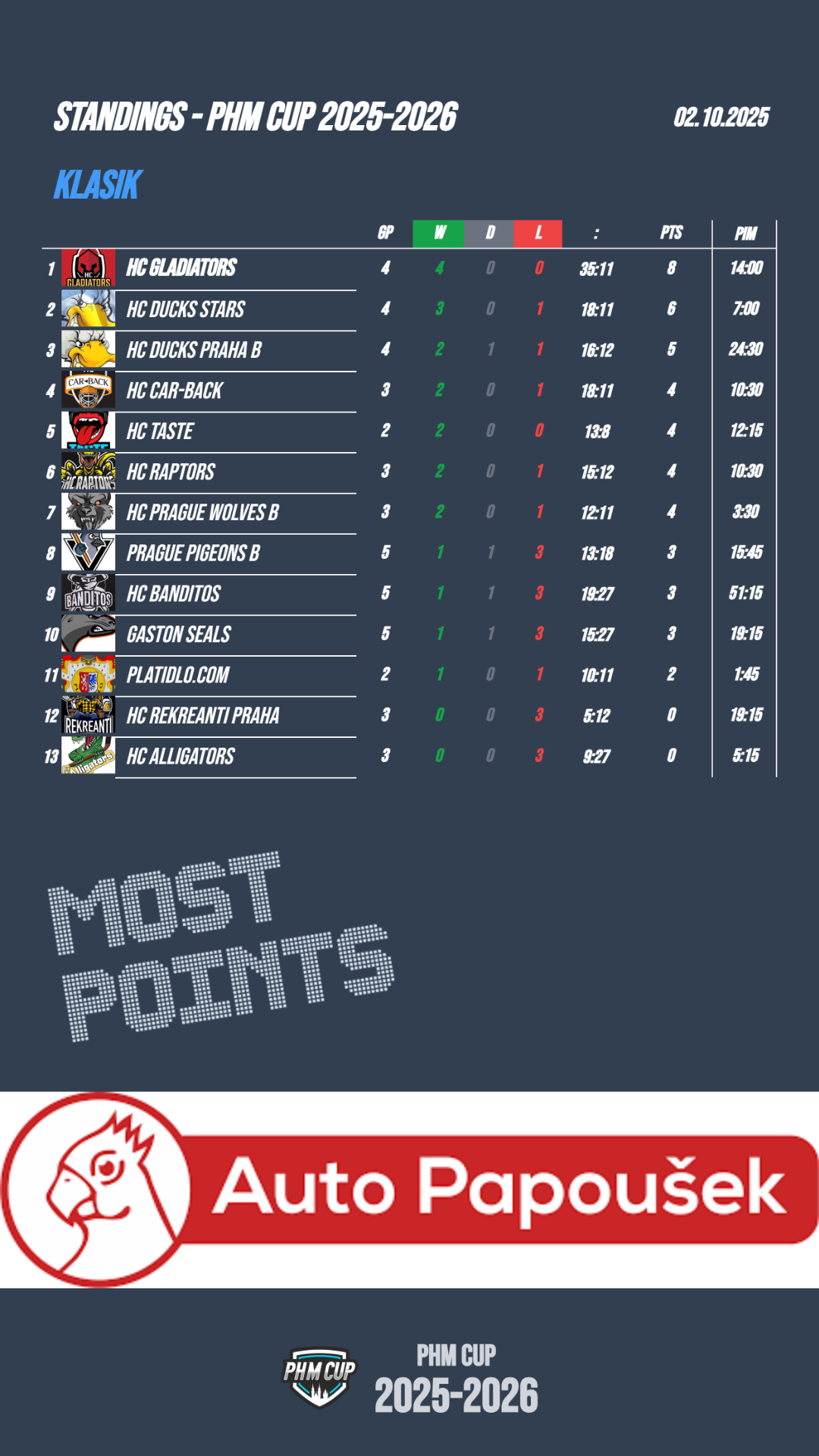 HC Gladiators vlétli do sezony jako tank – čtyři zápasy, čtyři výhry, 8 bodů. Skvělý start má i Ducks Stars, kteří mají o jednu výhru méně. Zajímavé bude sledovat Taste, který má 100% bilanci, ale zatím odehrál jen dva zápasy. Na opačném konci tabulky se krčí Rekreanti a Alligators, zatím bez bodu.
