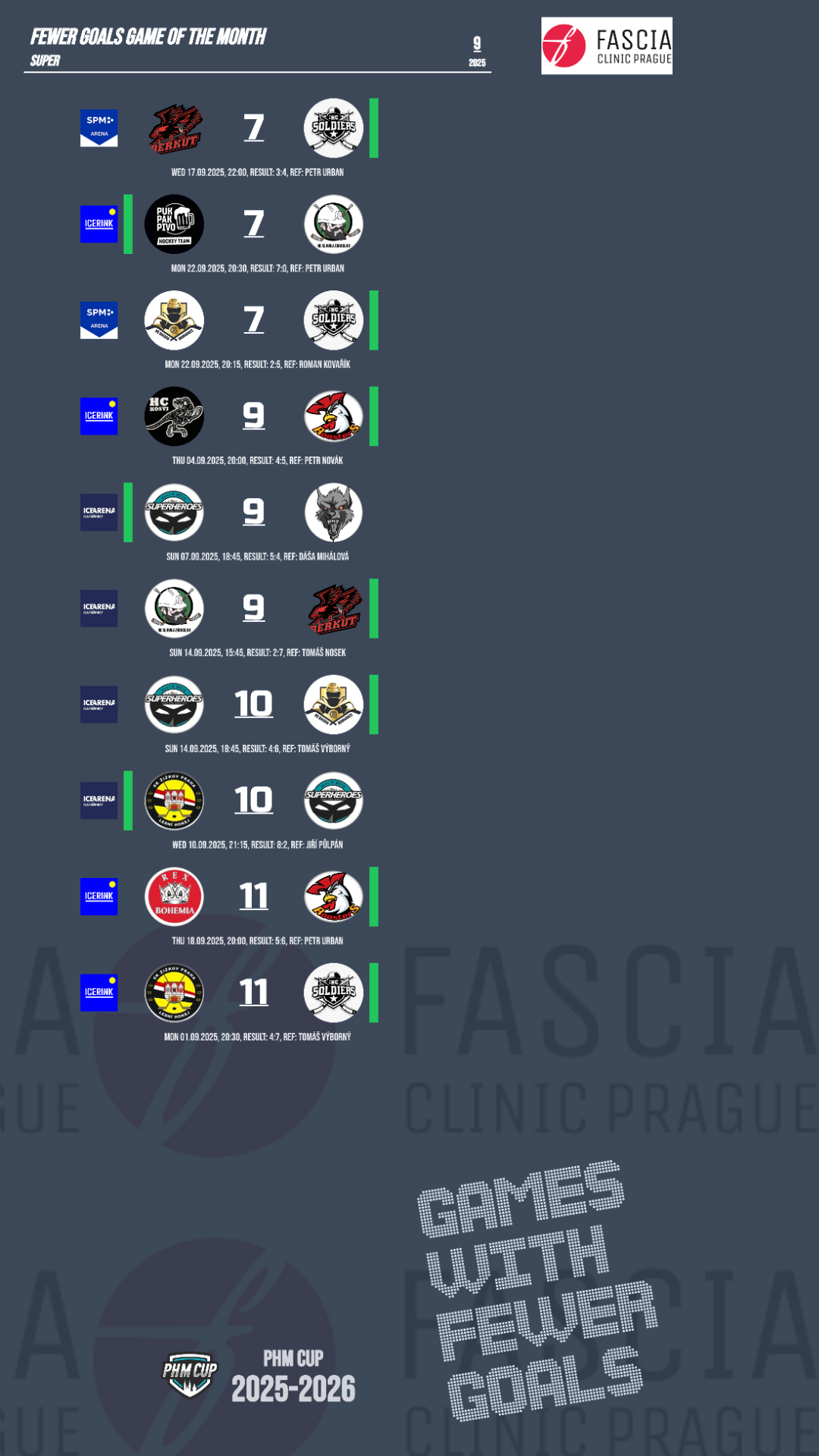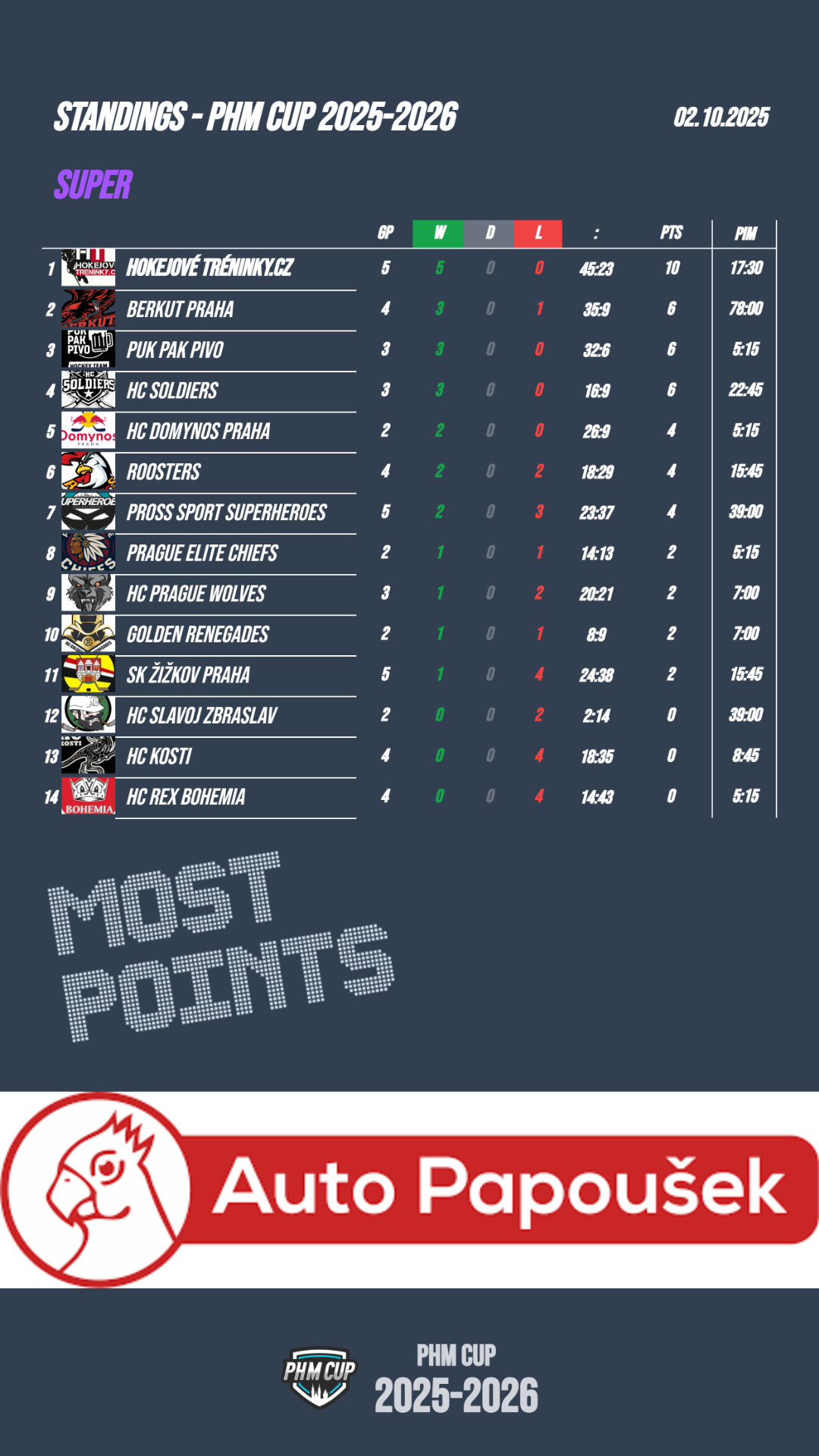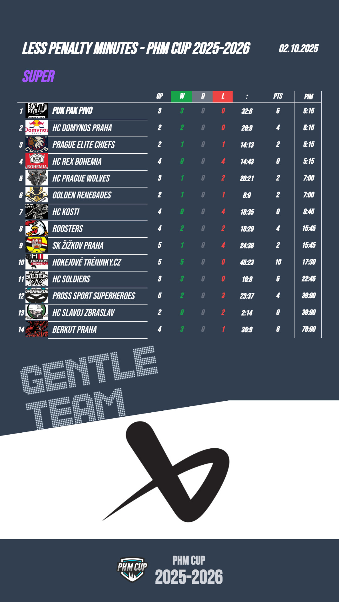 Suverénním lídrem září jsou Hokejové Tréninky.CZ – pět zápasů, pět výher, plný počet bodů. Potvrzují roli favorita i ofenzivní sílu. V závěsu je úřadující mistr Berkut a stoprocentní nováček PUK PAK PIVO. Velmi příjemným překvapením jsou HC Soldiers – tři výhry ze tří utkání. Naopak Rex a Kosti se zatím hledají, Žižkov zatím nenaplňuje očekávání.