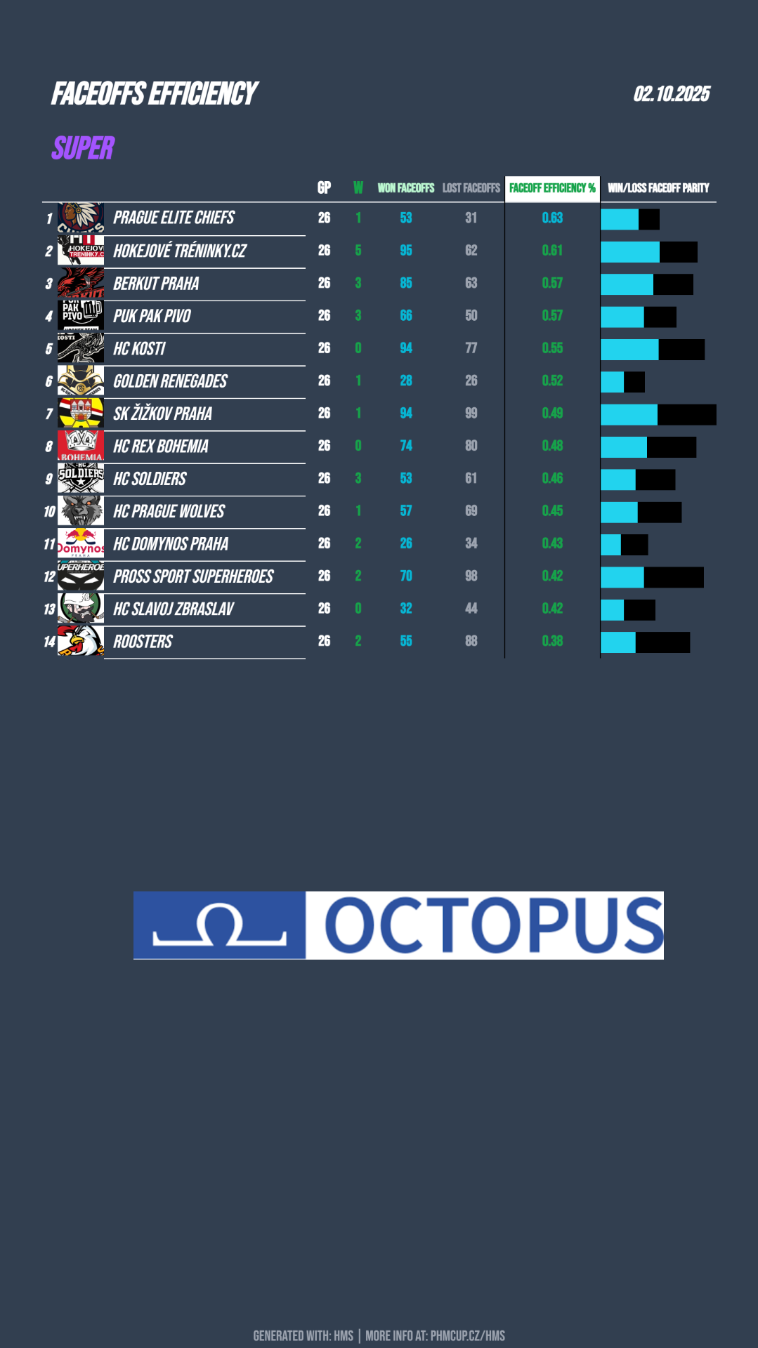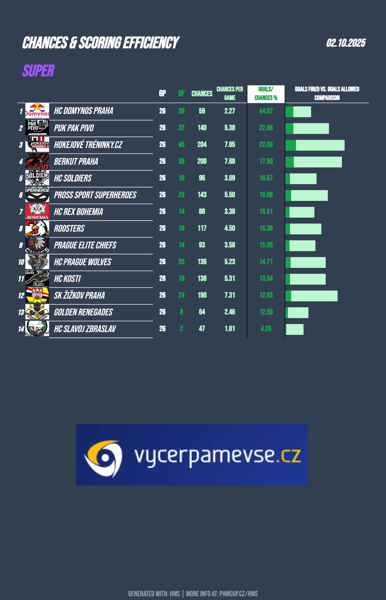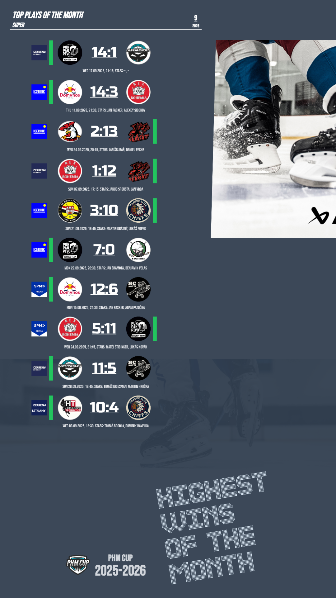 Suverénním lídrem září jsou Hokejové Tréninky.CZ – pět zápasů, pět výher, plný počet bodů. Potvrzují roli favorita i ofenzivní sílu. V závěsu je úřadující mistr Berkut a stoprocentní nováček PUK PAK PIVO. Velmi příjemným překvapením jsou HC Soldiers – tři výhry ze tří utkání. Naopak Rex a Kosti se zatím hledají, Žižkov zatím nenaplňuje očekávání.